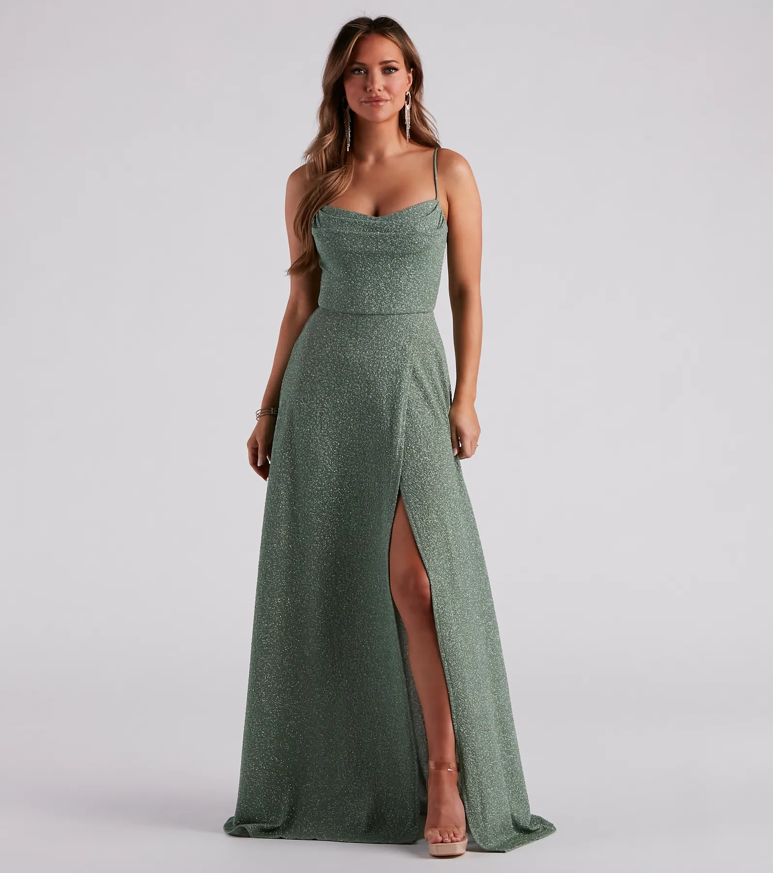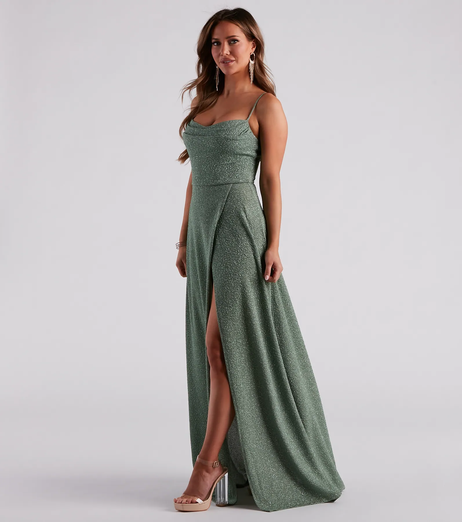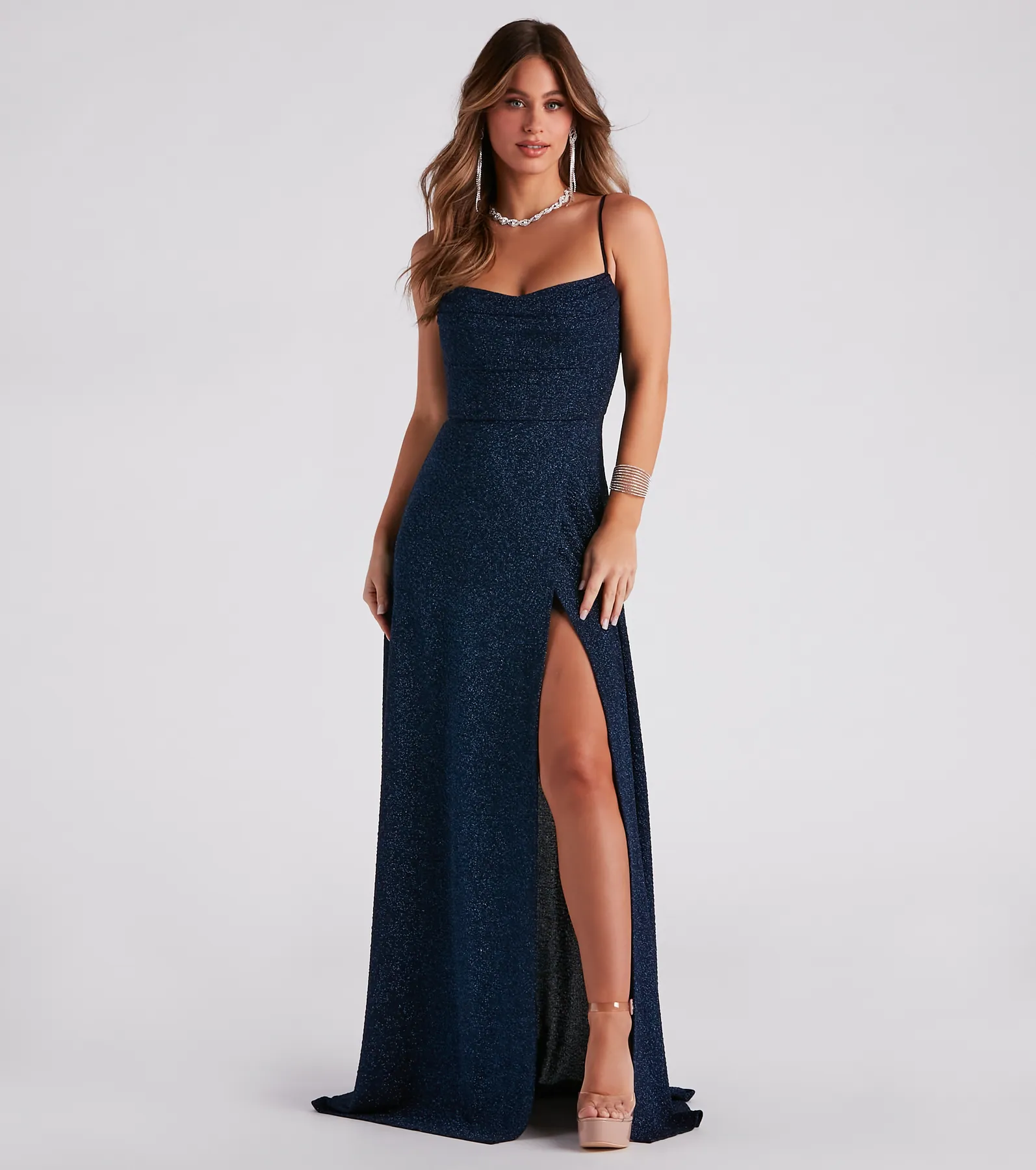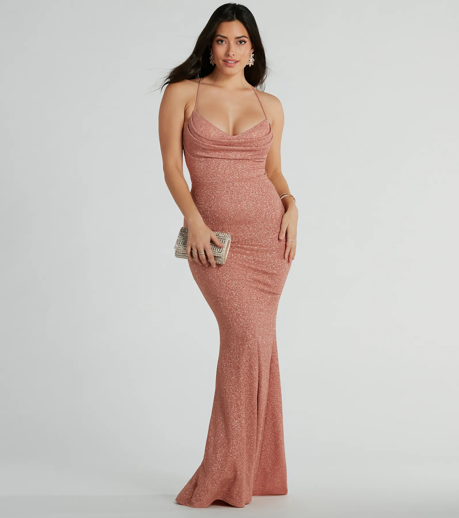 Chelsea Cowl Neck Lace-Up Mermaid Glitter Dress
