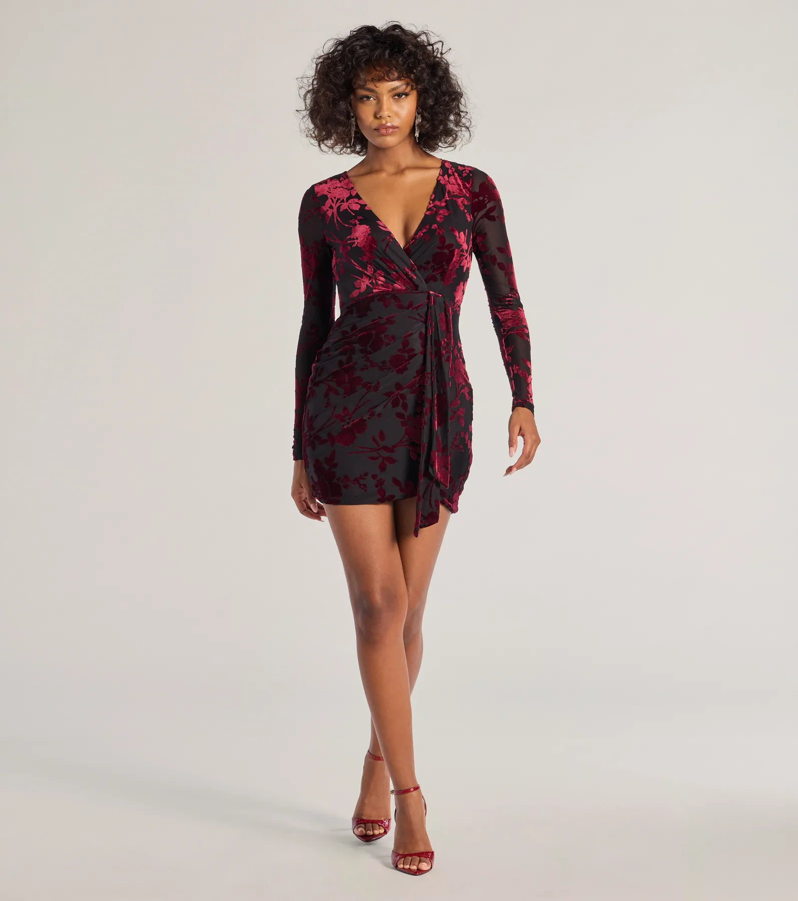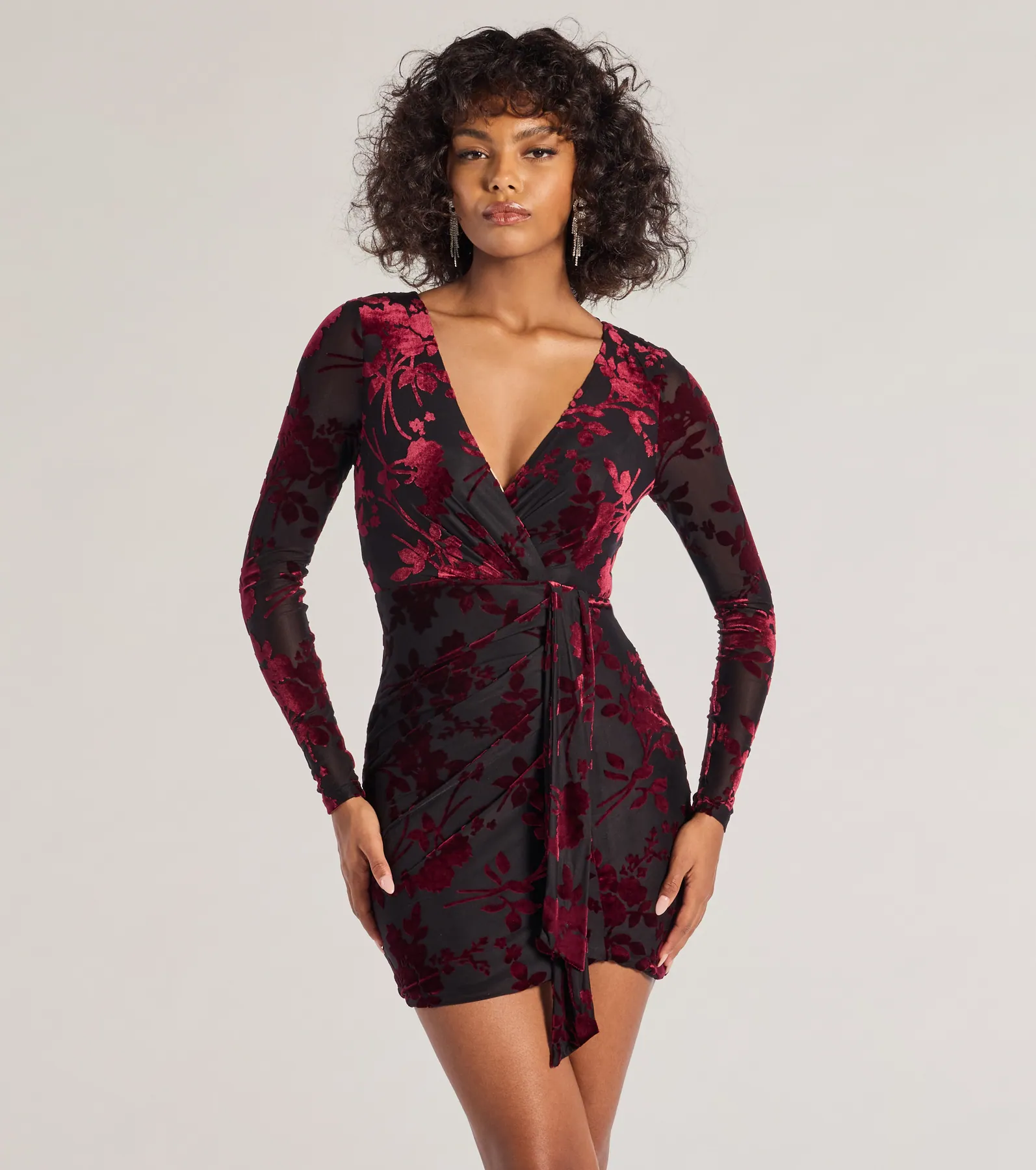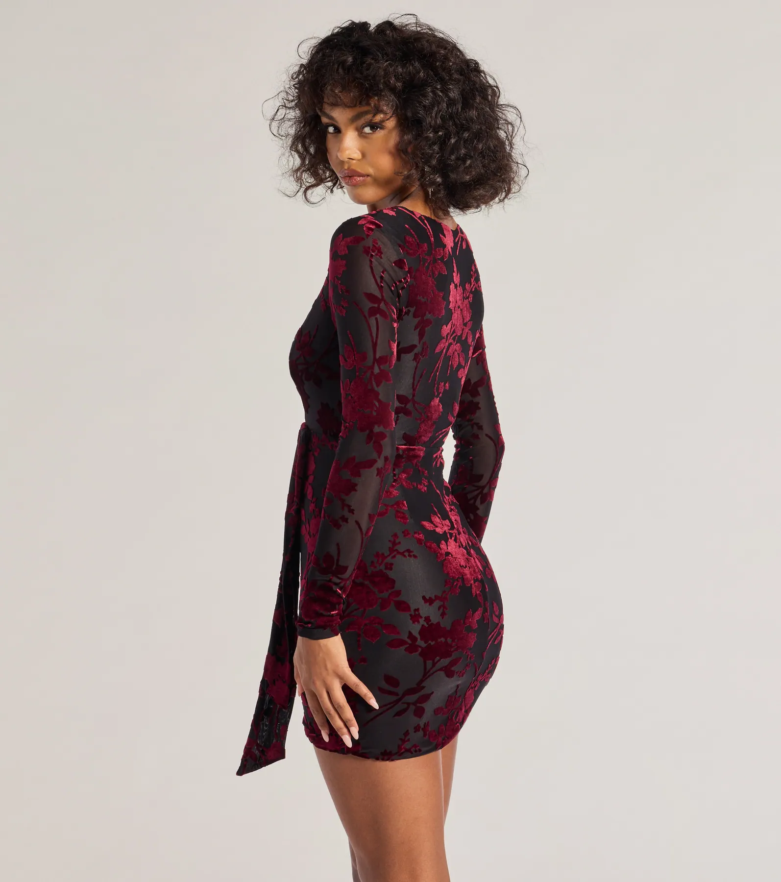 Vision In Velvet Pattern V-Neck Tie Mini Dress