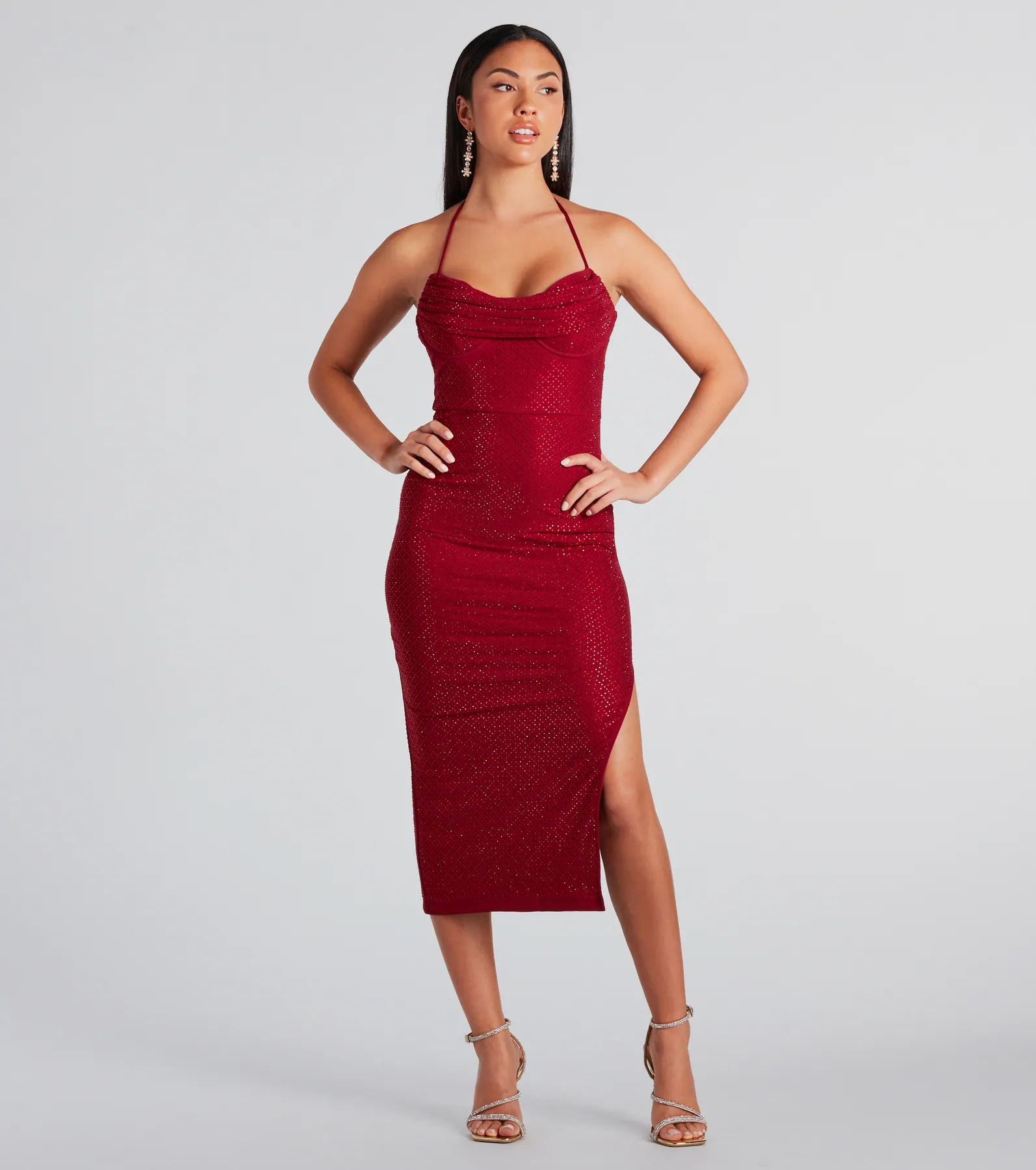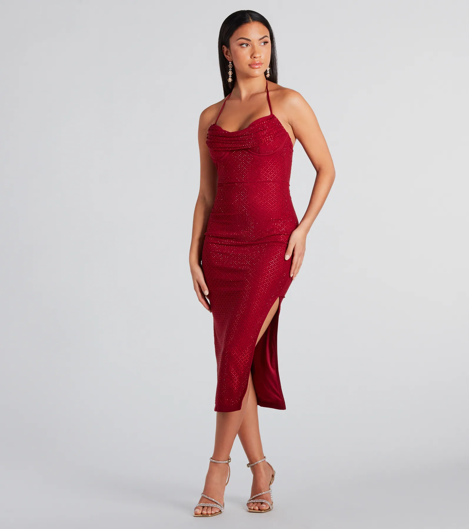 Josie Formal Rhinestone Cowl Halter Midi Dress
