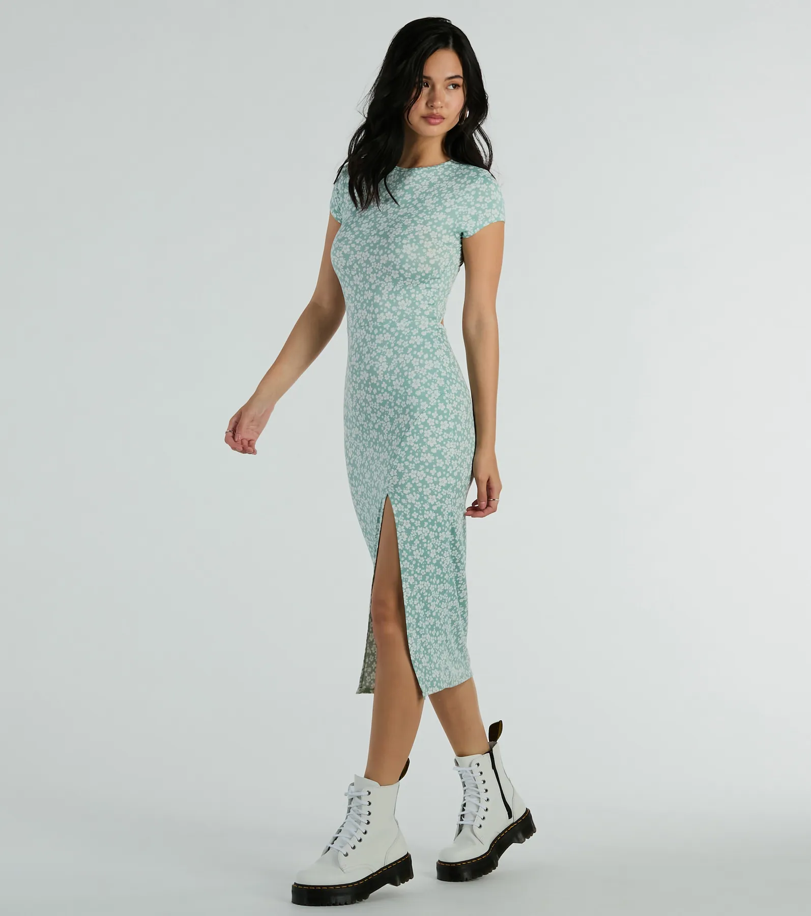 Spring Fling High Slit Ditsy Floral Knit Midi Dress