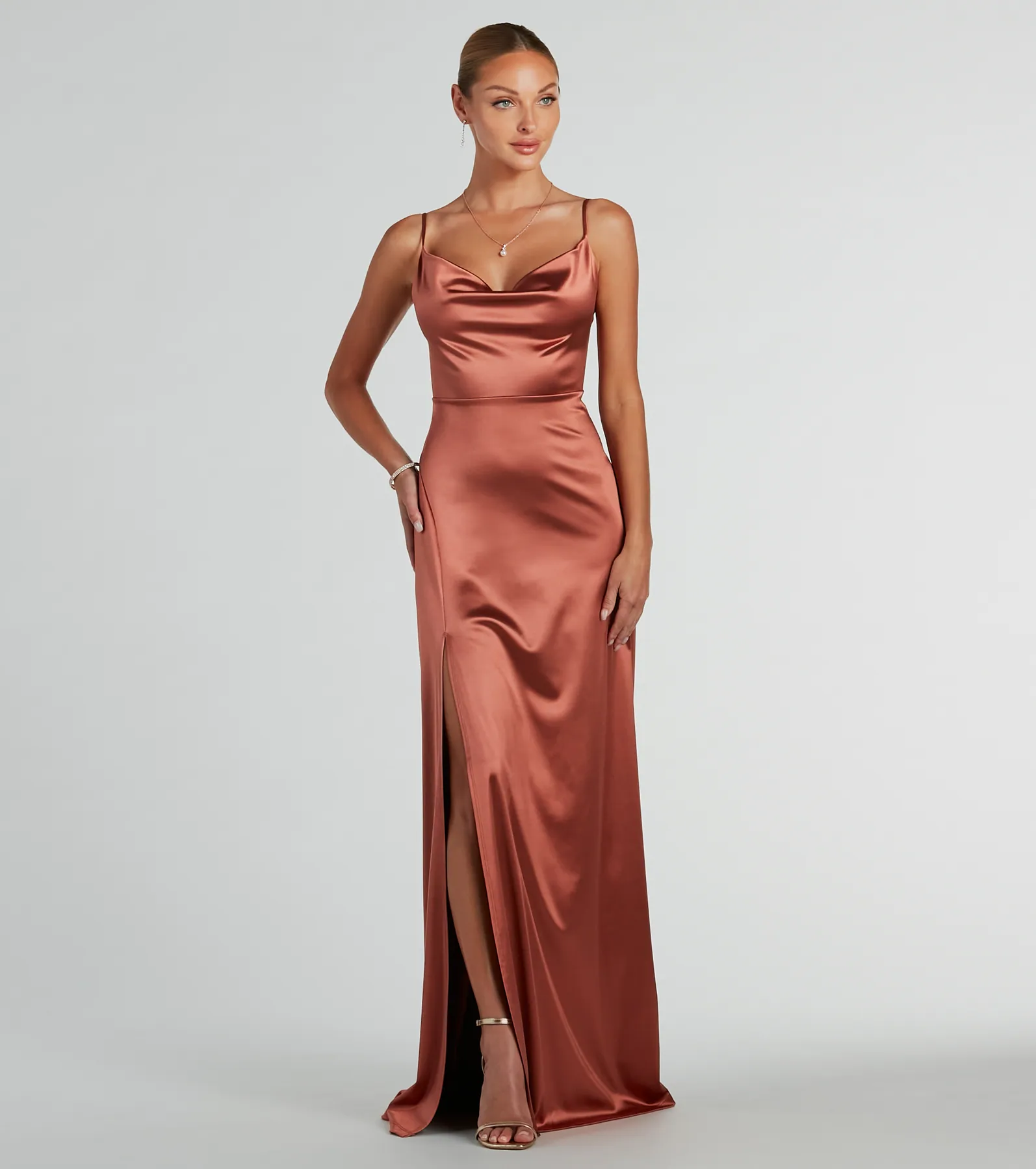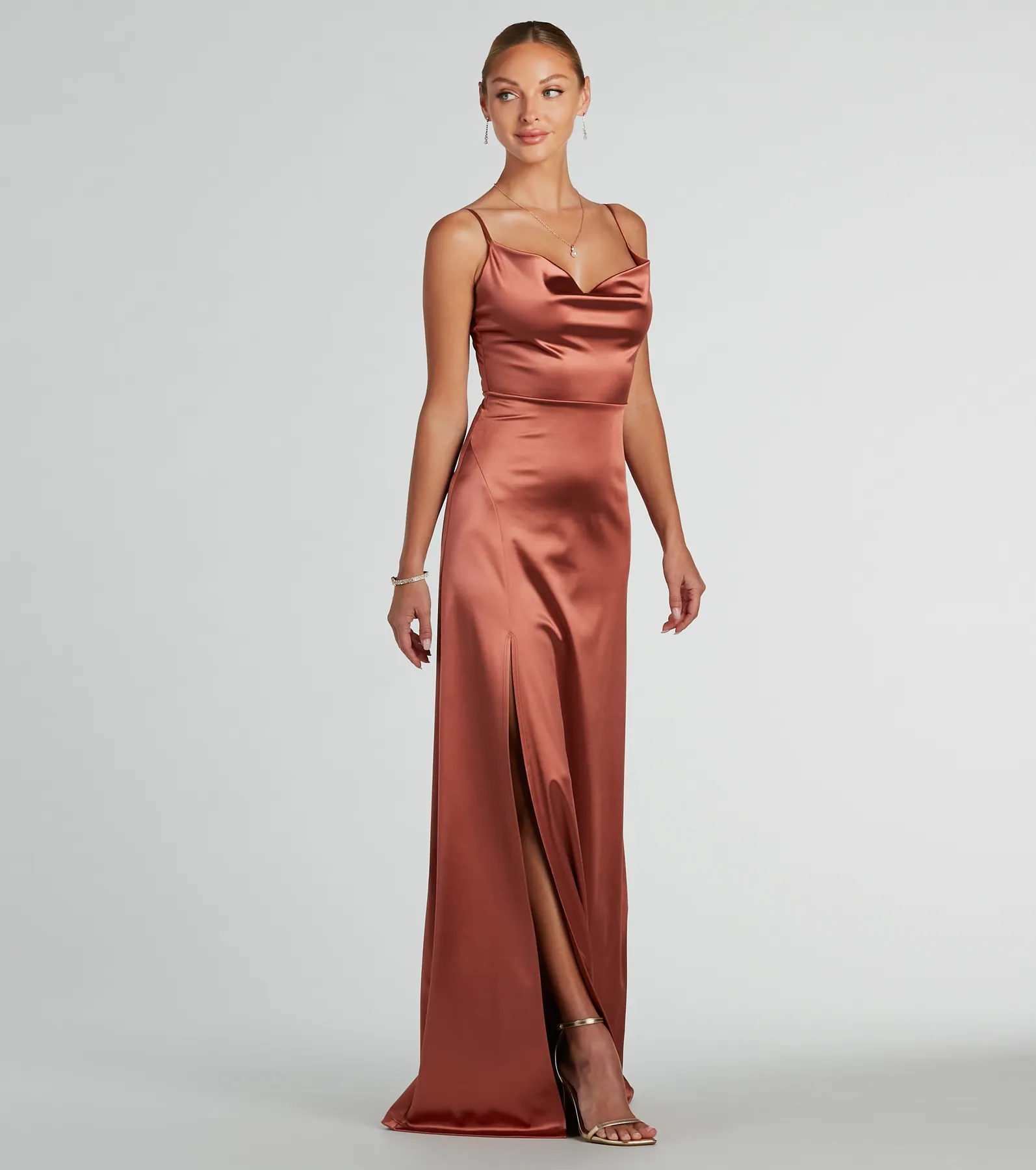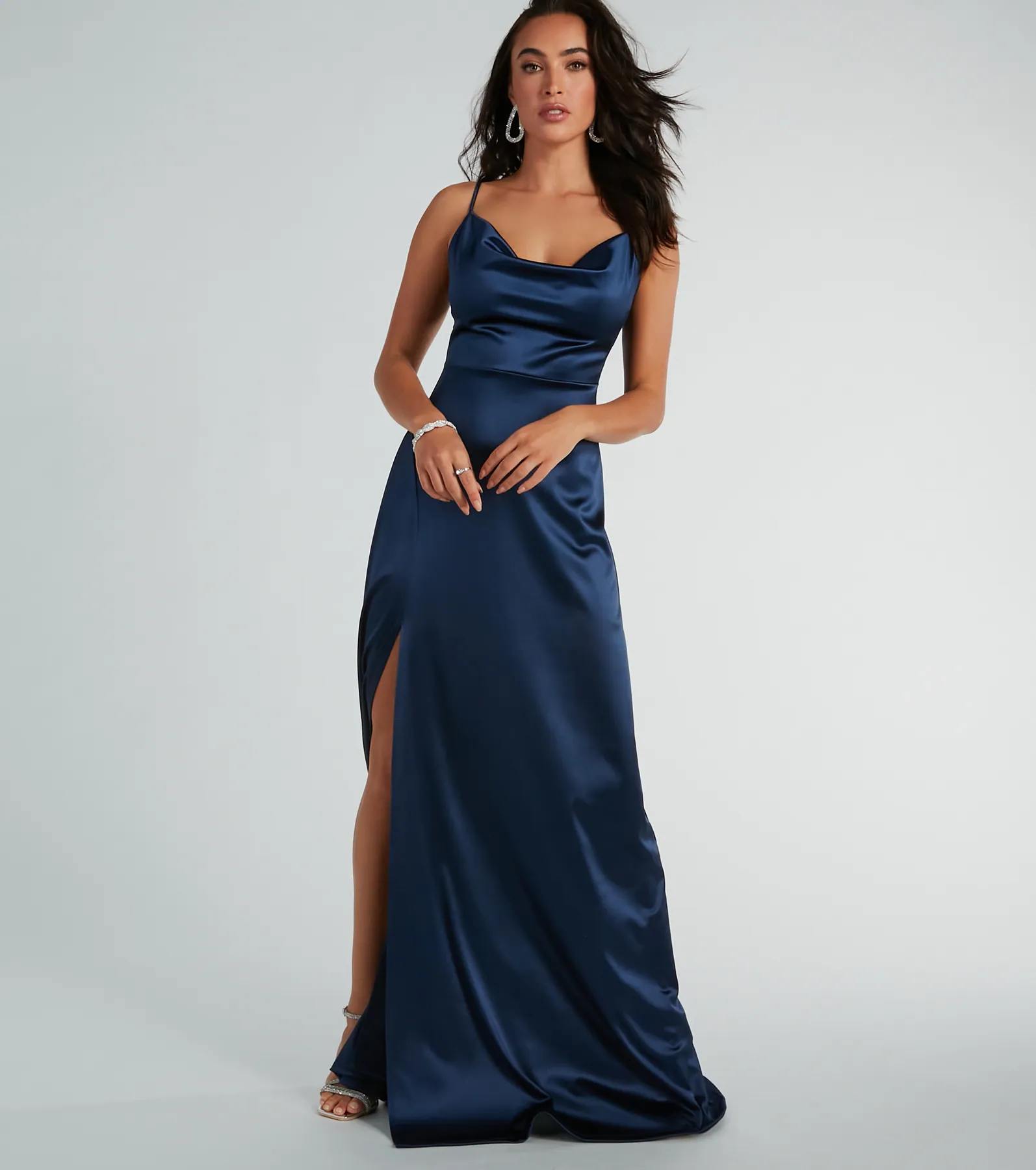 Ellie Cowl Neck A-Line Long Satin Formal Dress