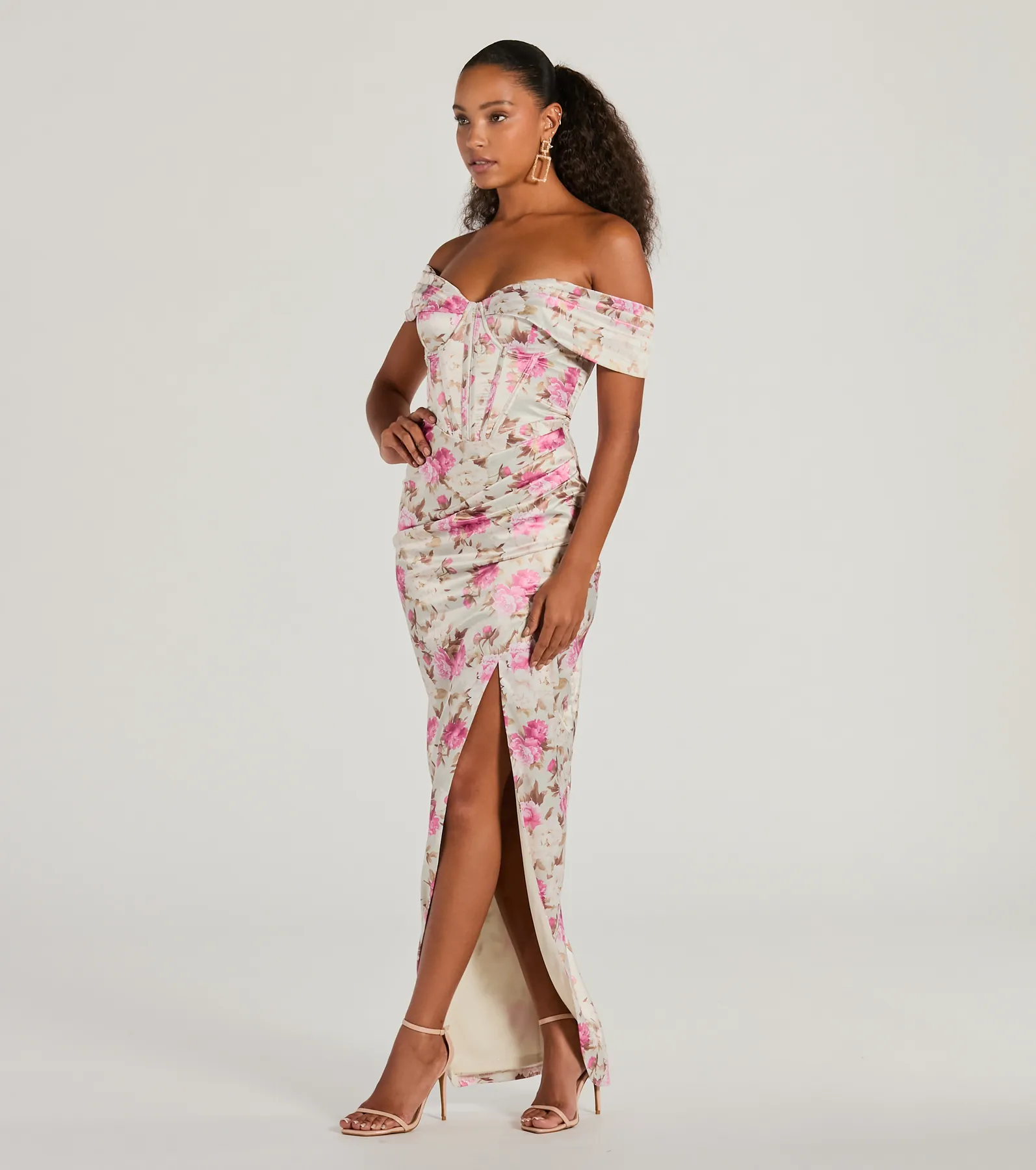 Mildred Off-The-Shoulder Floral Satin Formal Dress