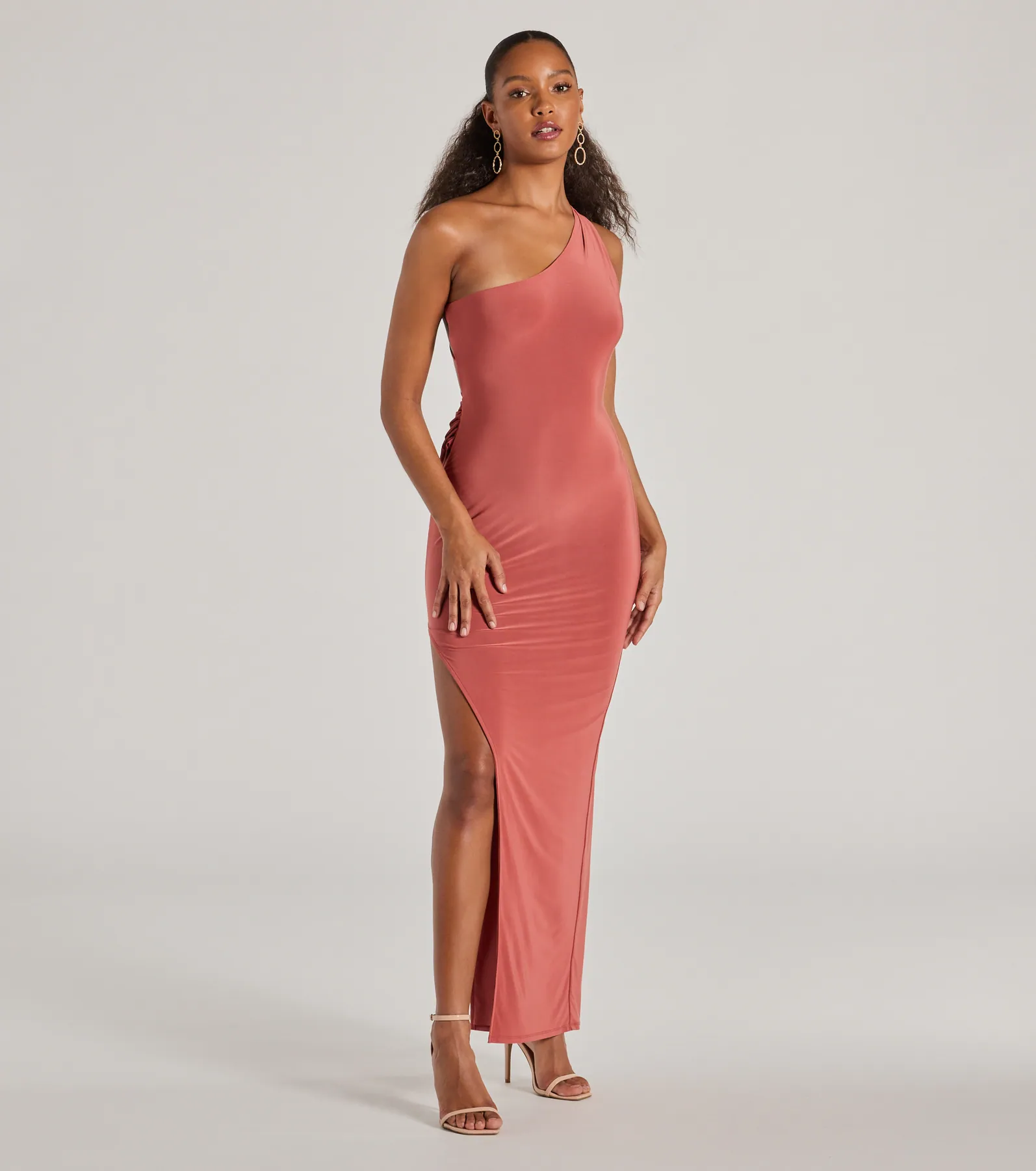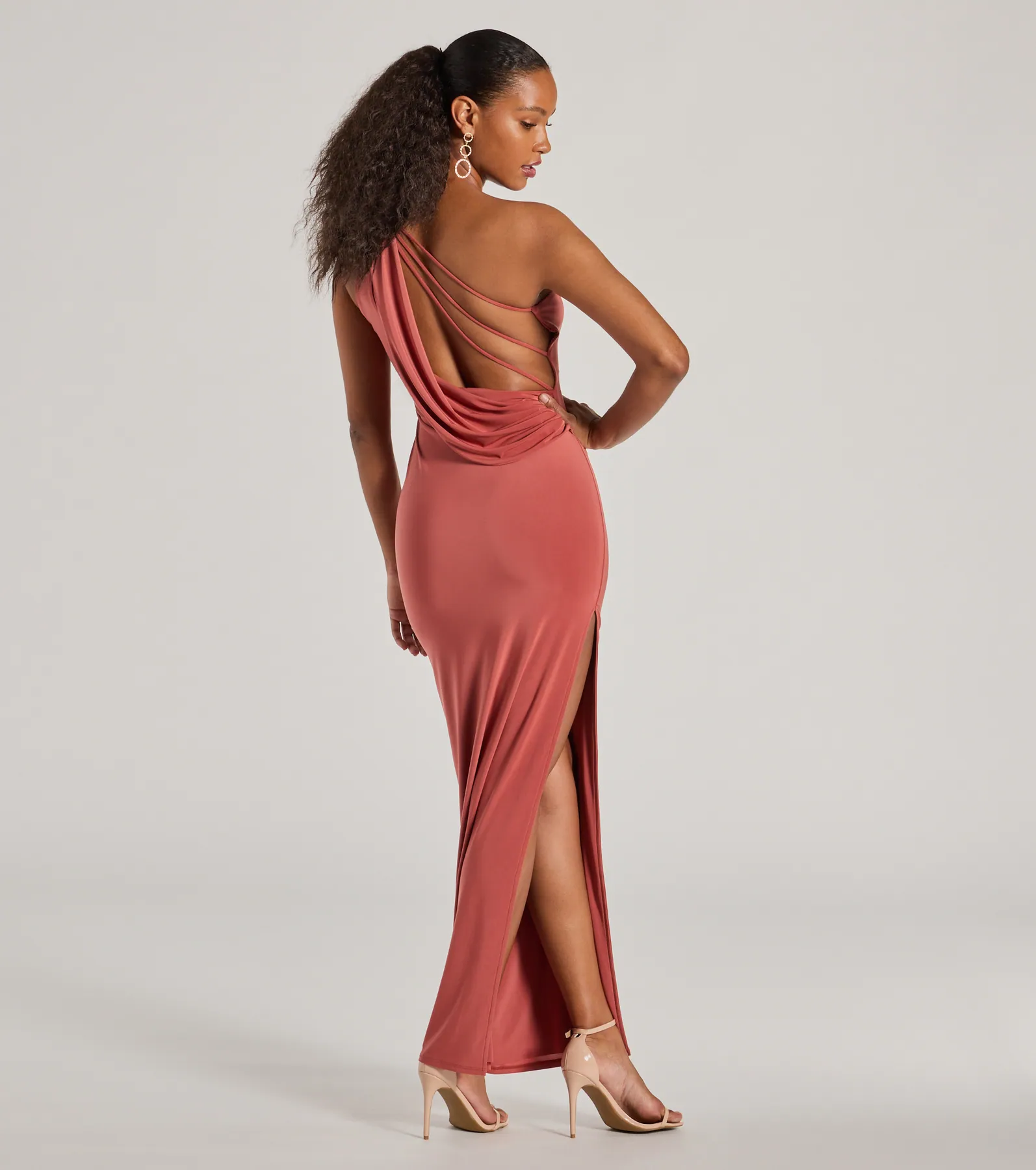 Lilianne One-Shoulder Strappy Back Slit Formal Dress
