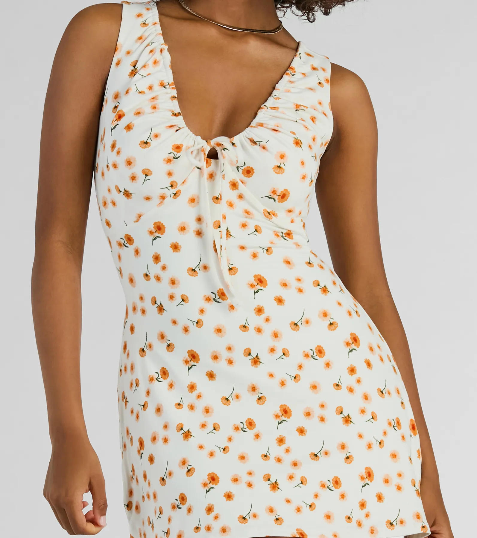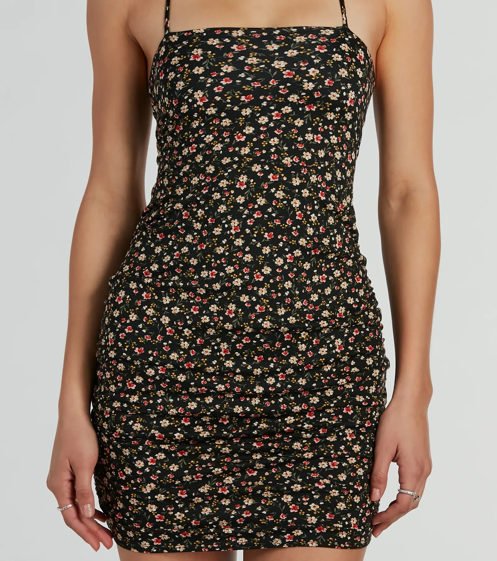 Day To Night Charm Lace-Up Ditsy Floral Mini Dress