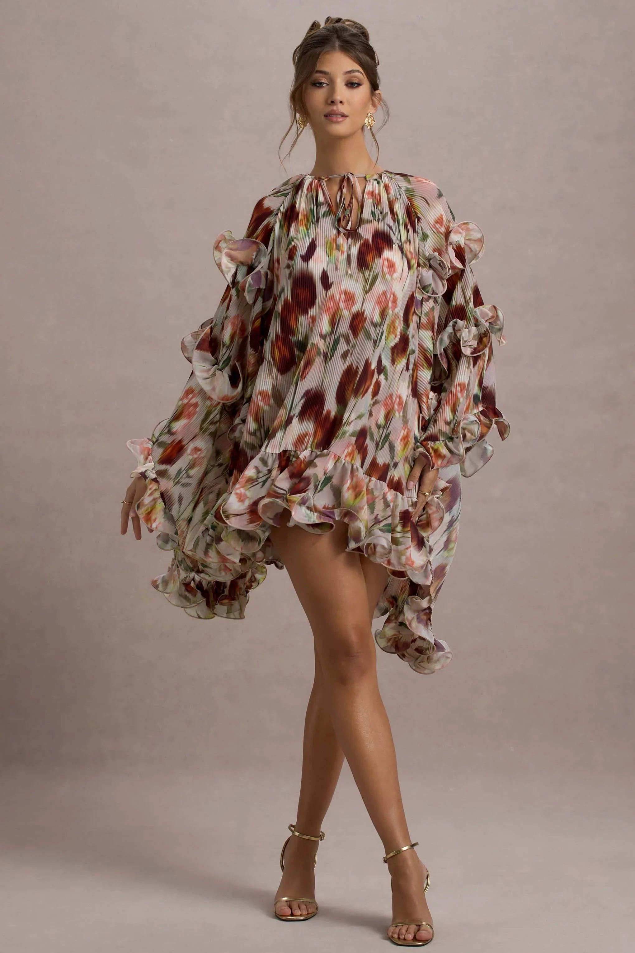 Exude an ethereal state of mind in Abelia, our flowing mini dress. Crafted in a cream floral print, this breezy chiffon piece boasts a self-tie neckline, extravagant cape sleeves and ruffle detailing throughout
