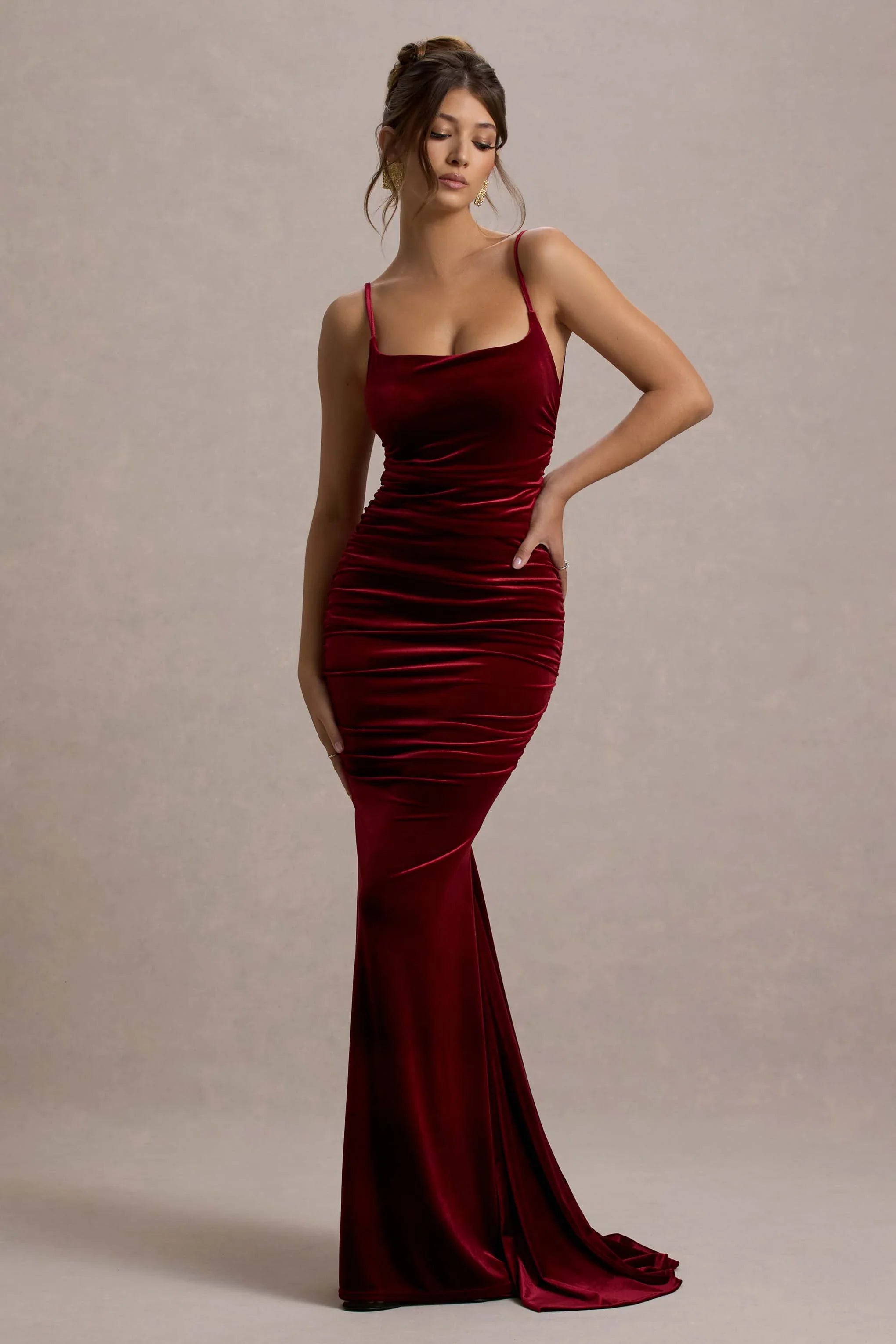 Who says the bride can solely bring the drama? Our latest maxi dress known as Adele is crafted from premium soft velvet in berry. A plunging back is supported from delicate straps which can be adjusted for the perfect fit whilst a fishtail skirt showcases a godet train from behind.