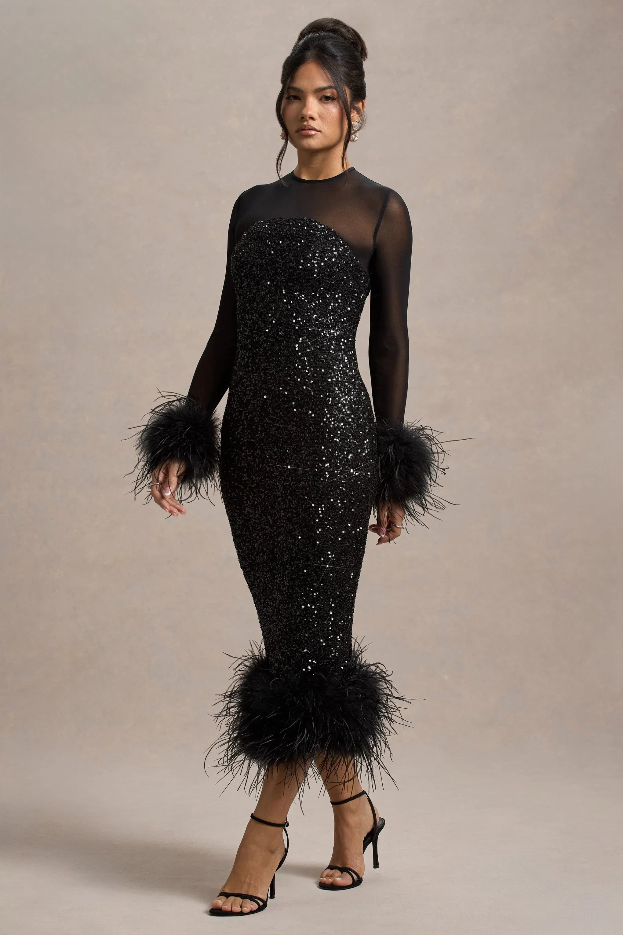 Elevate your evening look with Afterglow, a mesmerizing midi that exudes glamour and drama. Coated in our high-shine premium sequins, this dress effortlessly catches the light with every movement. The sleek silhouette is enhanced by luxurious feather trims on the sleeves and hem, adding a touch of playful elegance. With its chic midi length and statement-making details, Afterglow is your go-to for any show-stopping occasion. Pair with strappy heels and a bold lip to let this dazzling dress shine at your next event.