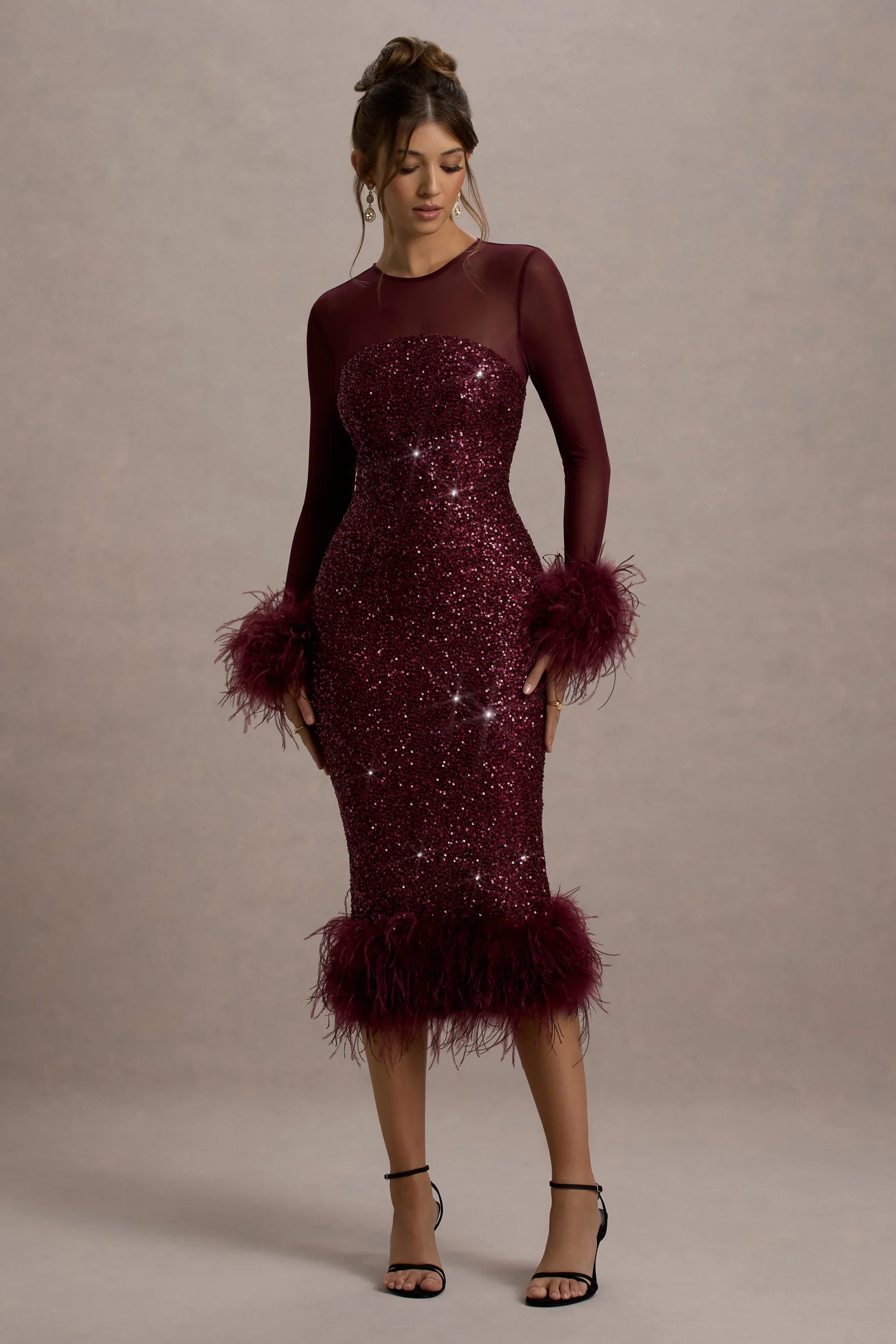 Elevate your evening look with Afterglow, a mesmerizing midi that exudes glamour and drama. Coated in our high-shine premium sequins, this dress effortlessly catches the light with every movement. The sleek silhouette is enhanced by luxurious feather trims on the sleeves and hem, adding a touch of playful elegance. With its chic midi length and statement-making details, Afterglow is your go-to for any show-stopping occasion. Pair with strappy heels and a bold lip to let this dazzling dress shine at your next event.