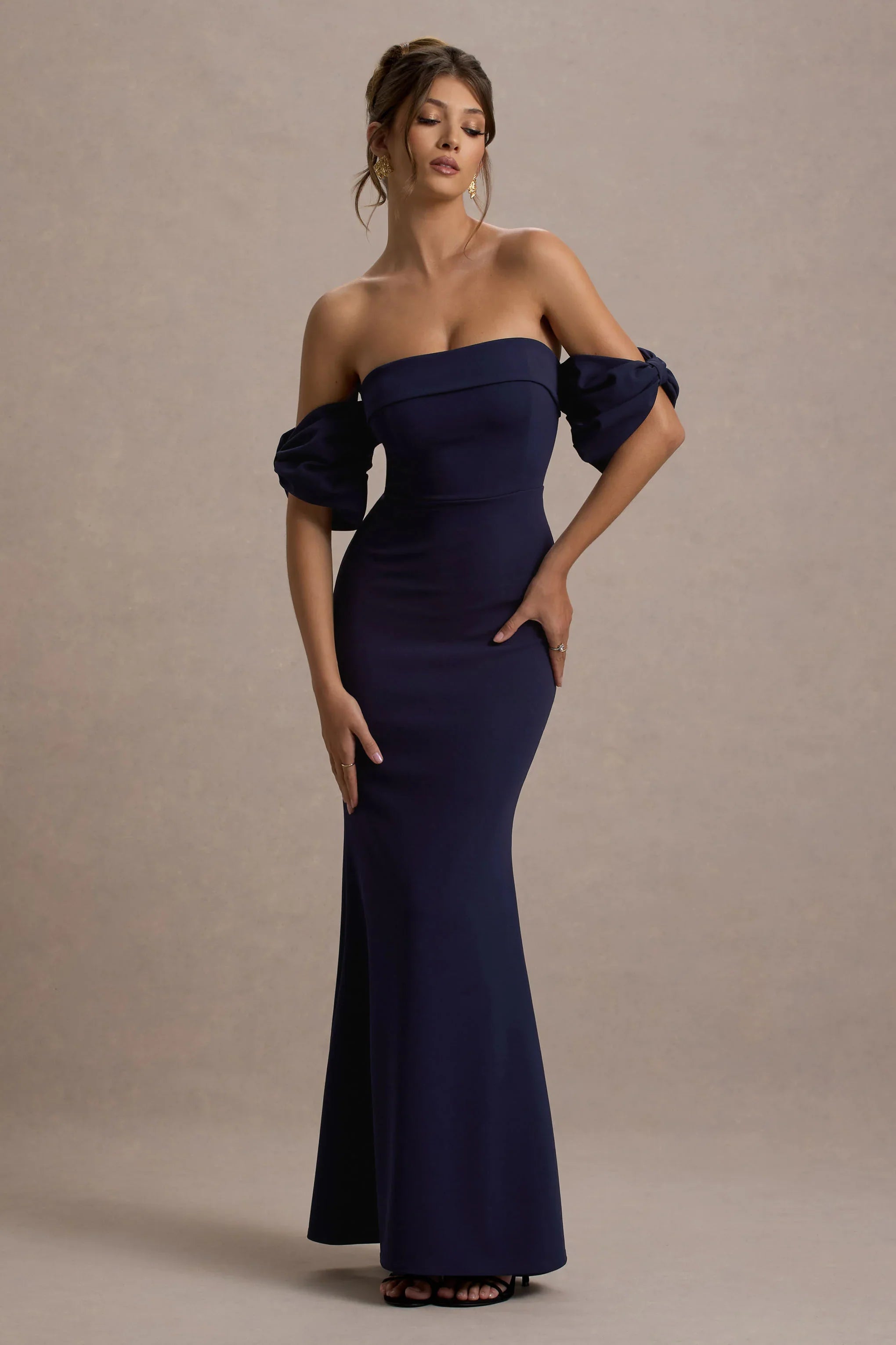Glamorous, elegant and timeless are three words that perfectly describe Alaine. Carefully crafted in a deep navy hue of scuba crepe, this curve-enhancer boasts a classic bardot neckline and draped bow sleeves. For the perfect bridemaids attire, style yours with some gold earrings like Linnea.