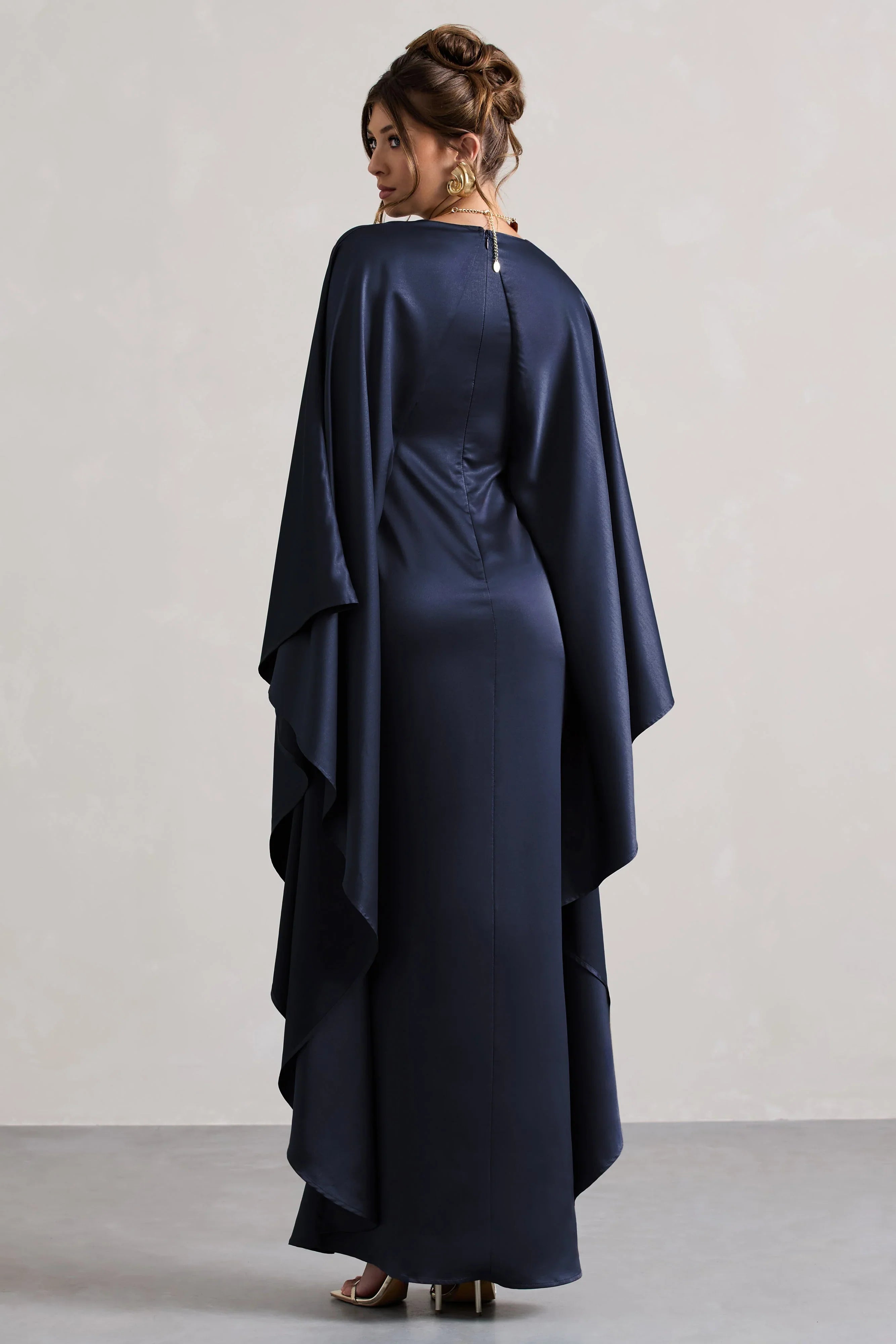 With movement like a summer breeze and comfort at the forefront, say hello to Alohi. Arriving in a deep navy shade of a premium satin this maxi dress features effortlessly flowing cape sleeves, a feminine plunge neckline and detailed with a self-tie strap across the back.