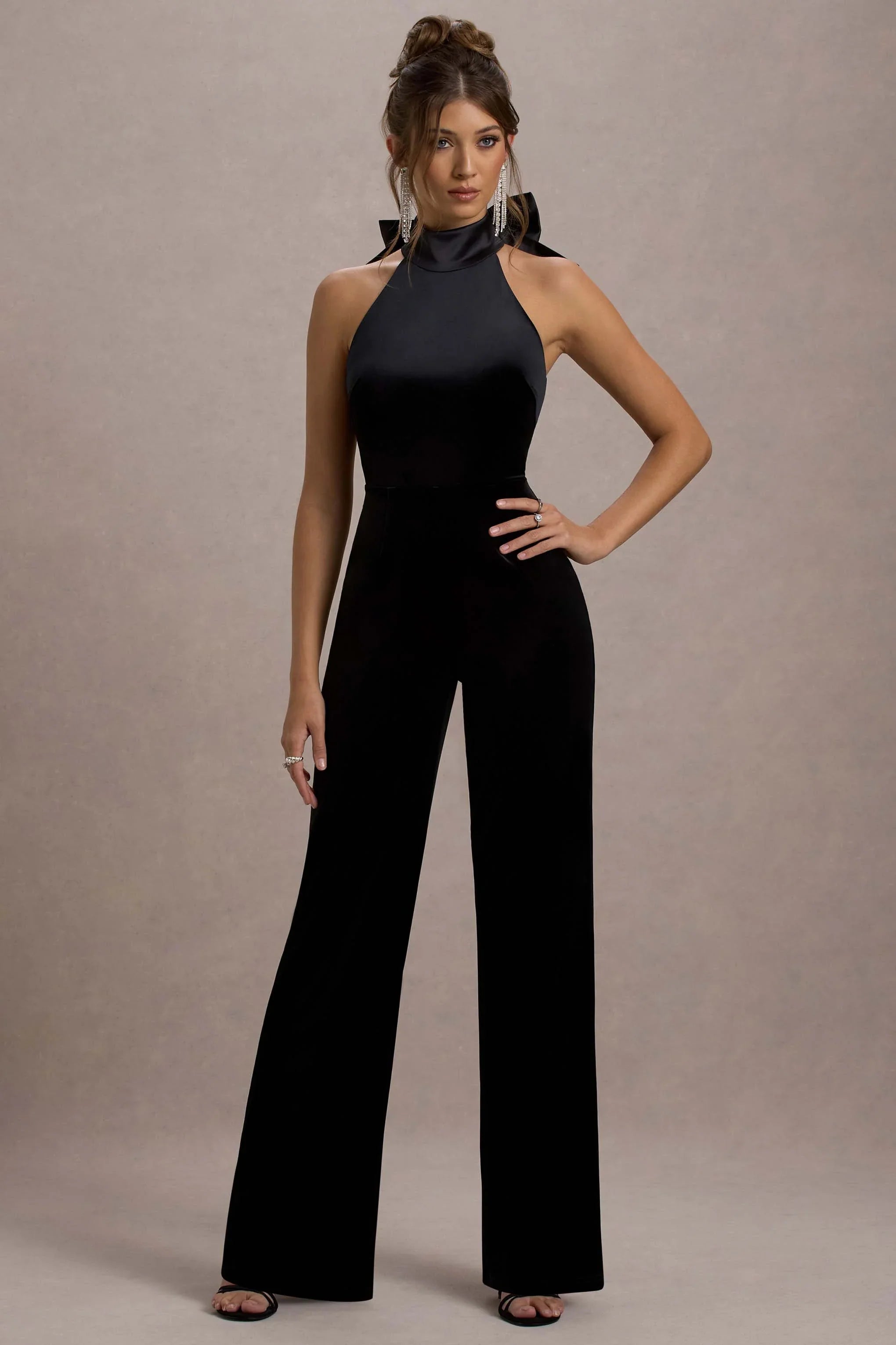 Defined by its sleek silhouette and luxurious textures, Alondra is a statement-making option for your next special occasion. Crafted from our premium velvet and satin, this black jumpsuit features a sophisticated high neckline and straight-leg design that exudes modern elegance. The rich velvet fabric adds a touch of opulence, while the satin bow detail accents enhance the refined aesthetic. Style Alondra with bold accessories and polished heels to create a look that effortlessly balances drama and sophistication at your next event.