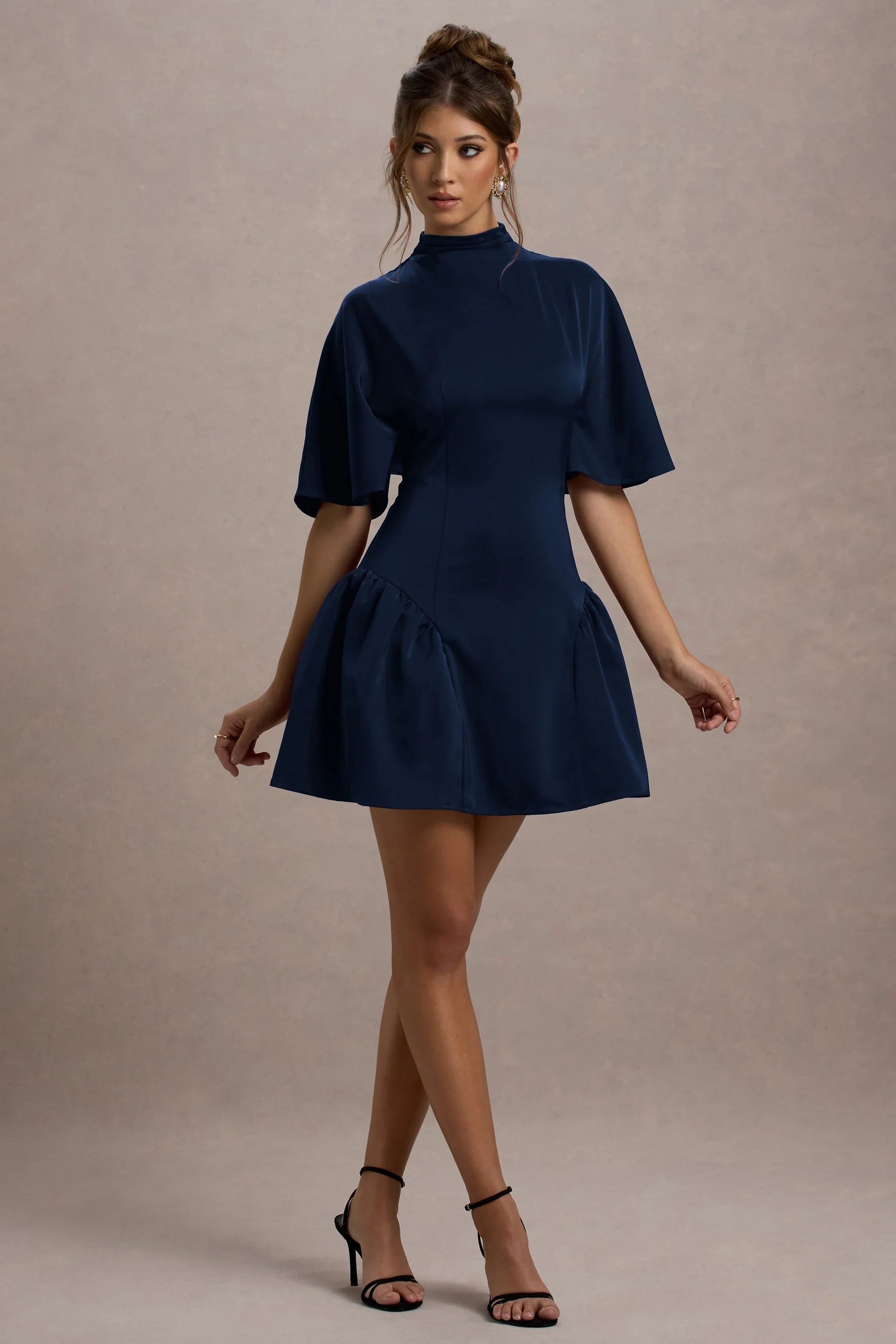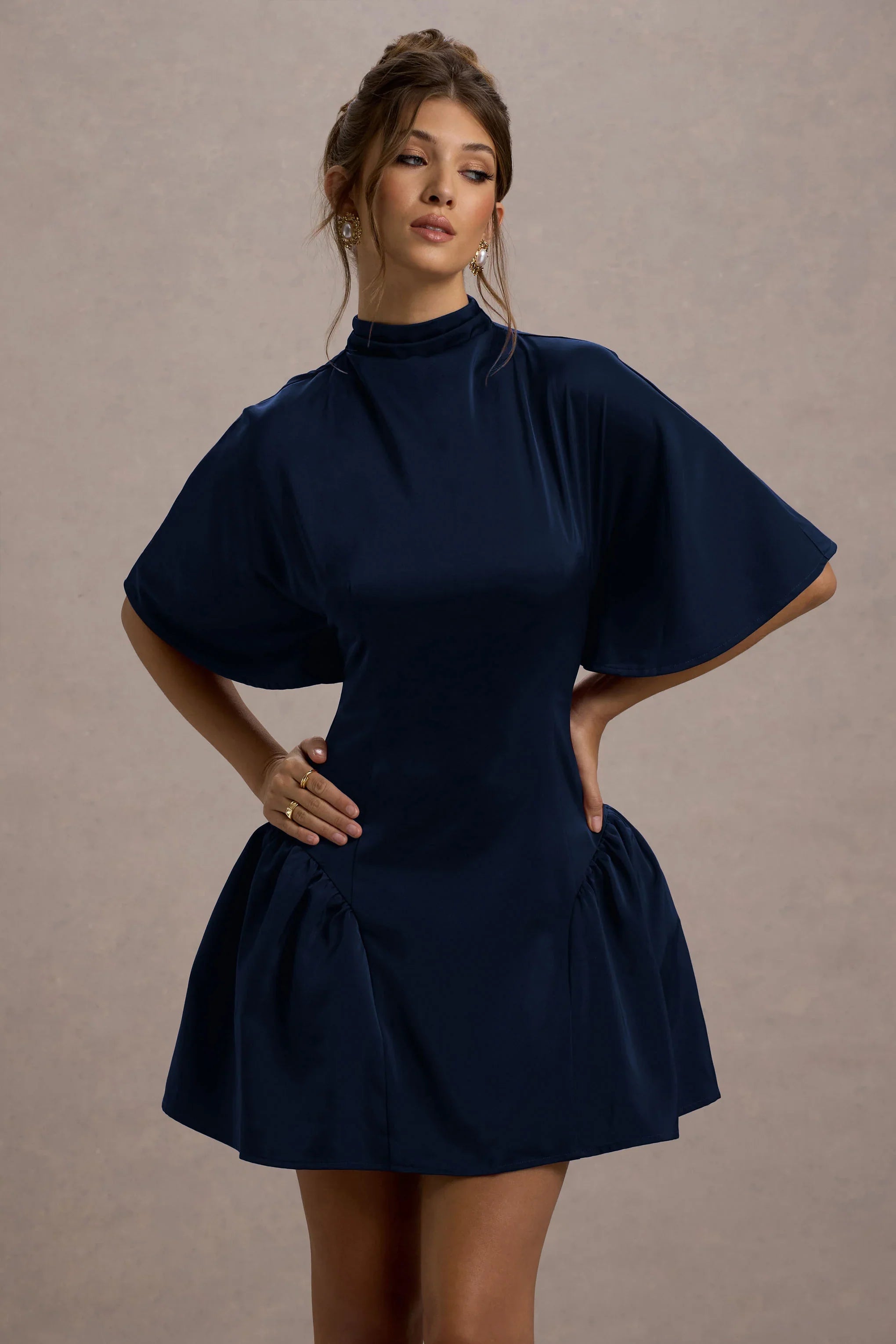 Showcasing just the right amount of skin whilst maintaining a sophisticated and elegant silhouette, Alva is a timeless addition to any wardrobe. Crafted in a deep navy shade, this mini dress boasts a demure high neckline, short flutter sleeves and a flattering volume hem.