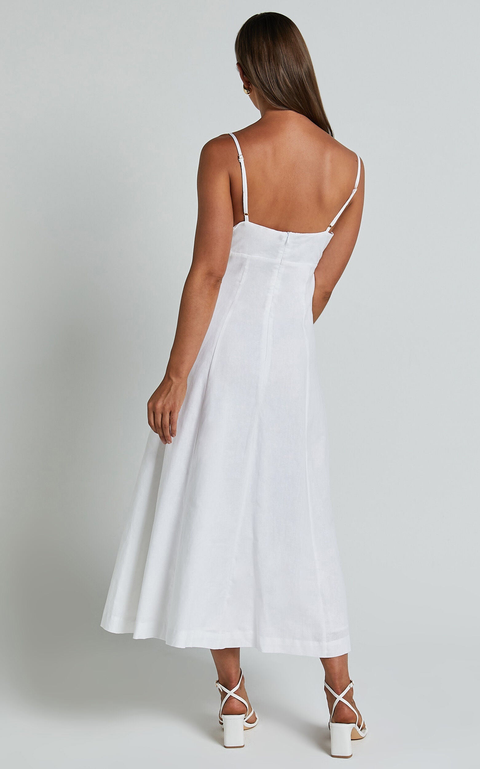 Get ready to turn heads in the Amalie The Label - Carietta Linen Look Strappy Sweetheart Cut Out A Line Midi Dress In White. This stunning white midi dress is perfect for any party or special occasion, and will make you feel like the confident and stylish woman that you are. Its sweetheart neckline and cut out details add a touch of flirtiness, while its A-line silhouette flatters your figure effortlessly. Made from a blend of cotton and linen, this dress is not only fashionable but also comfortable to wear all day long. Whether it's a party day or night, this sleeveless dress is sure to make a statement wherever you go. So why wait? Add this beautiful piece to your wardrobe today!