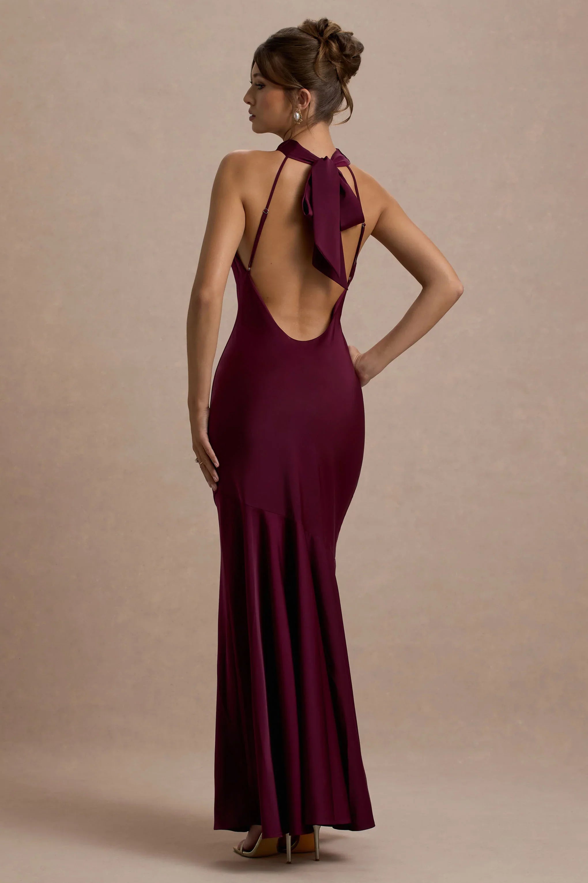 Immerse yourself in a timeless sophistication no matter the occasion with Amelita. Designed in a deep port shade of our premium satin, this maxi dress boasts a self-tie halter neckline, sultry open back and adjustable cami straps for the perfect custom fit.