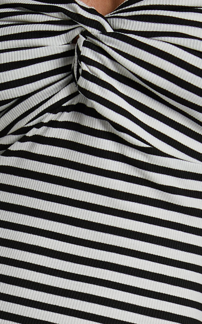 Make a statement this autumn with our Aravis Twist Detail Strapless Midi Dress in Black and White Stripe. The bodycon jersey material hugs your curves perfectly, while the strapless and sleeveless design exposes just the right amount of skin for an effortlessly chic look. Whether you're dressing up for a night out or keeping it casual during the day, this dress is versatile enough to fit any occasion. Don't miss out on adding this must-have black and white striped dress to your wardrobe!
