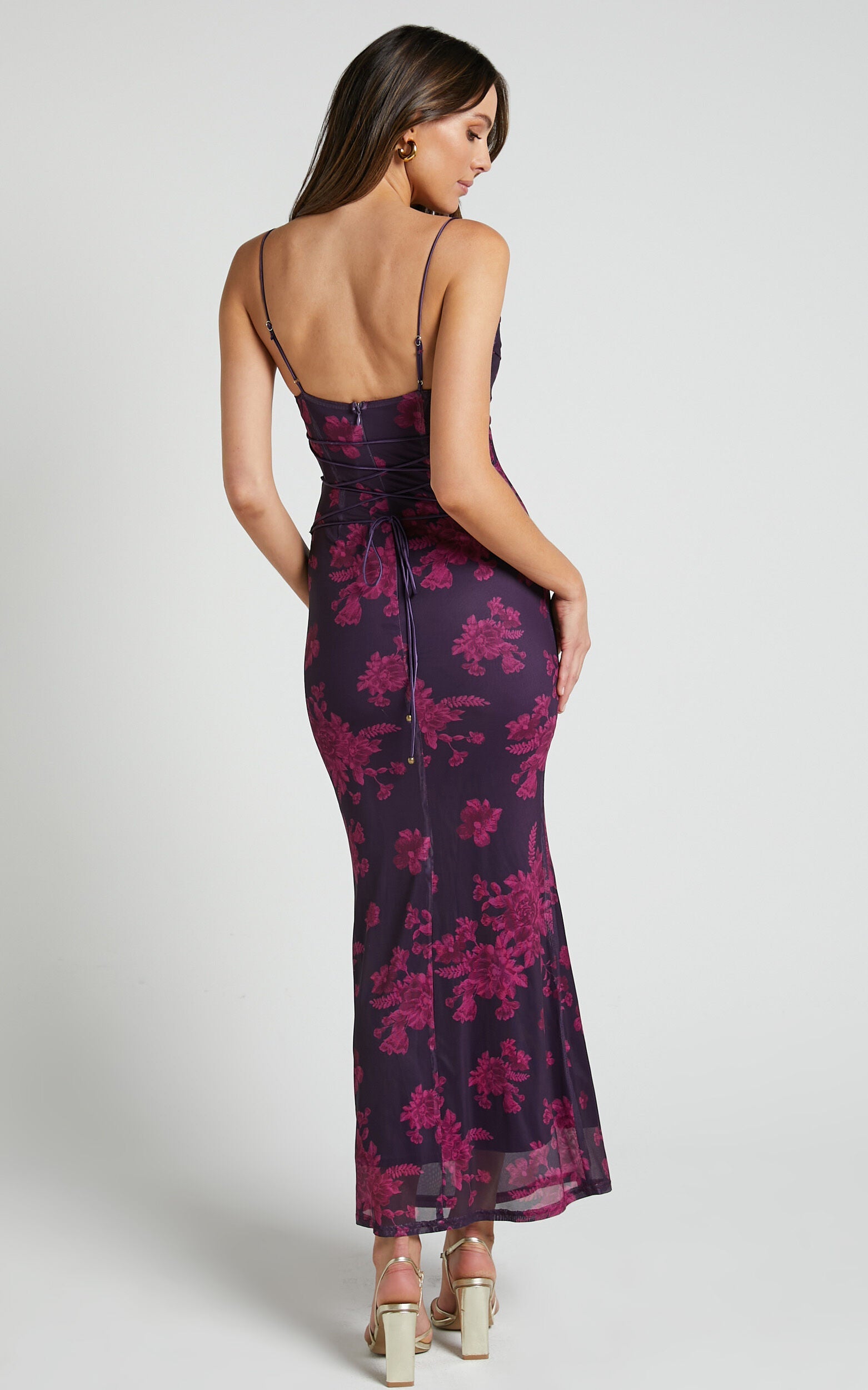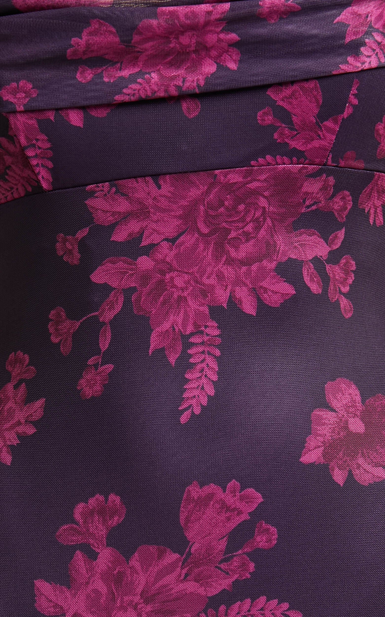 Stand out from the crowd in our Ariel Mesh Bodycon Tie Detail Maxi Dress In Purple Floral! This dress is perfect for those party nights when you want to make a statement. The vibrant multi-color design will ensure all eyes are on you as you dance the night away. The bodycon fit hugs your curves in all the right places, while the sleeveless style keeps you cool on the dance floor. And with its maxi length, this dress is guaranteed to turn heads wherever you go. So get ready to shine and let your personality sparkle in our Ariel Mesh Bodycon Tie Detail Maxi Dress In Purple Floral!