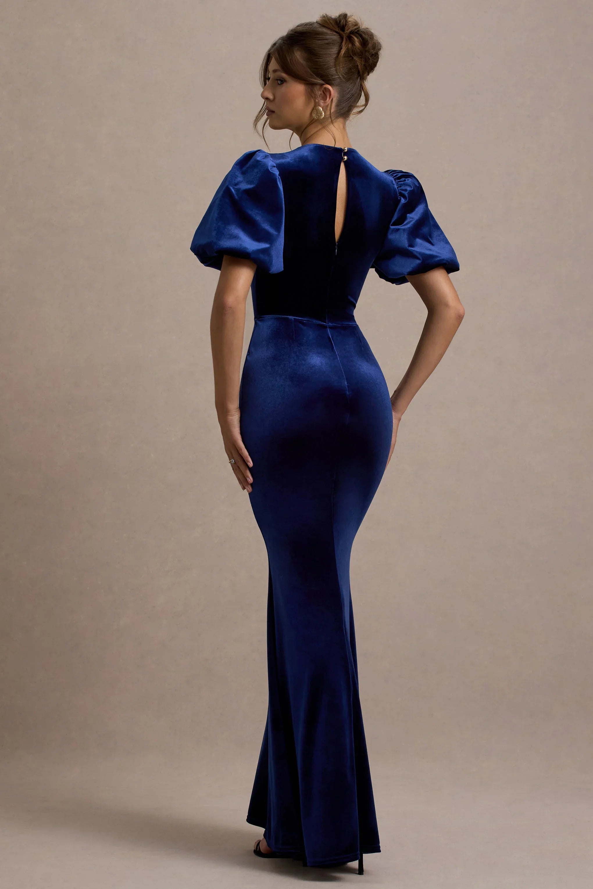 Exude a romantic state of mind in our lavish maxi dress, Ashlin. Crafted in a rich navy shade of our premium velvet, this floor-sweeper boasts artful puff sleeves and a high-leg split. Compliment this occasion maxi by styling yours with some glistening gold accents.