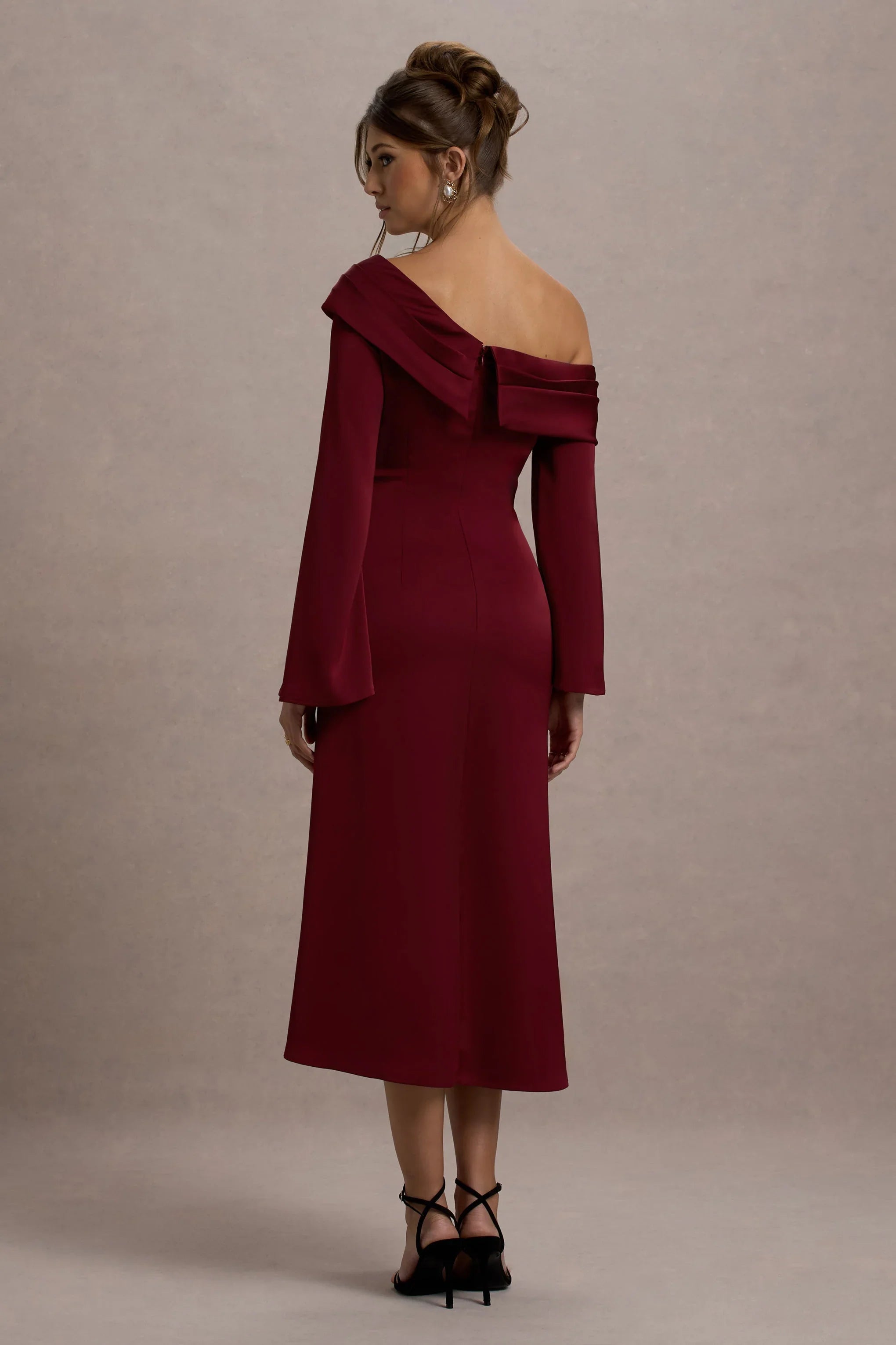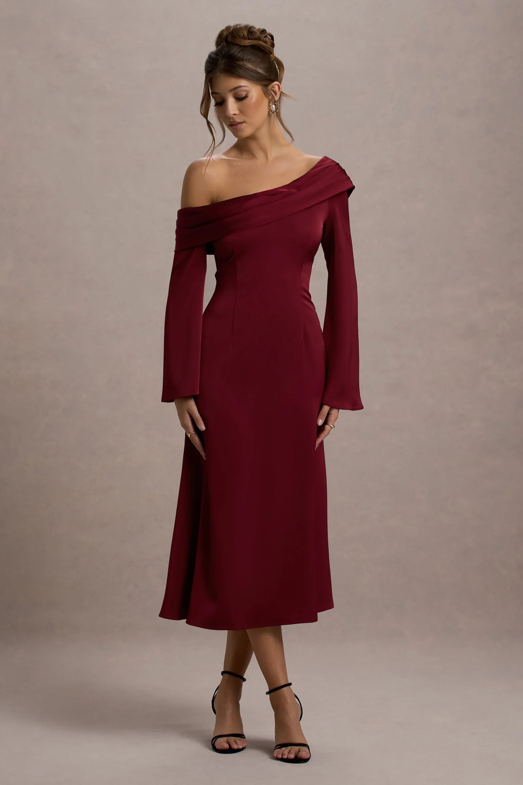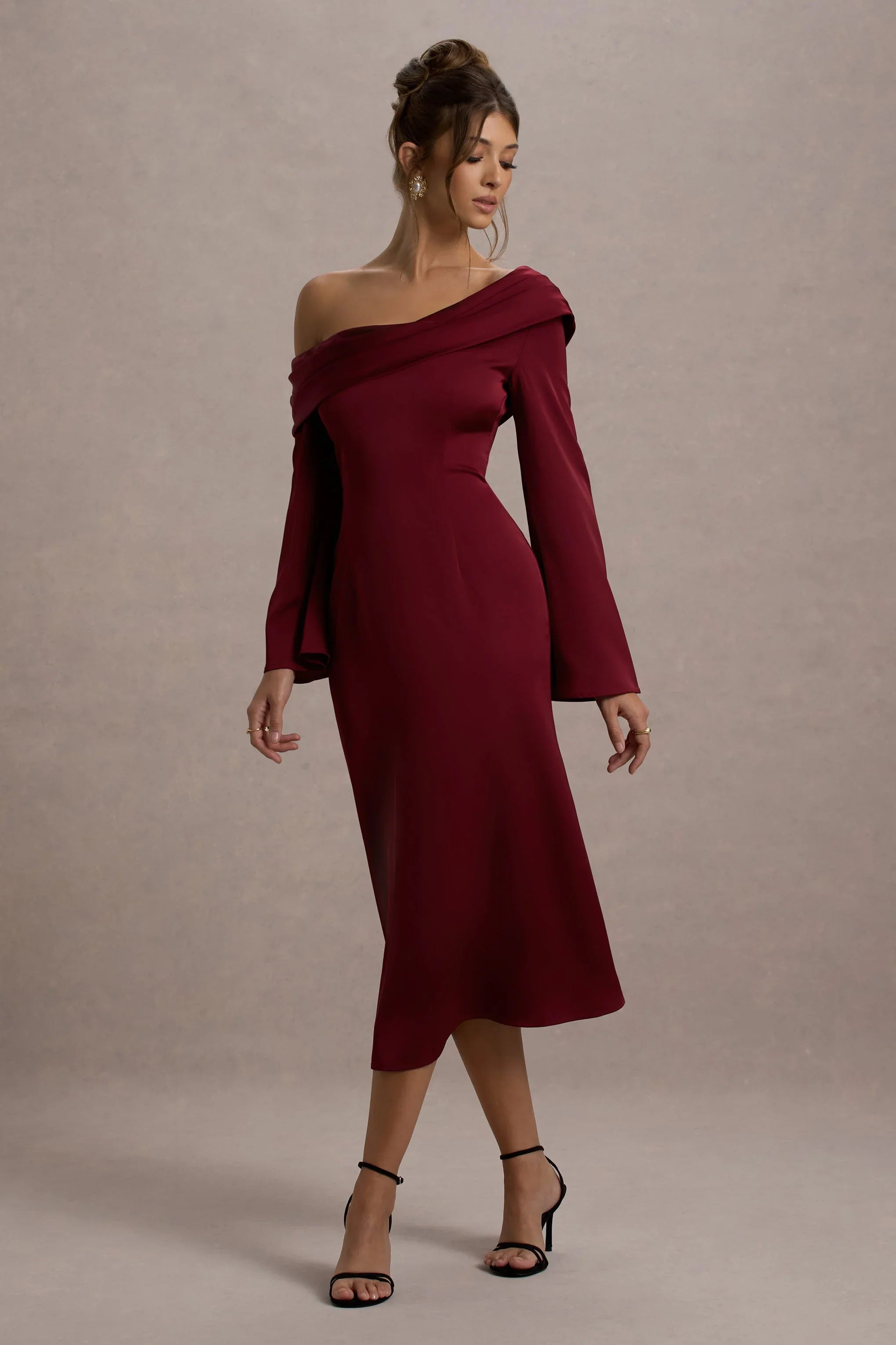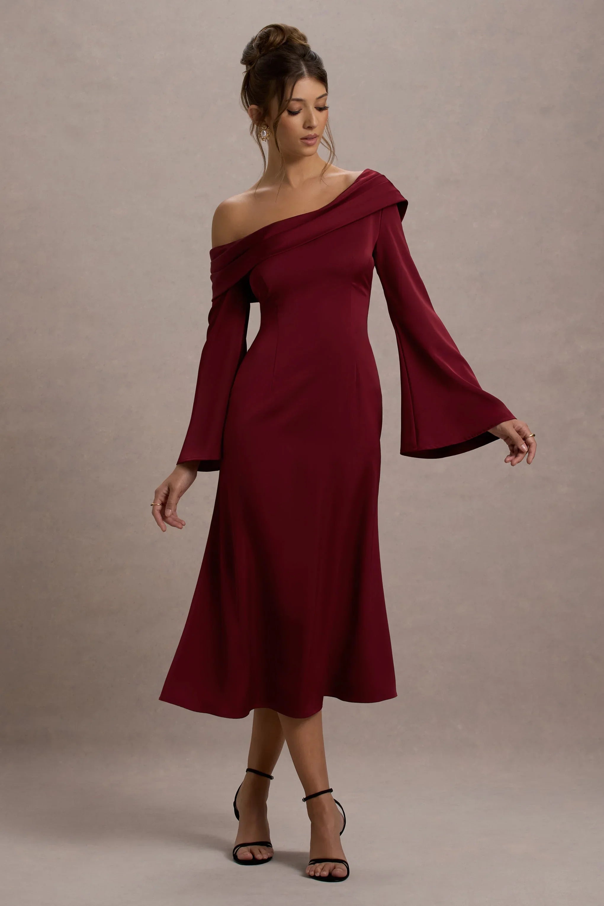 A wardrobe staple, Astral was designed to see you through any occasion. Expertly crafted in a rich port hue of our premium satin, this free-flowing midi is defined by its asymmetric neckline and long, flared sleeves. Elevate yours with some bouncy curls and earrings like Cecille for the perfect formal look.