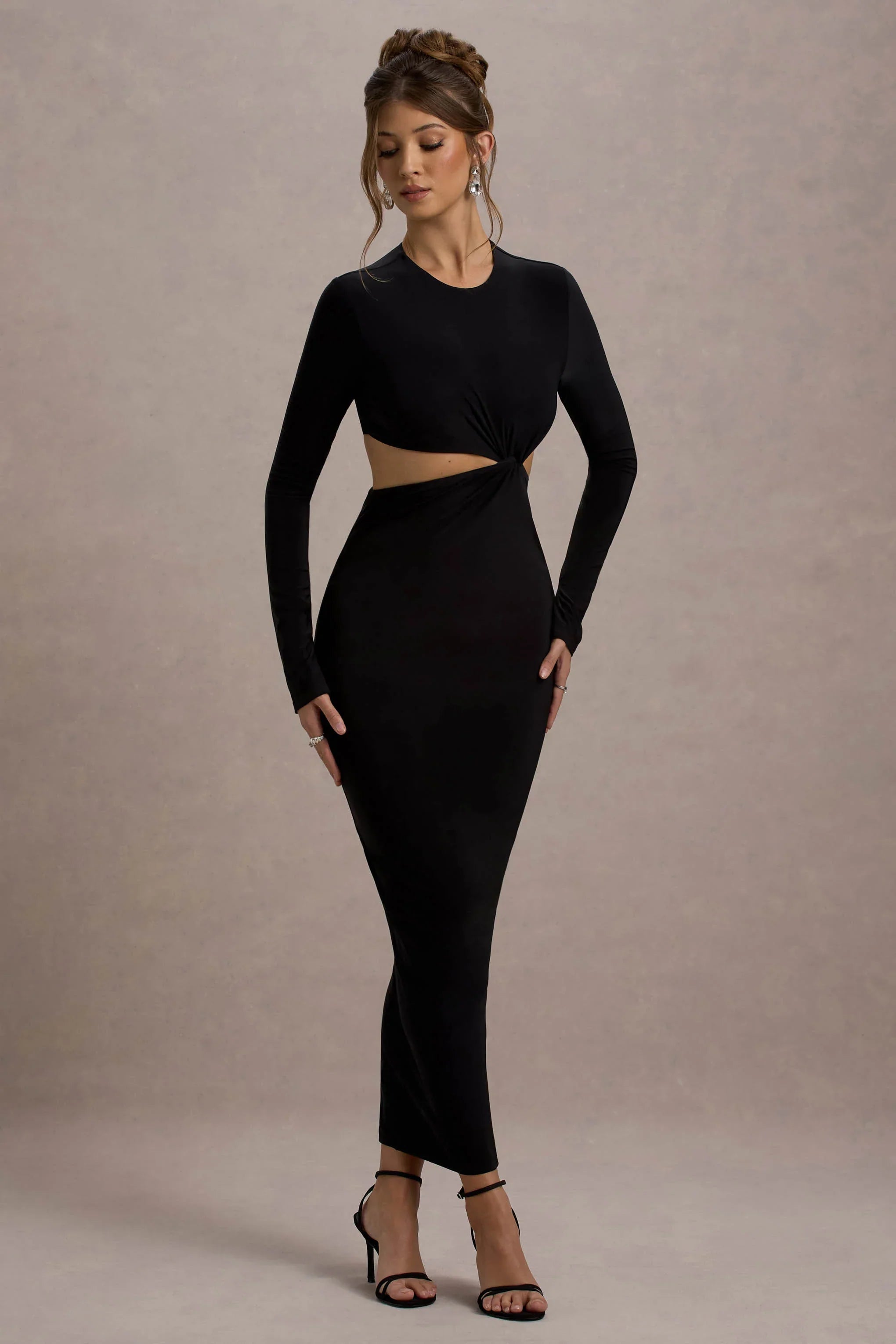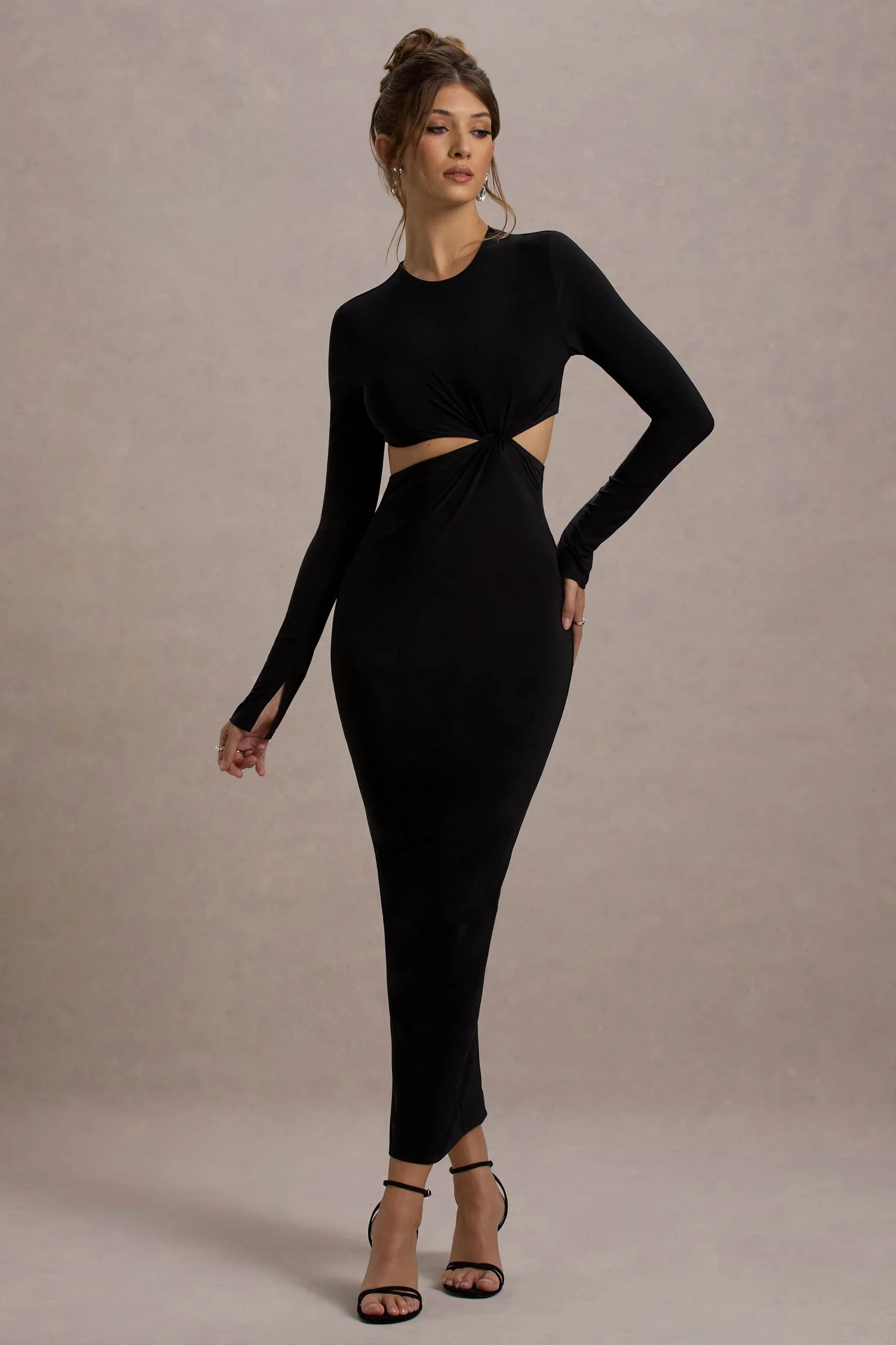 Attina is a dramatic and elegant choice for your next special occasion. Crafted from our premium jersey, this black long-sleeve maxi dress features a striking twisted cut-out detail at the waist, designed to enhance your silhouette with a touch of bold sophistication. The smooth fabric drapes beautifully, while the fitted shape ensures a sleek, refined look. Style Attina with statement heels for a polished ensemble that will command attention at any event.