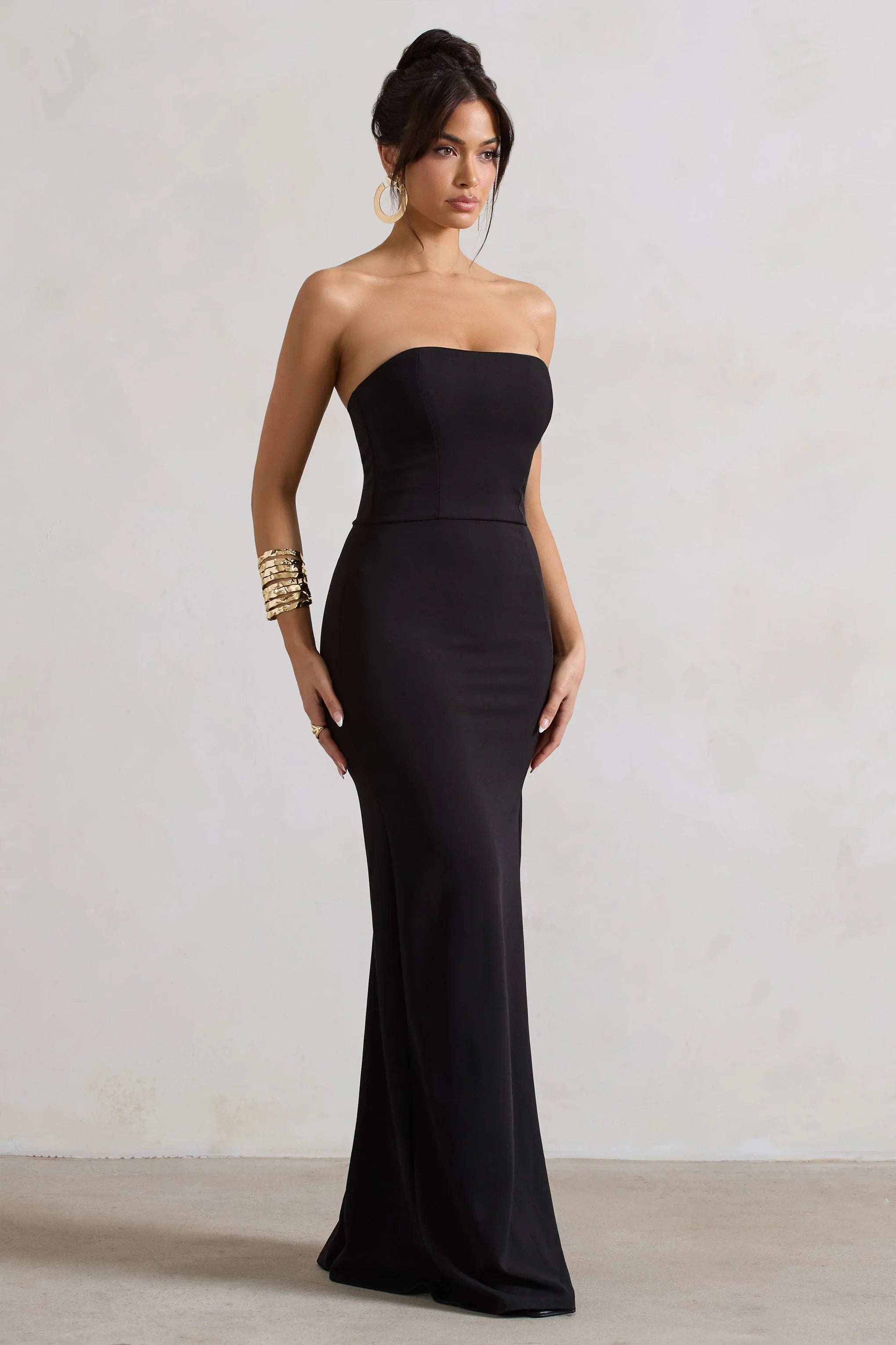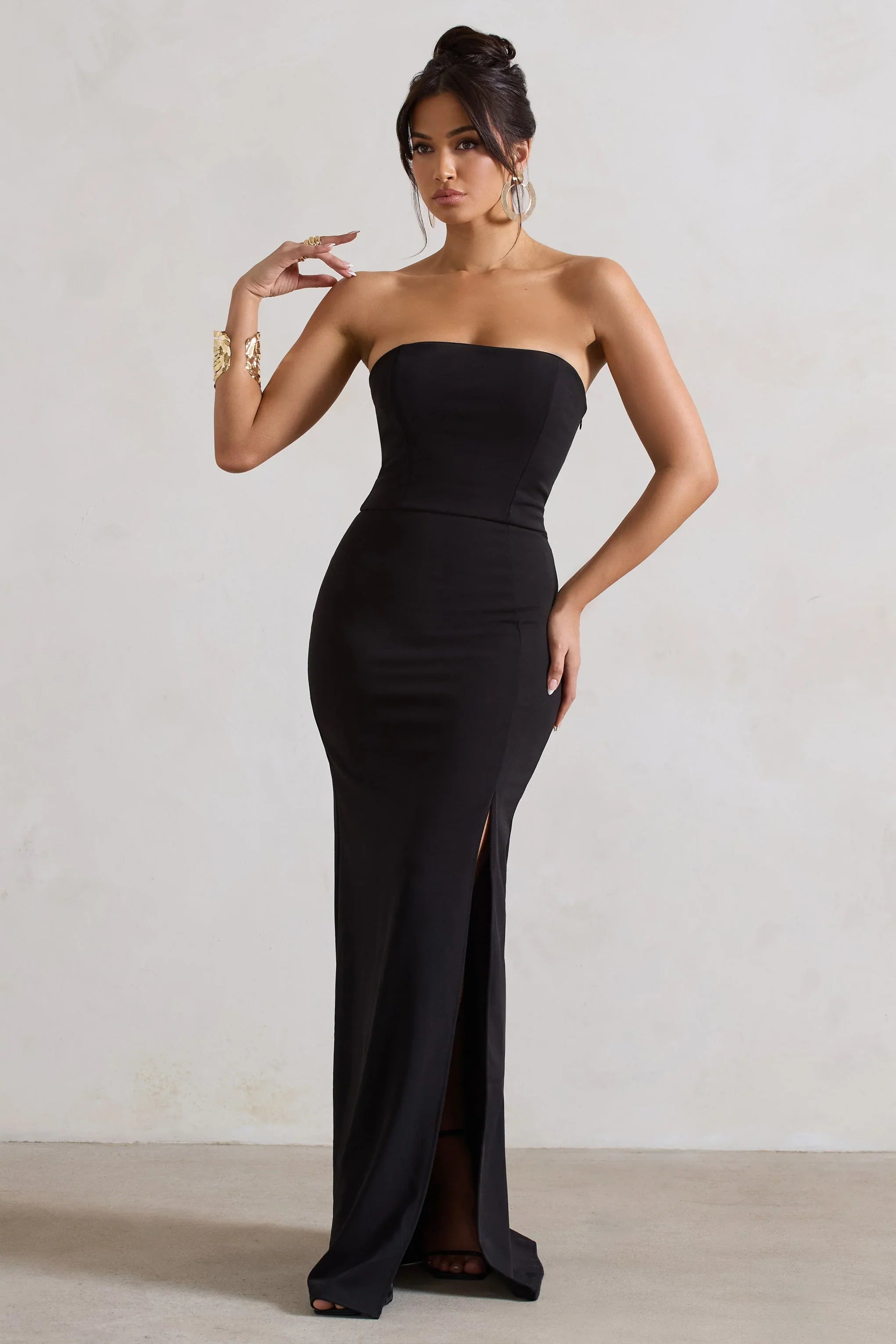 Leave it to Club L to make a sleek dress suited to every special occasion. Cut from sculpting scuba crepe, our black Belle of The Ball maxi boasts a bodycon fit with a strapless bandeau neckline and a theatric thigh split. If you're looking for a figure-flattering wardrobe staple to see you through the party season, look no further than this timeless style.