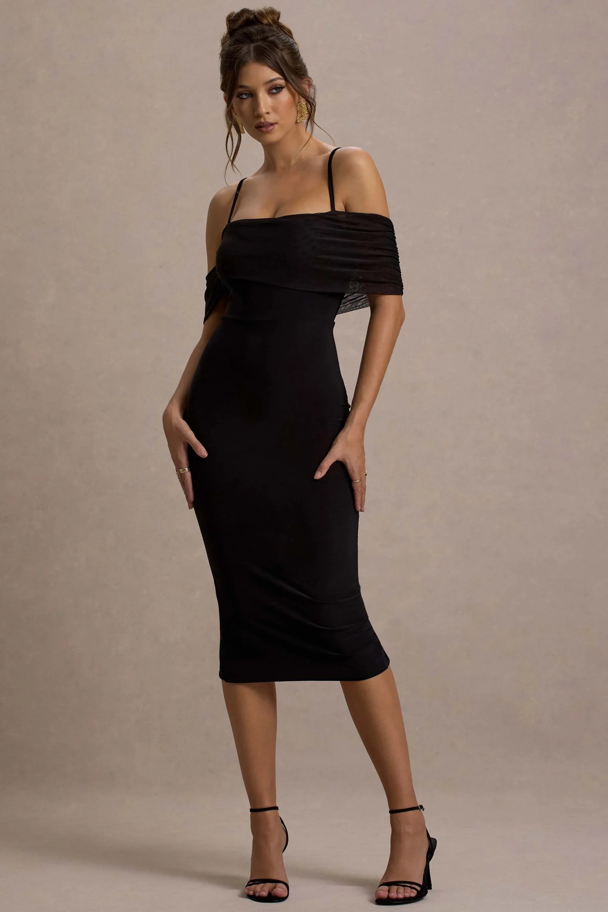 A timeless staple for every formal wardrobe, Bethan was made to see you through any occasion. Arriving in a staple black shade of our signature stretch jersey, this form-flattering midi dress is defined by a delicate mesh bardot neckline and thin adjustable cami straps. For the perfect graduation ensemble, try styling Bethan with some strappy stilettos.