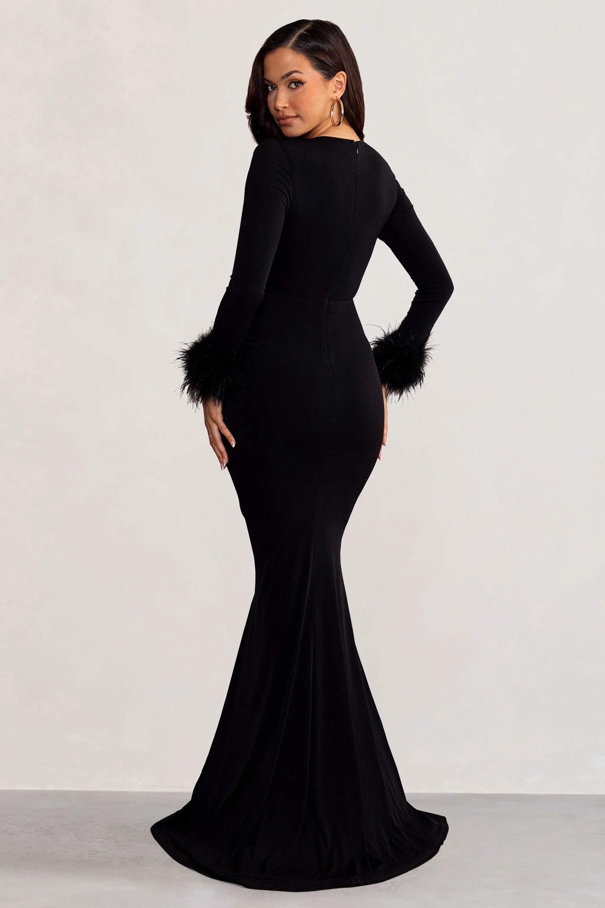 If you're falling for all things feathered this season then you will love our latest black maxi dress, Betty. Crafted from premium stretch jersey, this figure-hugging dress features a high neckline, long sleeves trimmed in feathers and a fishtail skirt that's anything but understated.