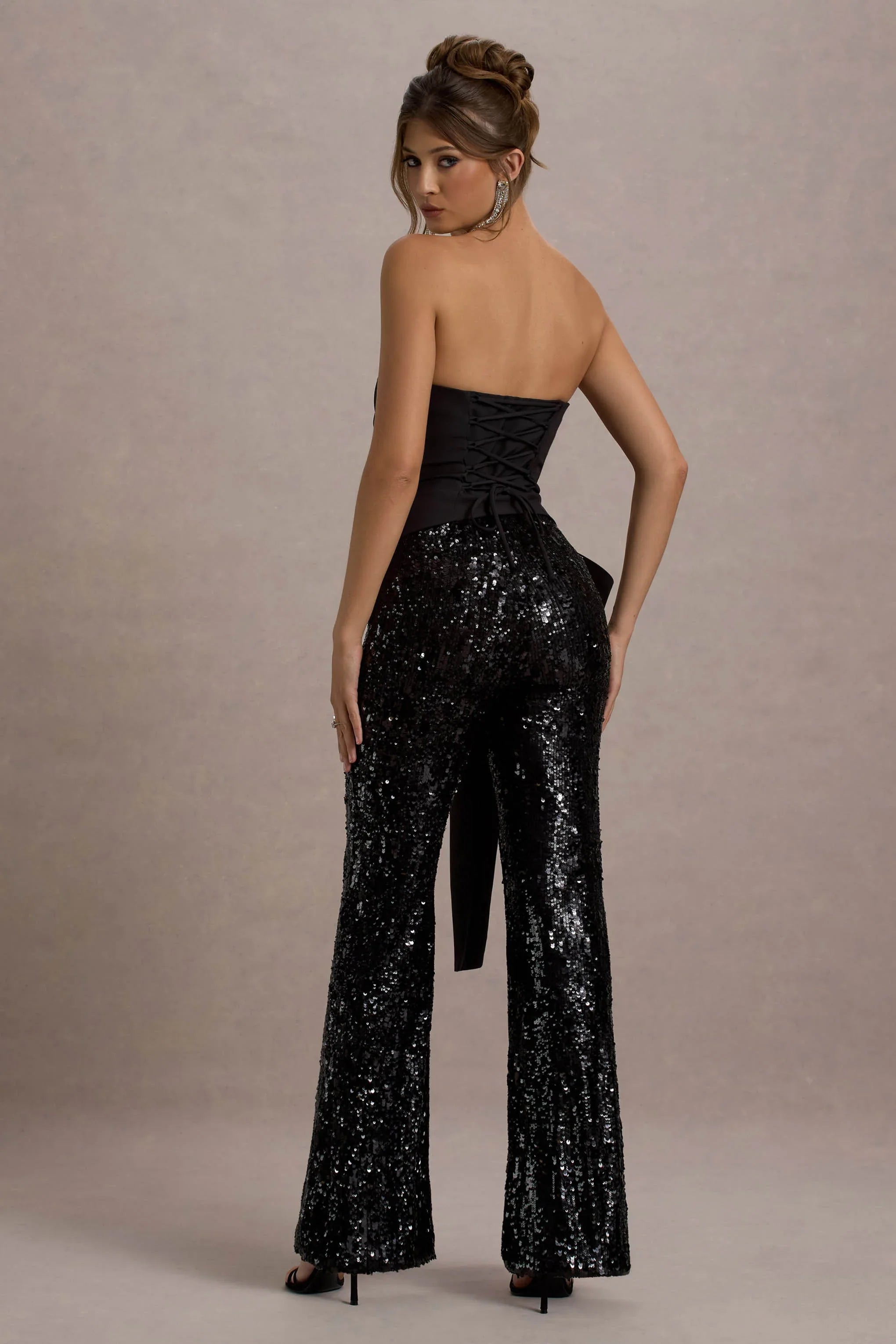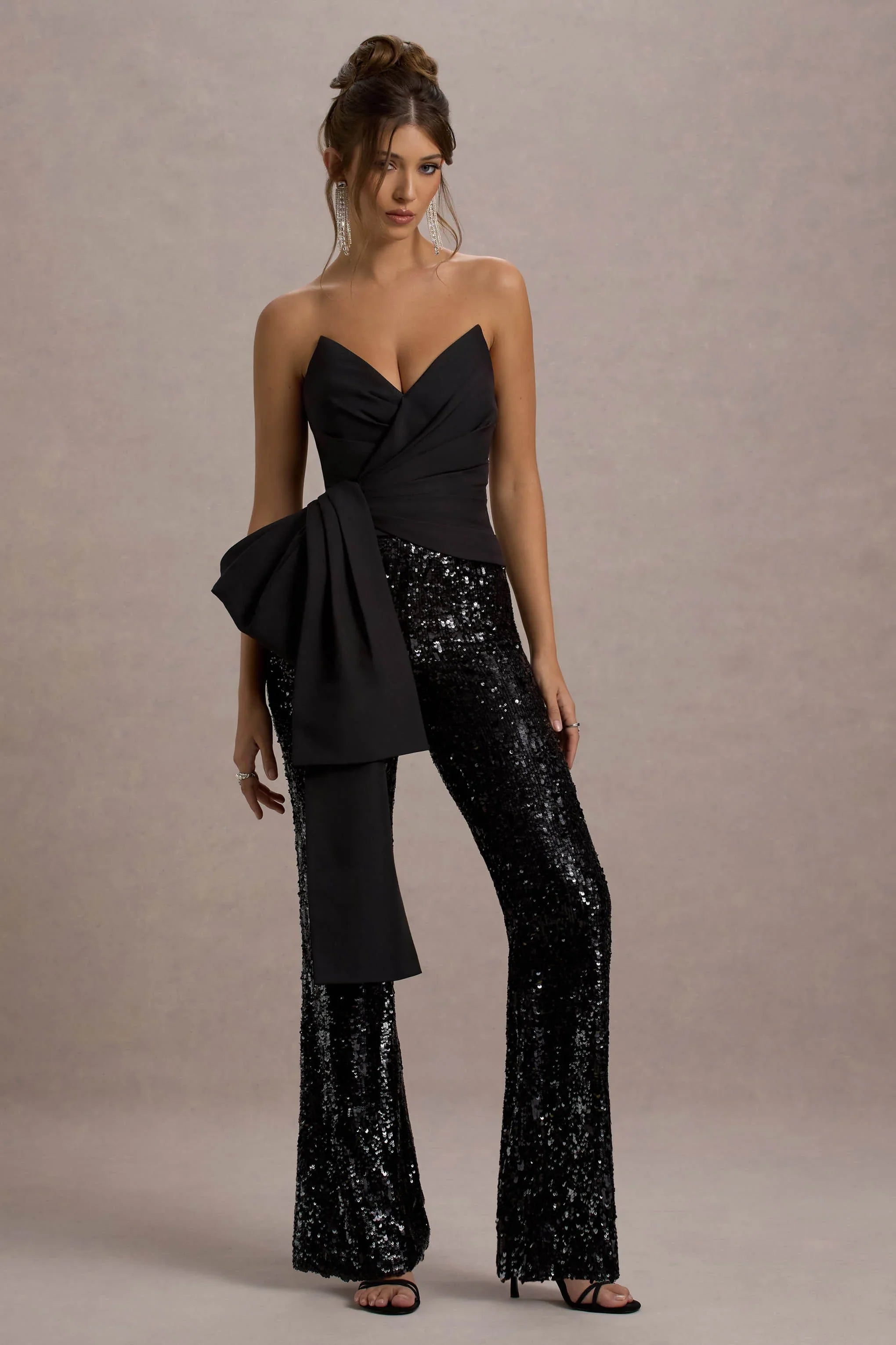 Bianco is a dazzling option that brings high-impact glamour to your next special occasion. Crafted from our premium crepe and adorned with striking sequins, this strapless jumpsuit is designed to sculpt your figure with its sleek bodice. The dramatic flared-leg silhouette adds a bold touch, while the elegant draped detail elevates the look even further. Pair Bianco with statement heels and minimal accessories to let this show-stopping piece shine at the forefront of your evening ensemble.