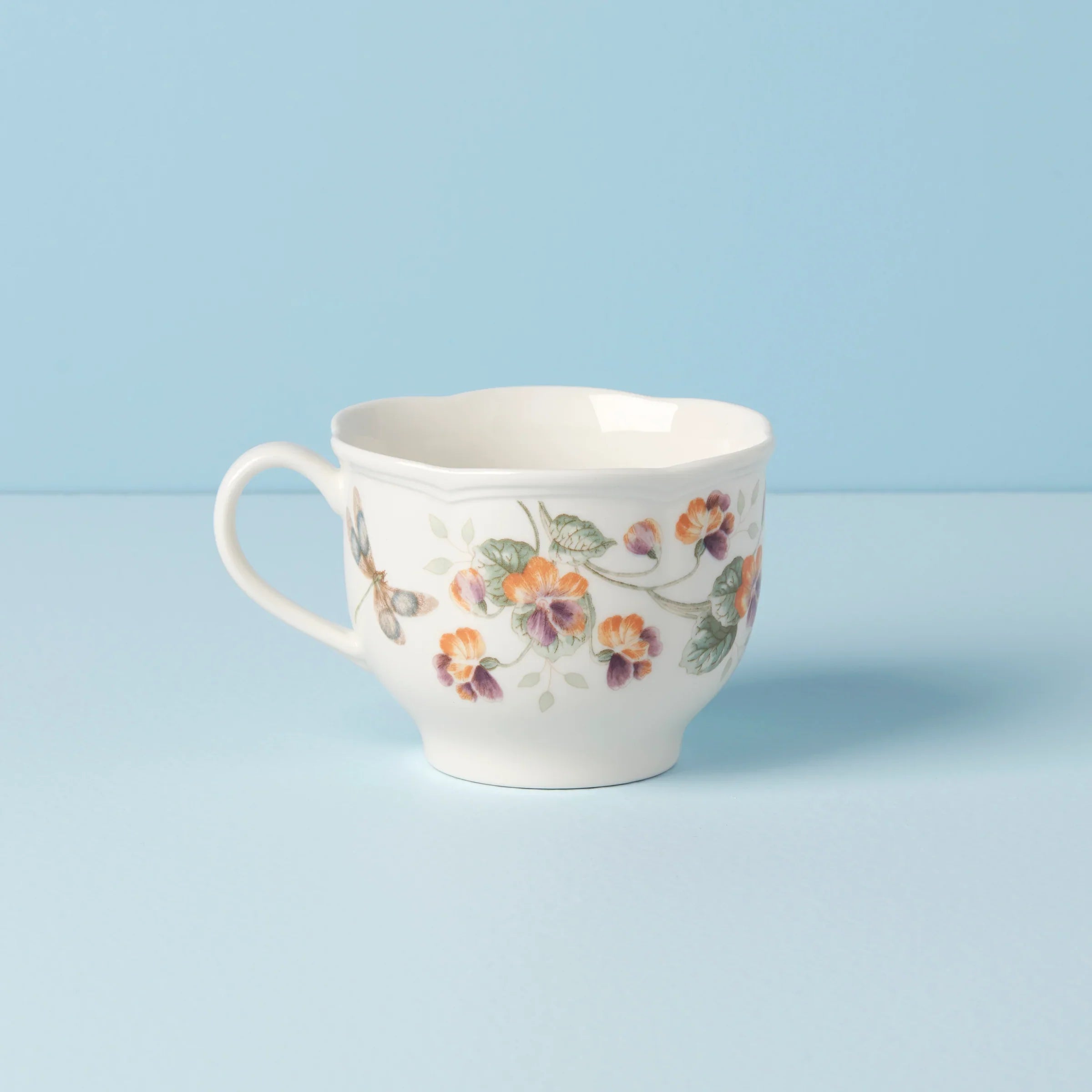Get an extra jolt in the morning or finish off dessert with these lovely latte mugs. Crafted of porcelain in a pristine white color, this durable set will not break or chip in your cabinet. Each piece features our beloved Butterfly Meadow pattern of butterflies and budding florals. We topped it off with a gently scalloped edge for a delightful finish.