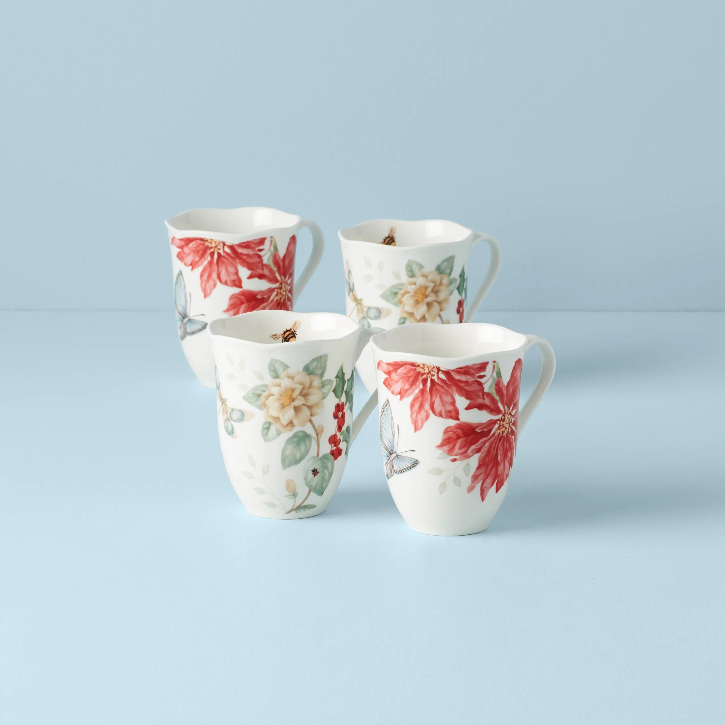 Part of the best-selling Butterfly Meadow collection, these beautiful mugs feature gentle scalloped edges and delicately painted scenes of lush flowers for the holidays. This seasonal set of four is crafted of durable porcelain and is microwave and dishwasher-safe for added convenience.