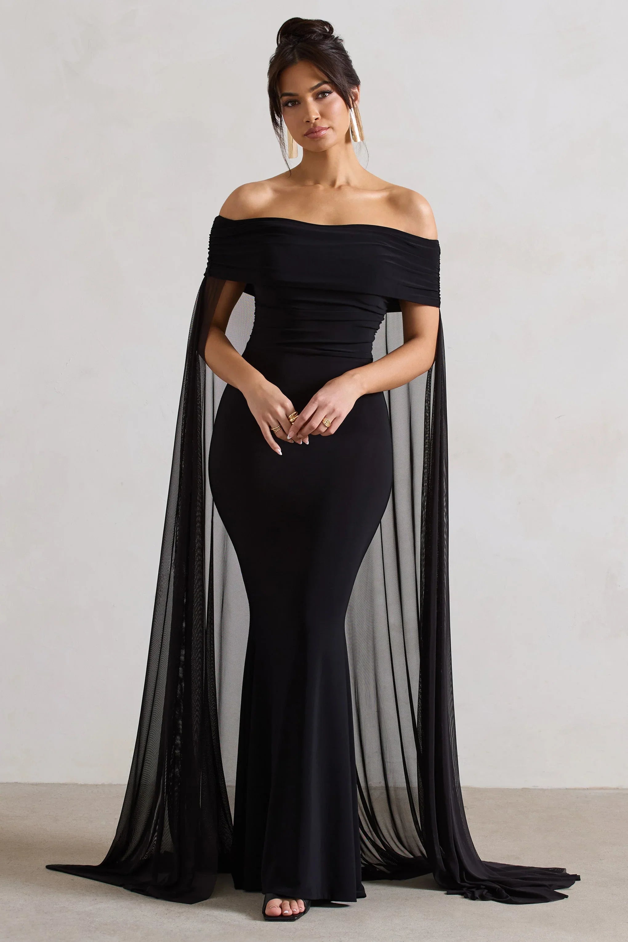 Exude an ethereal state of mind in Carlotta, our captivating cape maxi dress. Defined by a flowing chiffon cape, this black maxi also boasts a timeless bardot neckline and floor length skirt. For the perfect wedding guest ensemble, style yours with a tousled bun and statement earrings.