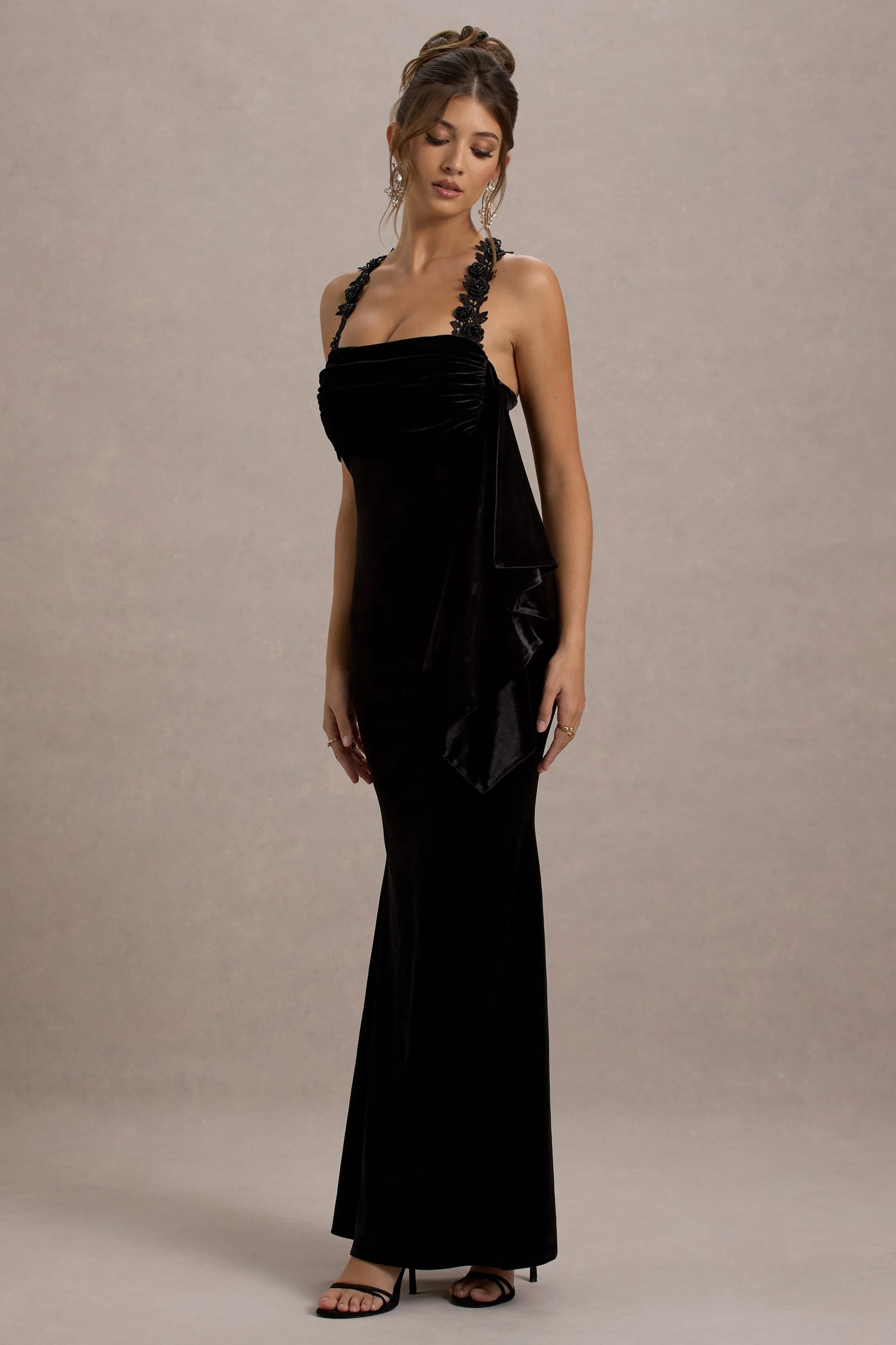 Made for grand entrances, gift your wardrobe with a special piece like Charlize. Crafted in a sumptuously soft black velvet, this floor-sweeper boasts a lace halter neckline, draped sleeve and flowing waterfall drape. Compliment this black maxi dress with some sparkling accents like Coralie during this event season.