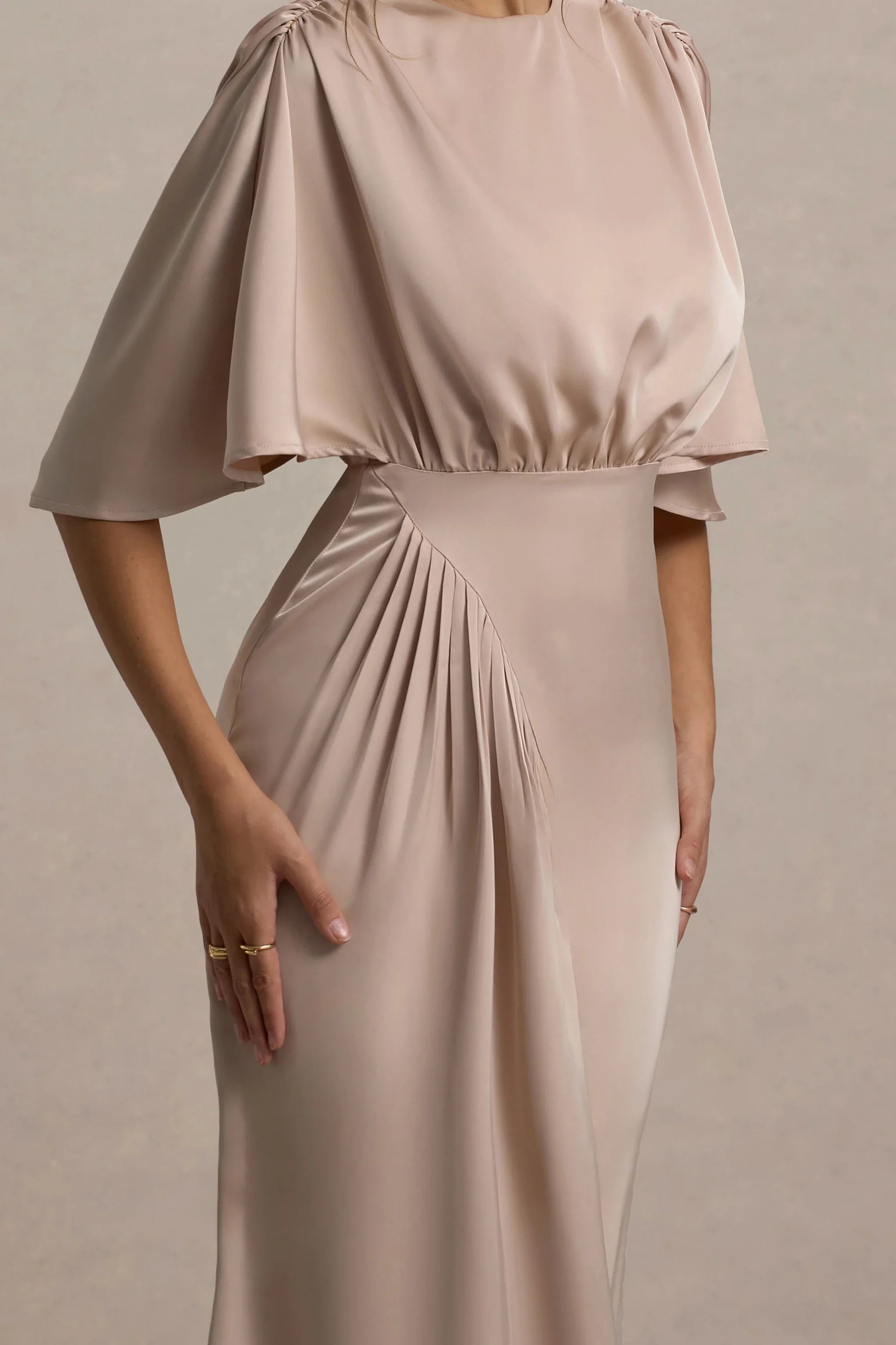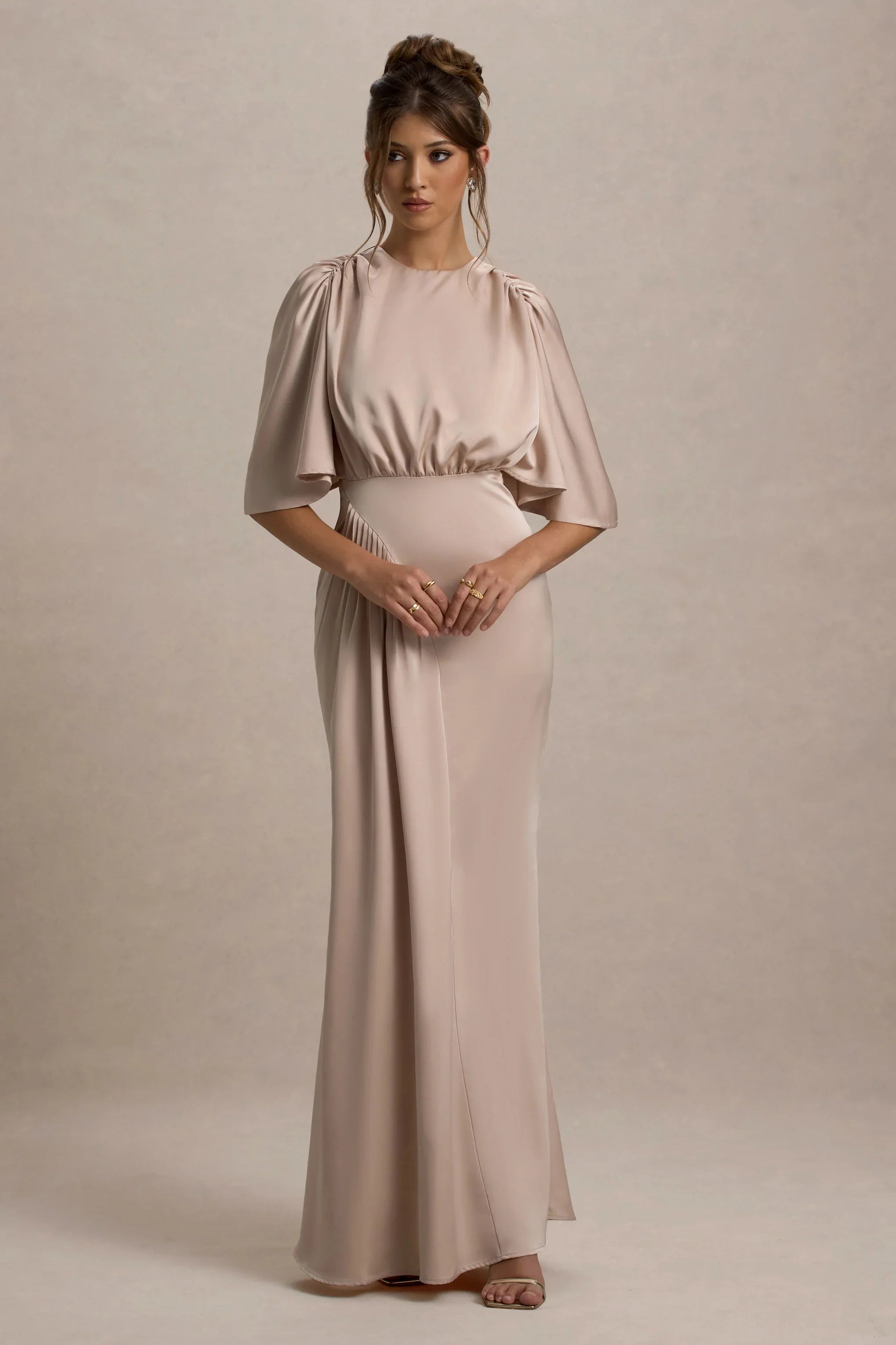 From graduations to wedding parties, Cinder is an elegant choice. Arriving in a rich champagne shade of our premium satin, this floor-sweeper features a classic crew neckline, flowing waterfall sleeves and gathered skirt.
