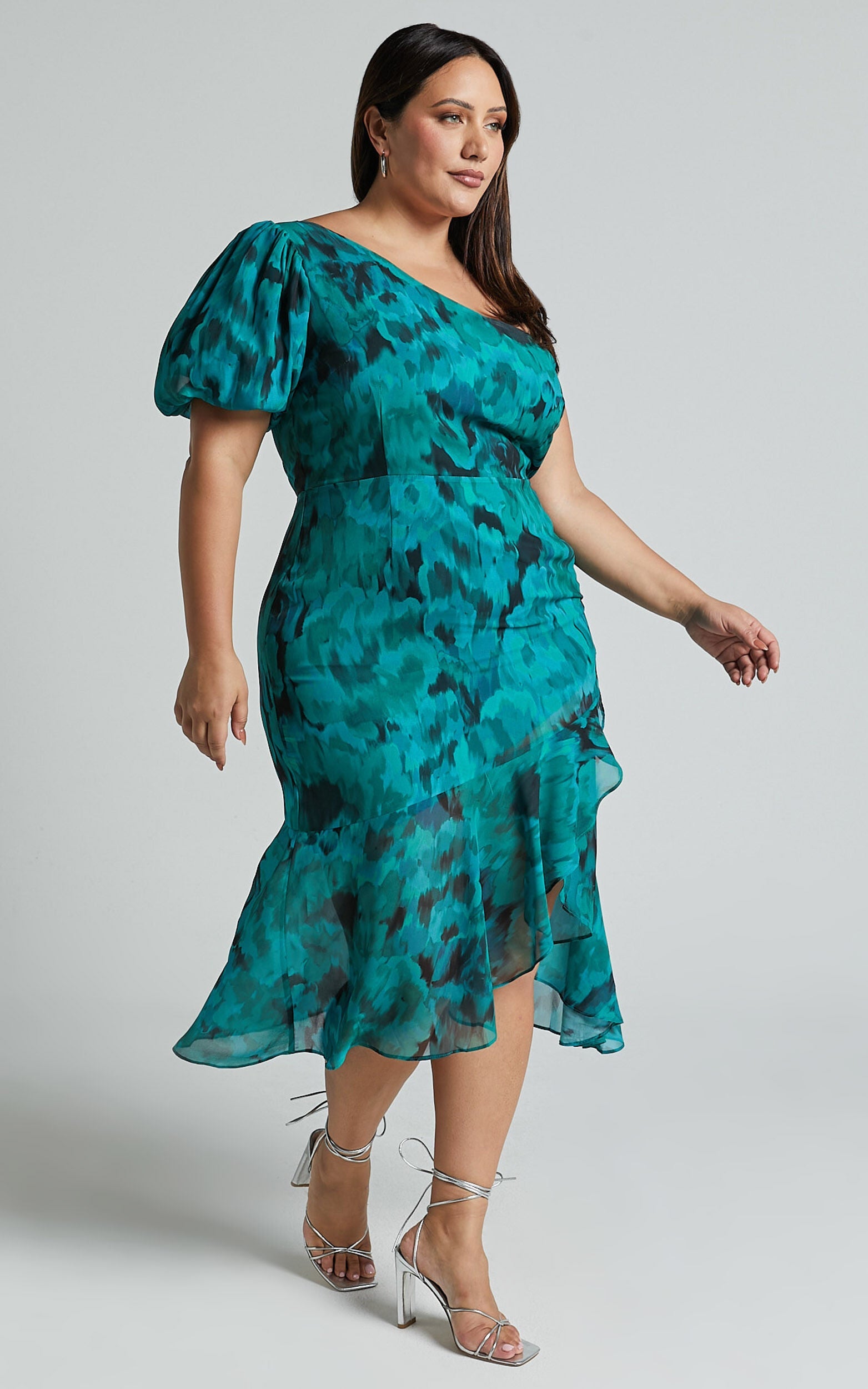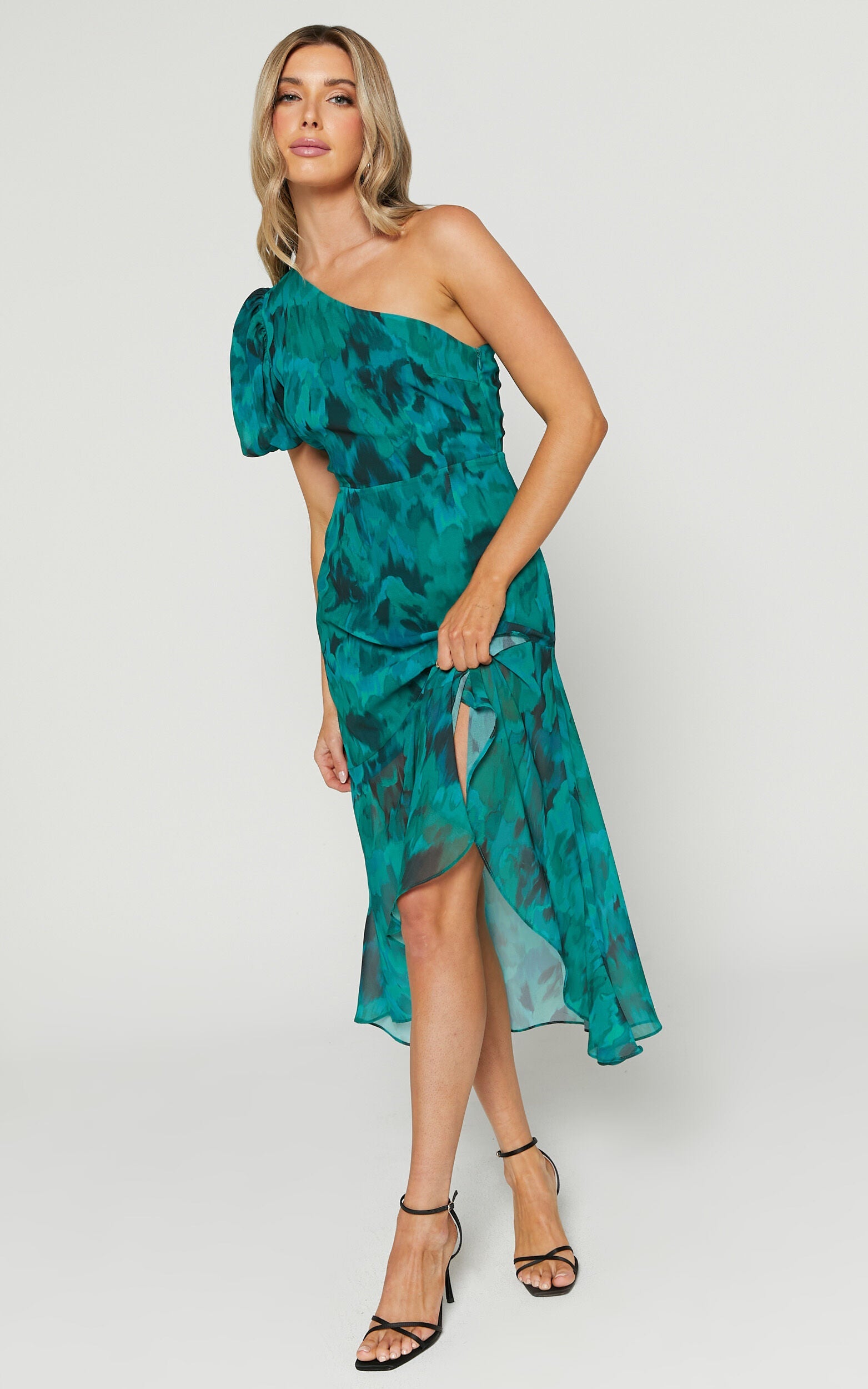 Get ready to turn heads in the stunning Clabelle Midi Dress! This one-shoulder beauty features a ruffle tulip hem and is adorned with an eye-catching emerald blur floral print. Made from luxurious viscose fabric, this dress is perfect for any occasion - whether you're attending a cocktail party, wedding as a guest or hitting the town for a night out with your friends. With its midi length and sleeveless design, it's both elegant and comfortable to wear. Stand out from the crowd and feel confident in this gorgeous green number!