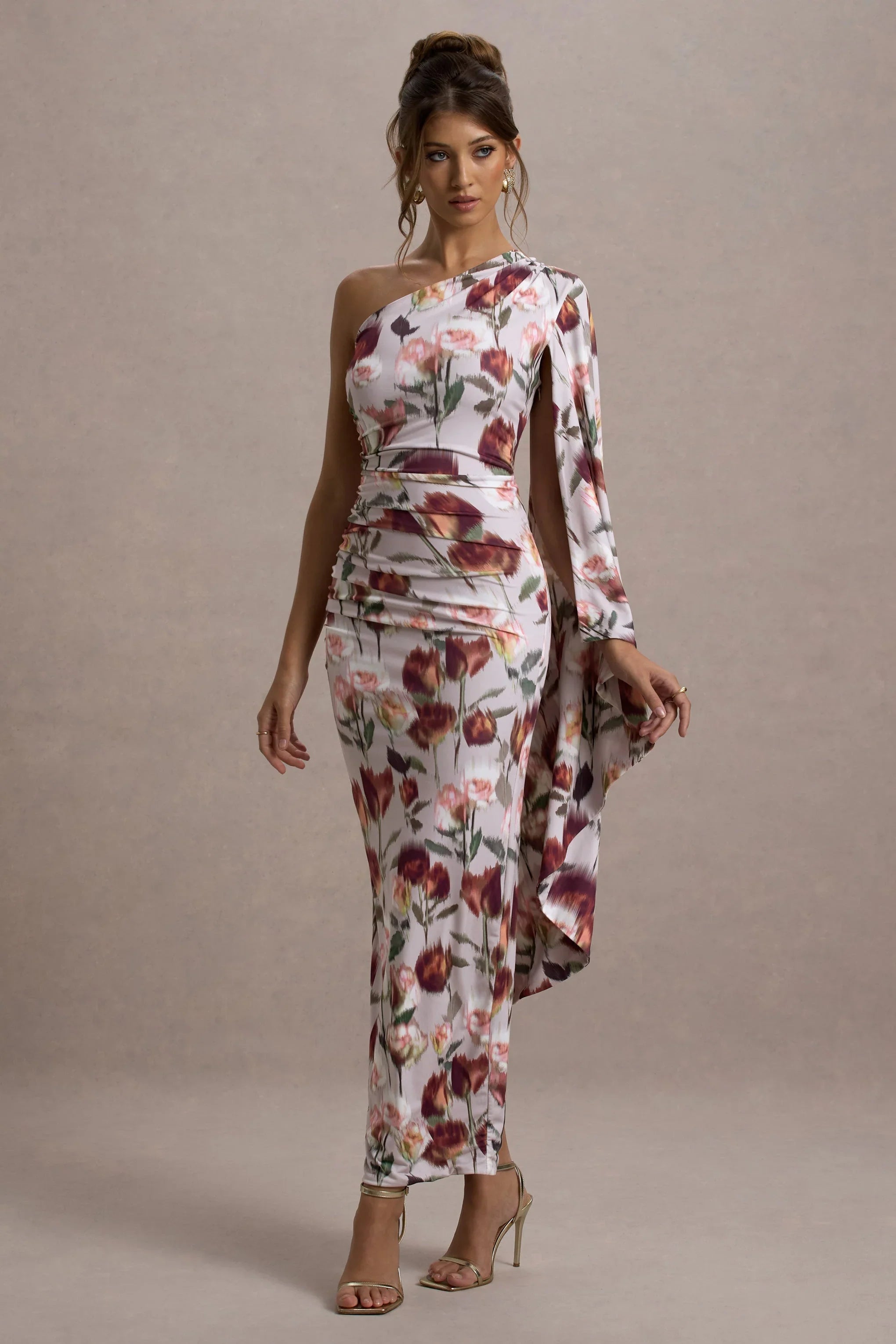 Characterized by its romantic flair and graceful design, Clementina is an exquisite choice for your next special event. Draped in a delicate cream floral print, this maxi dress is crafted from premium jersey for a soft, flattering fit. The asymmetric cape sleeves add a touch of whimsical elegance, while the flowing silhouette creates a timeless, ethereal appeal. Perfect for garden parties or evening soirees, let Clementina take centre stage with simple jewellery and understated heels for a look that’s effortlessly enchanting.