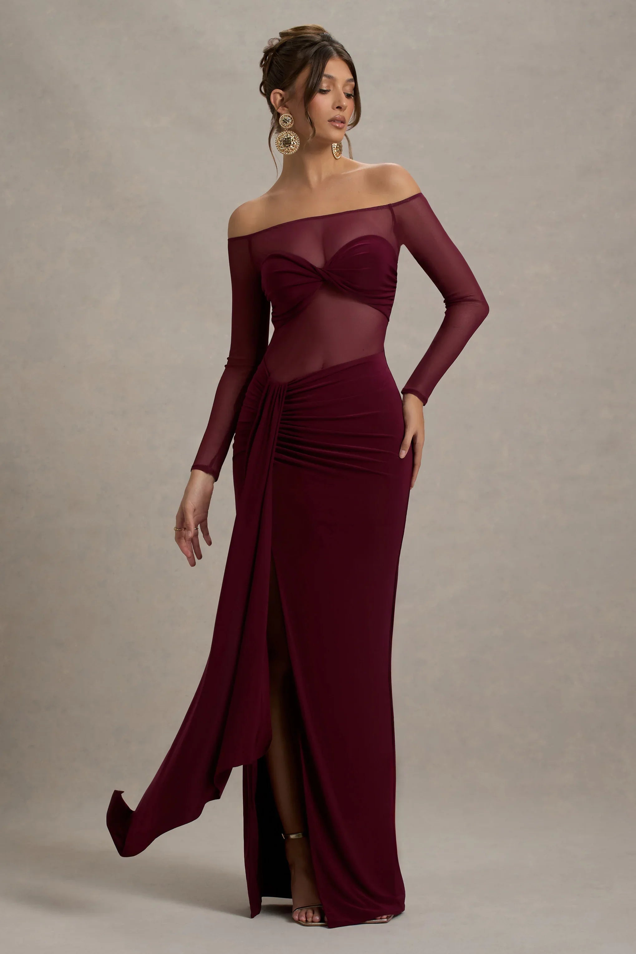 Oozing after-dark glamour, this burgundy maxi was designed for special events. Expertly crafted in a premium jersey and mesh combination, this floor-sweeper is detailed by a bardot neckline, long sheer sleeves and a twisted bralet detail. Complete with a split skirt and artful drape, compliment yours with some gold stilettos like Pluto.