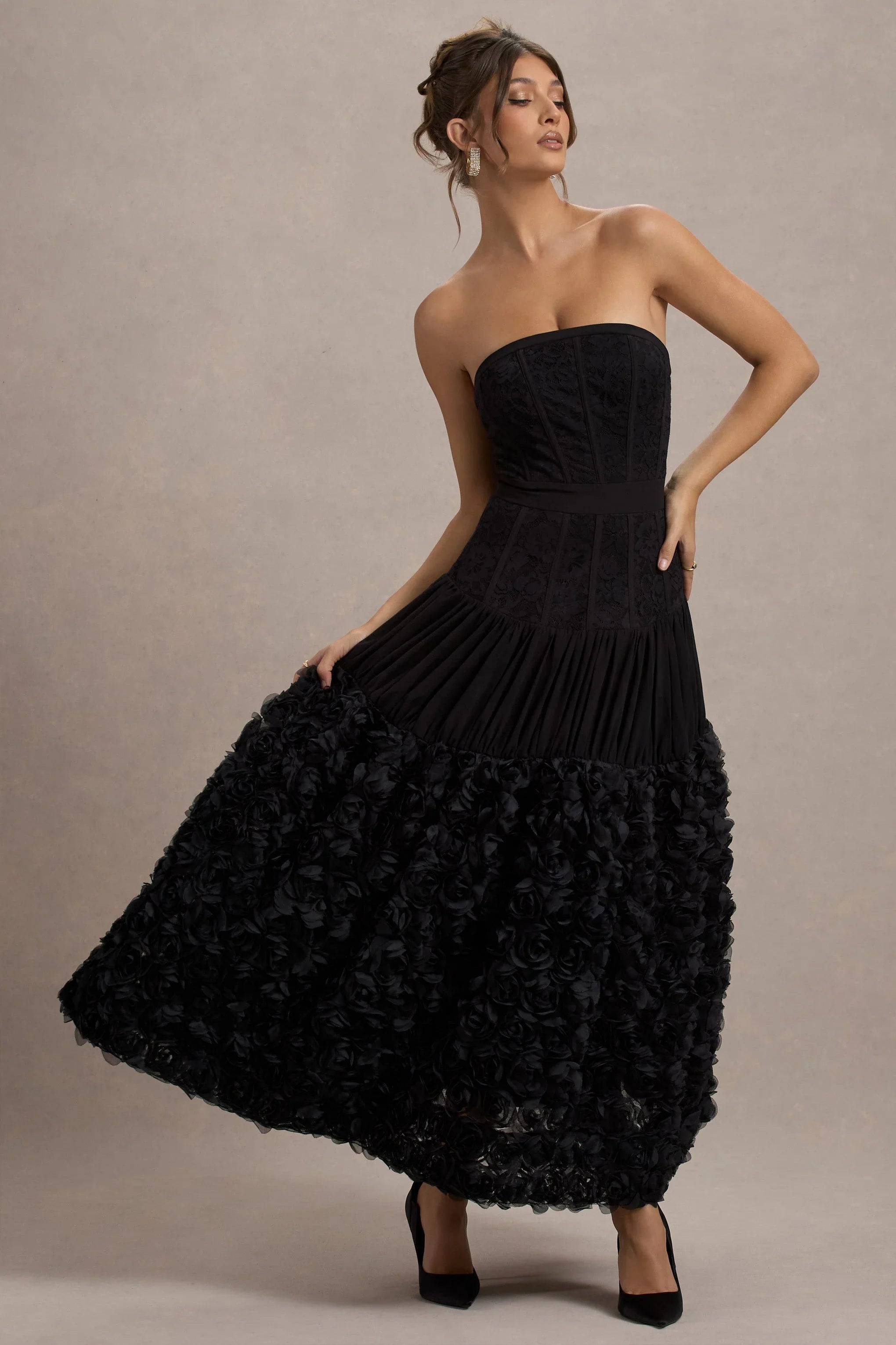 Defined by its intricate lacework and feminine details, Dame is a captivating choice for your next special occasion. Crafted from our premium mesh and lace, this black bandeau midi dress showcases a fitted corset silhouette that exudes elegance. The floral hem adds a touch of romantic drama, creating a striking contrast against the sleek design. Perfect for evening events or a night out, keep Dame in the spotlight with minimal accessories and classic heels for a look that’s equal parts sophisticated and unforgettable.