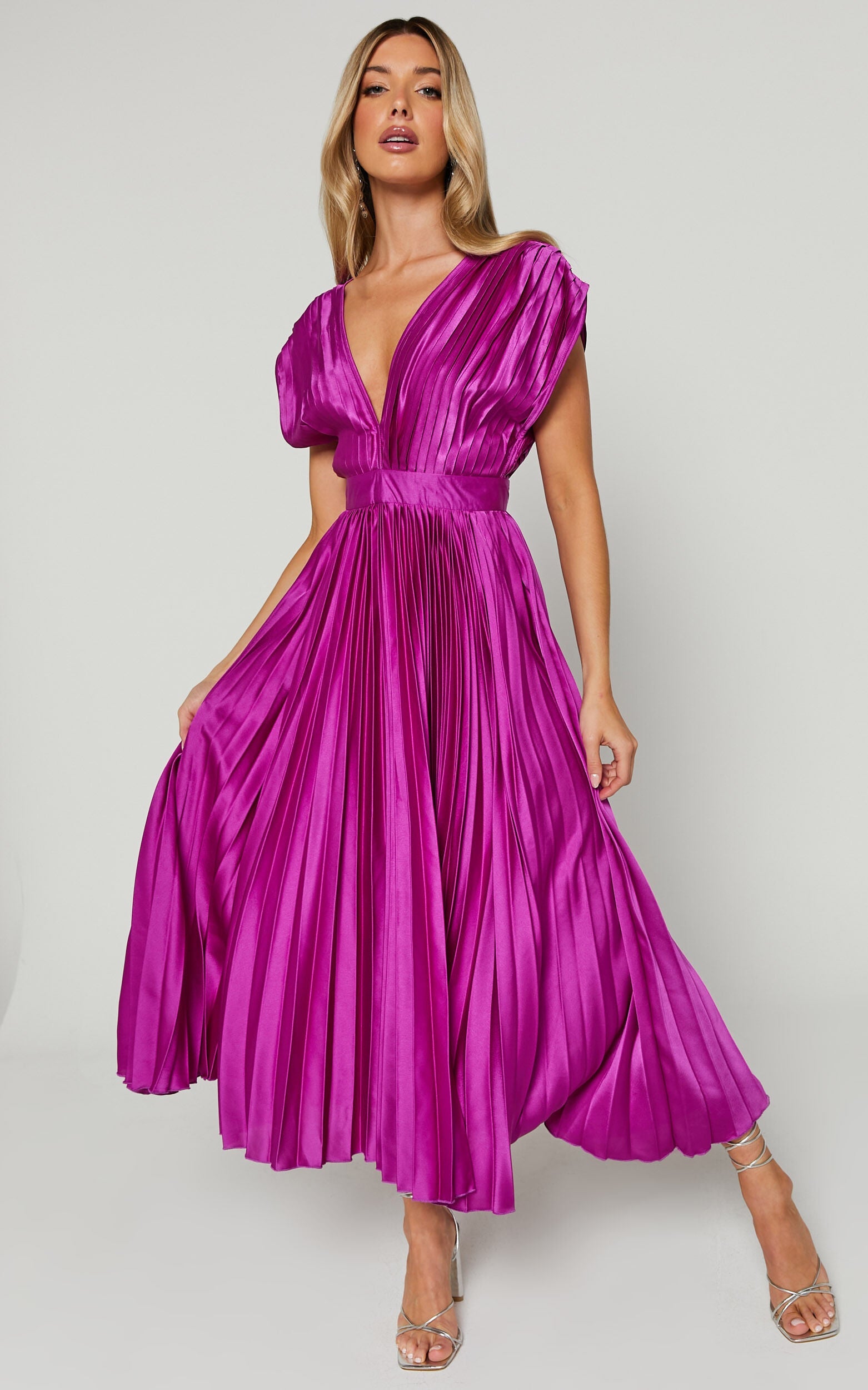 Make a statement at your next formal event with the Della Maxi Dress in Grape. This stunning purple dress features a plunging neckline and short sleeves, perfect for showing off your sense of style. The pleated design adds an elegant touch, while the maxi length creates a sophisticated look. Whether you're attending a wedding or hitting the dance floor at prom, this dress is sure to turn heads. Embrace your inner fashionista and step into the spotlight with confidence in the Della Maxi Dress - because every girl deserves to feel like royalty.