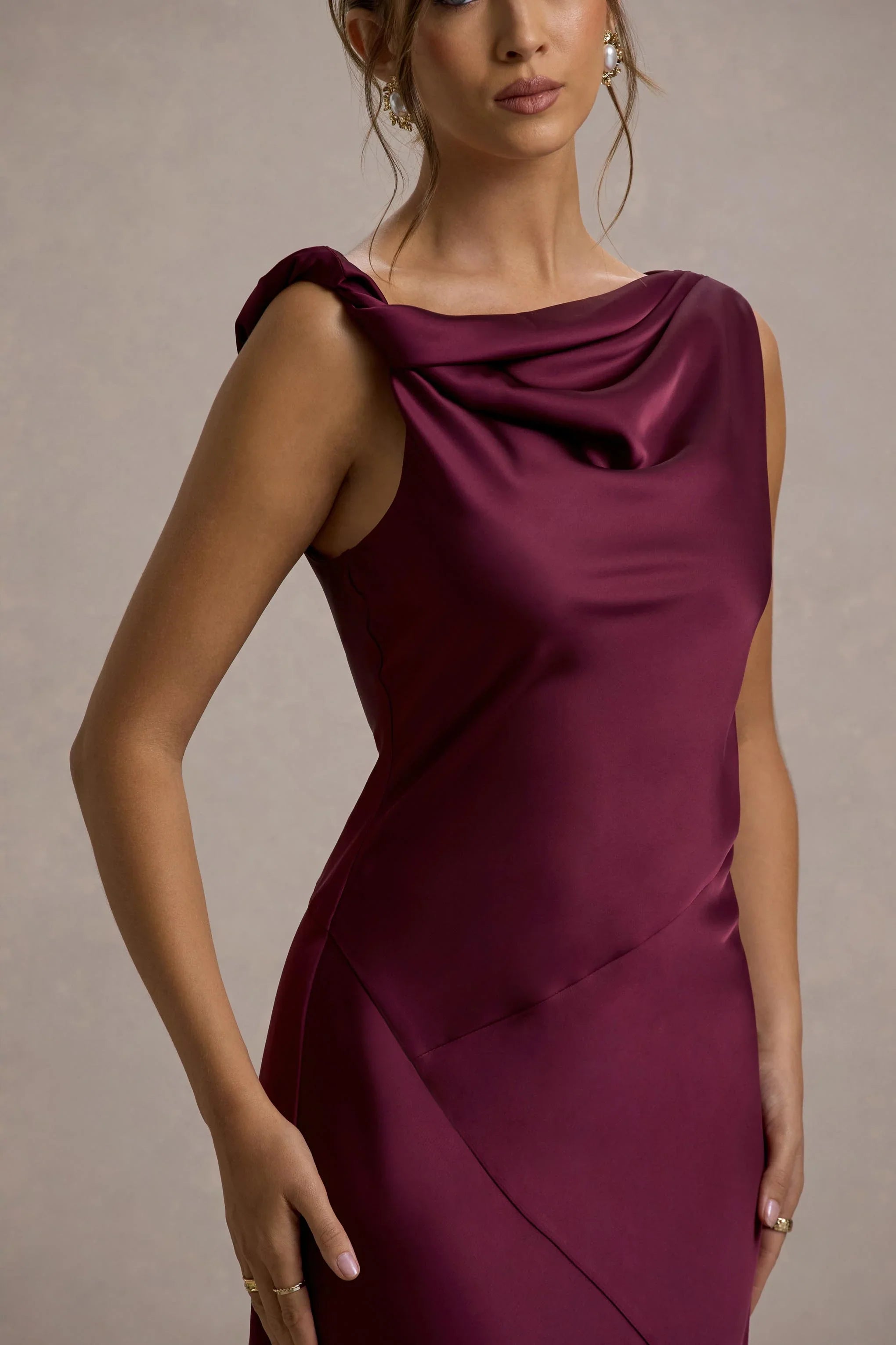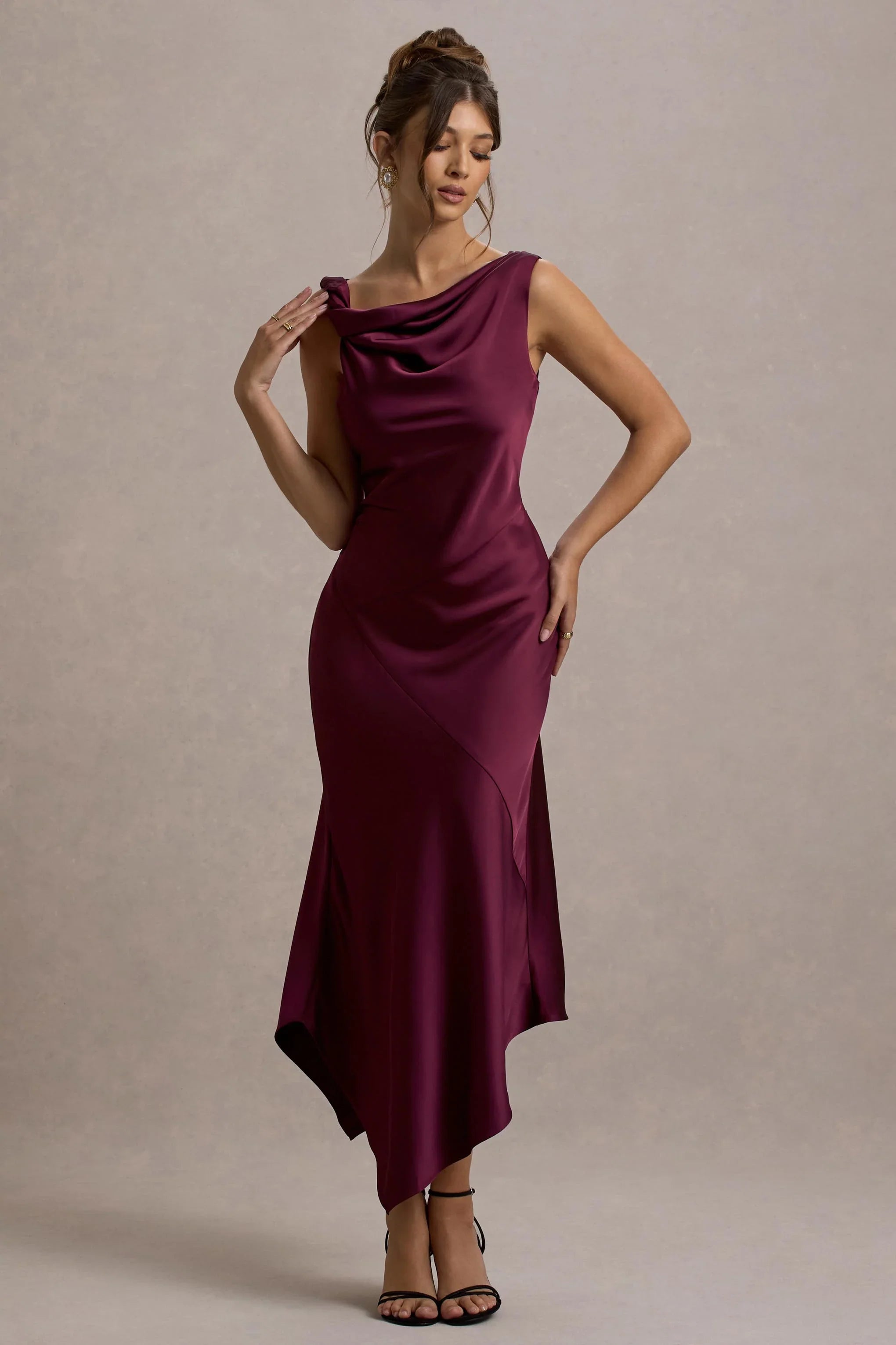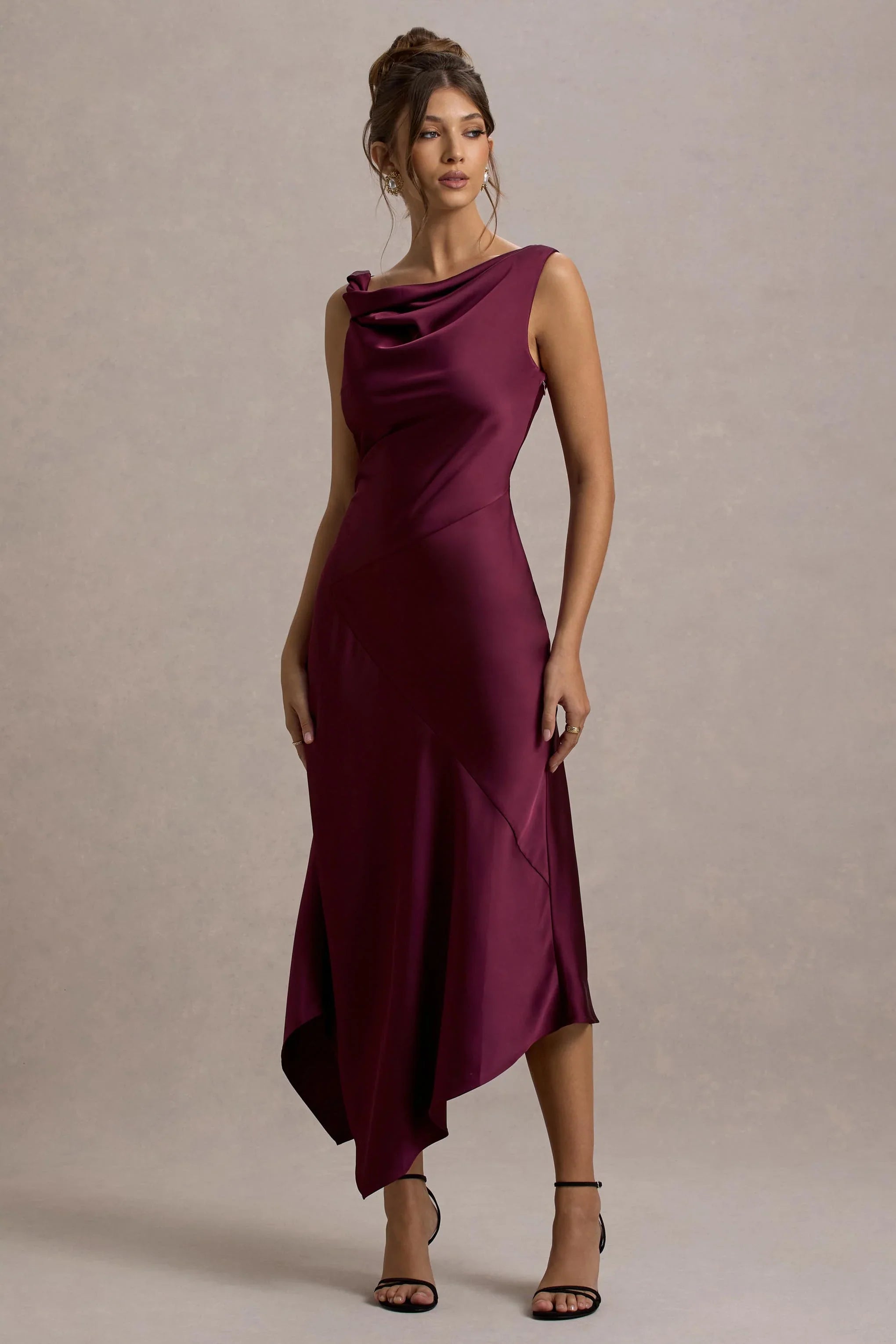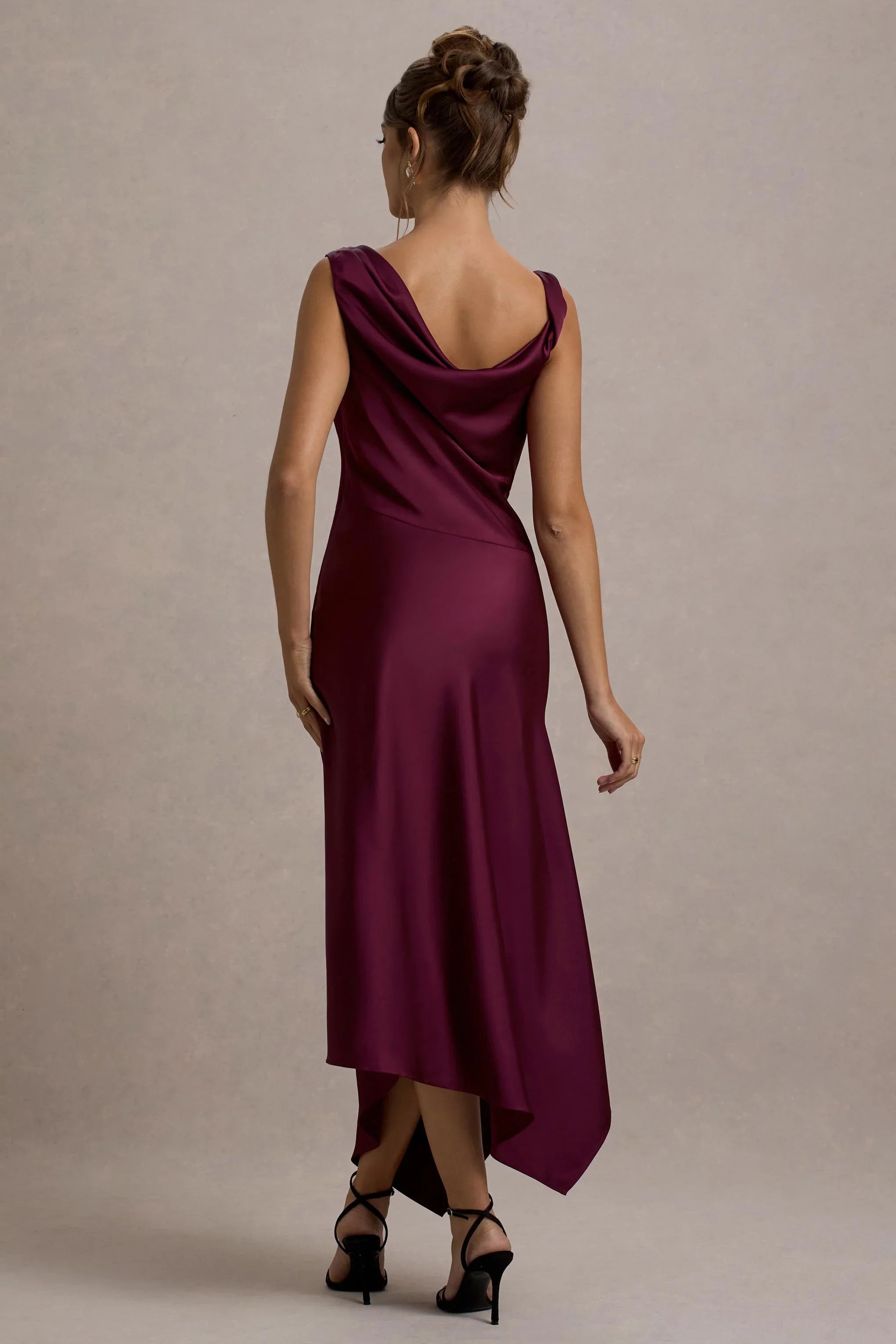 Defined by sleek sophistication and a rich, bold hue, Donelli is a striking option for your next special occasion. Crafted from our luxurious premium stretch satin, this plum midi dress features an elegant asymmetric neckline that adds a contemporary twist to a classic silhouette. Finished with fluid draping that falls to a chic midi length, keep Donelli in the spotlight with a statement clutch for a look that embodies modern glamour.