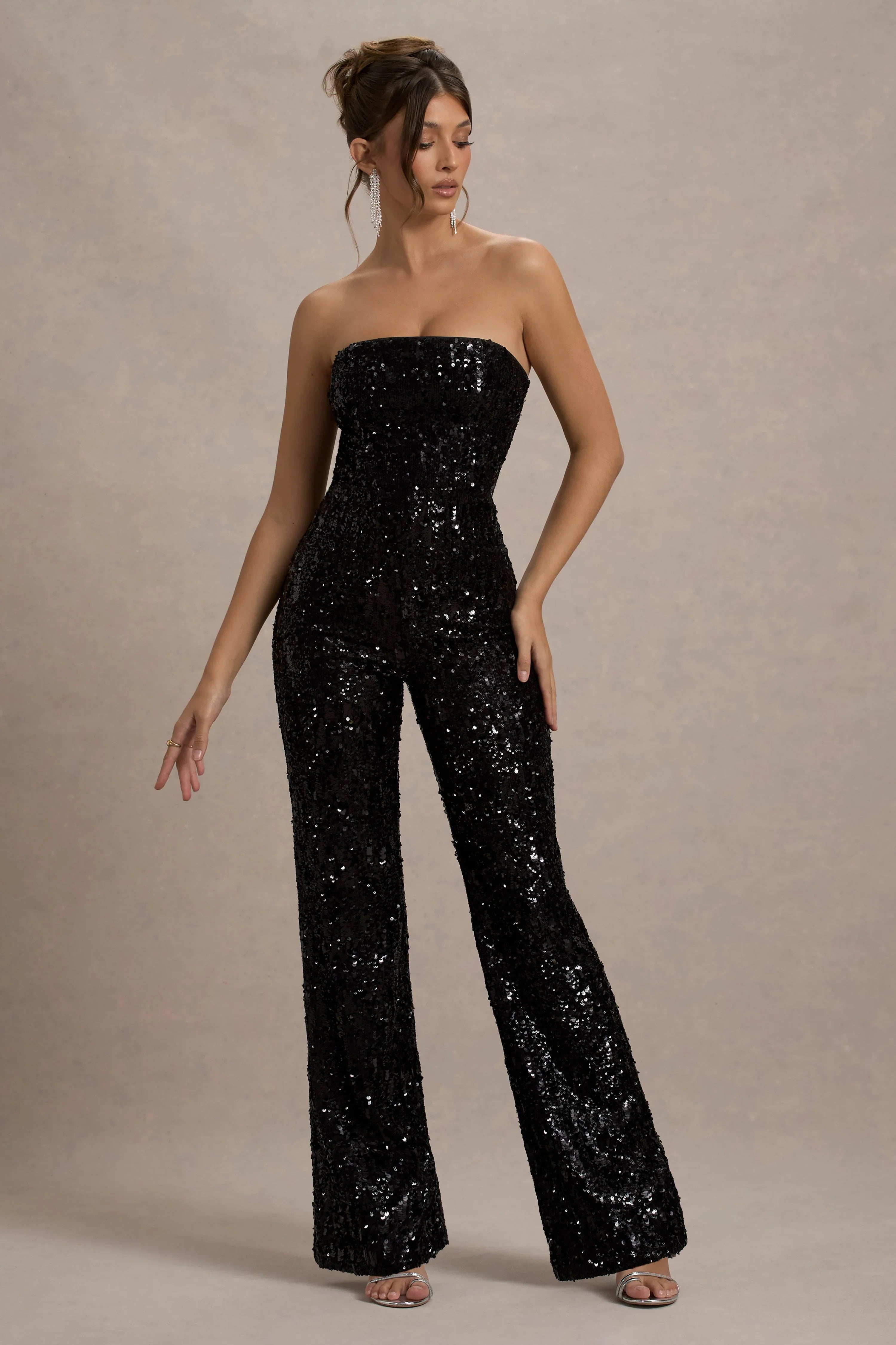 Shine bright in our latest Elation jumpsuit. Meticulously crafted from premium sequin for a dazzling finish, this eye-catching jumpsuit features a flattering strapless neckline and a flared leg, perfect for making a bold statement. Pair it with sleek heels and minimalist accents for a show-stopping evening look, or add a metallic clutch for an extra touch of glamour.