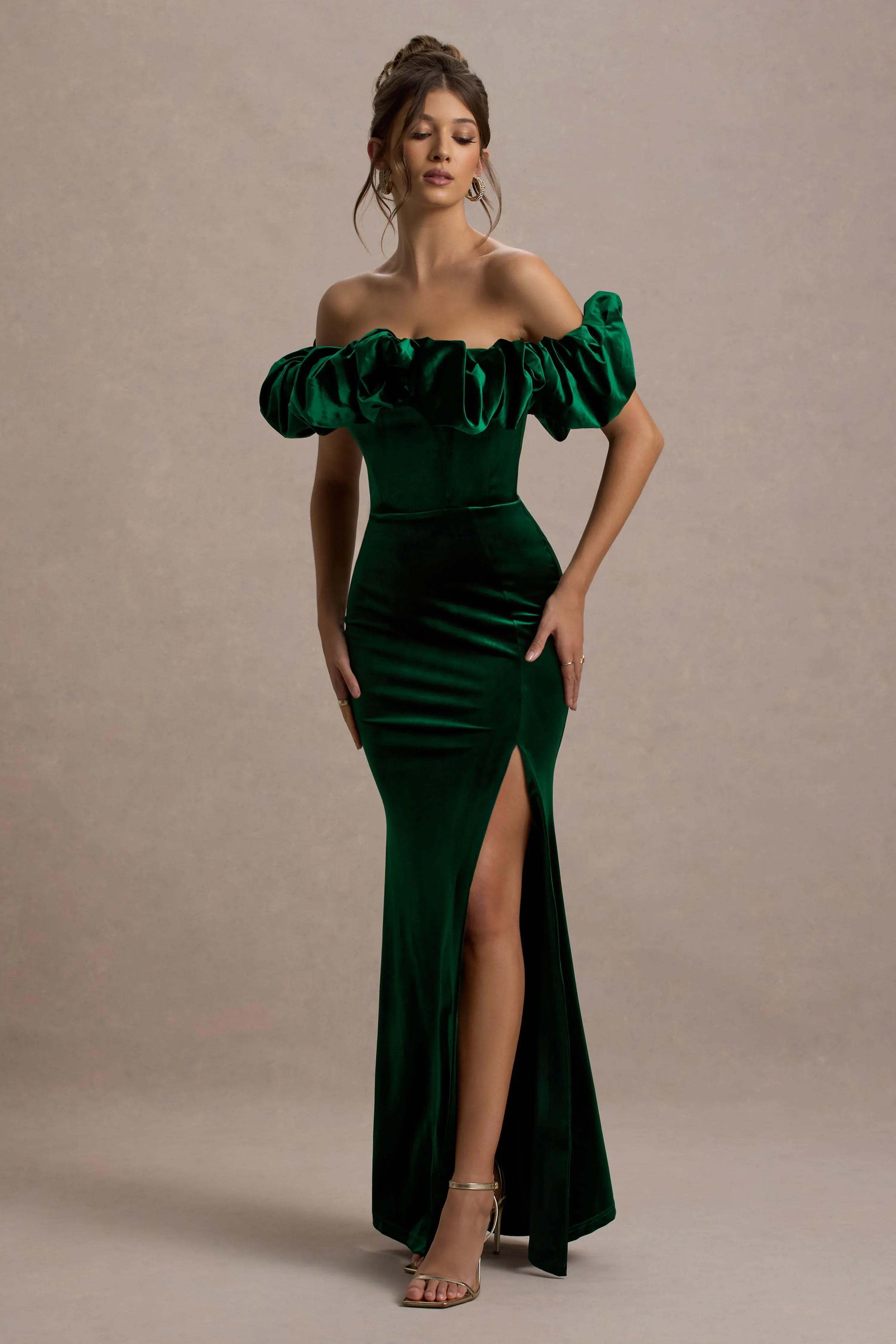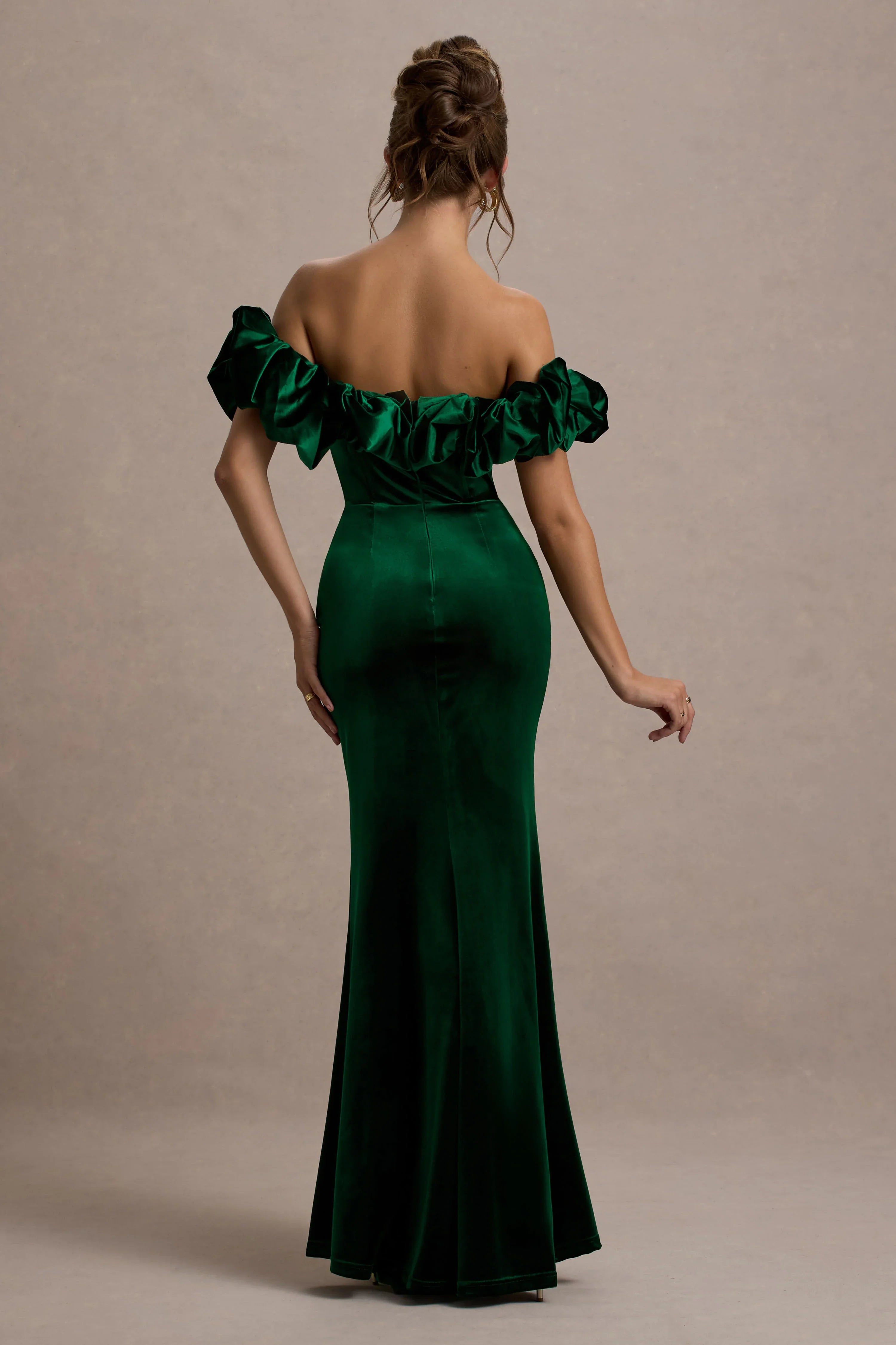 A fine trim of voluminous ruffles makes this short-sleeved maxi dress truly unforgettable. Perfect for bridesmaids or an upcoming birthday, our Esmeralda boasts a bardot silhouette made from luxurious green velvet with darts to define your waistline. More darts shape a floor-sweeping skirt which also features a striking side split.