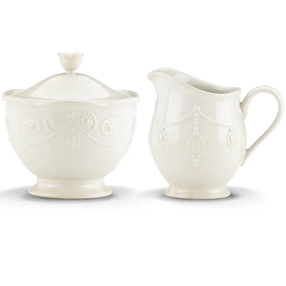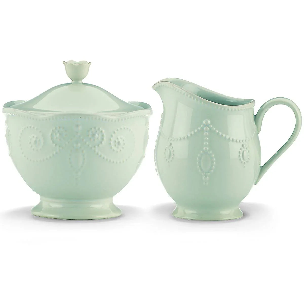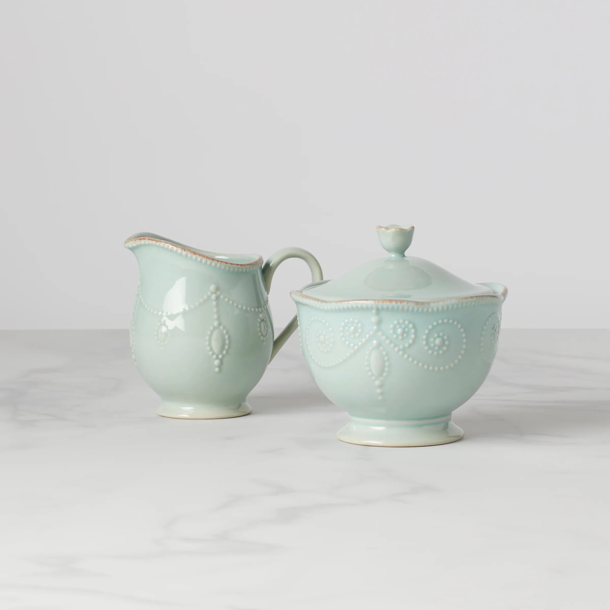 This sugar bowl and creamer set, made of durable ceramic stoneware, is an ideal choice for serving guests a hot cup of coffee or tea. Its serene ice blue color gives it a graceful air, while the tea-stained scalloped rim and dots make the set heirloom quality. This item is microwave and dishwasher-safe, for added convenience.