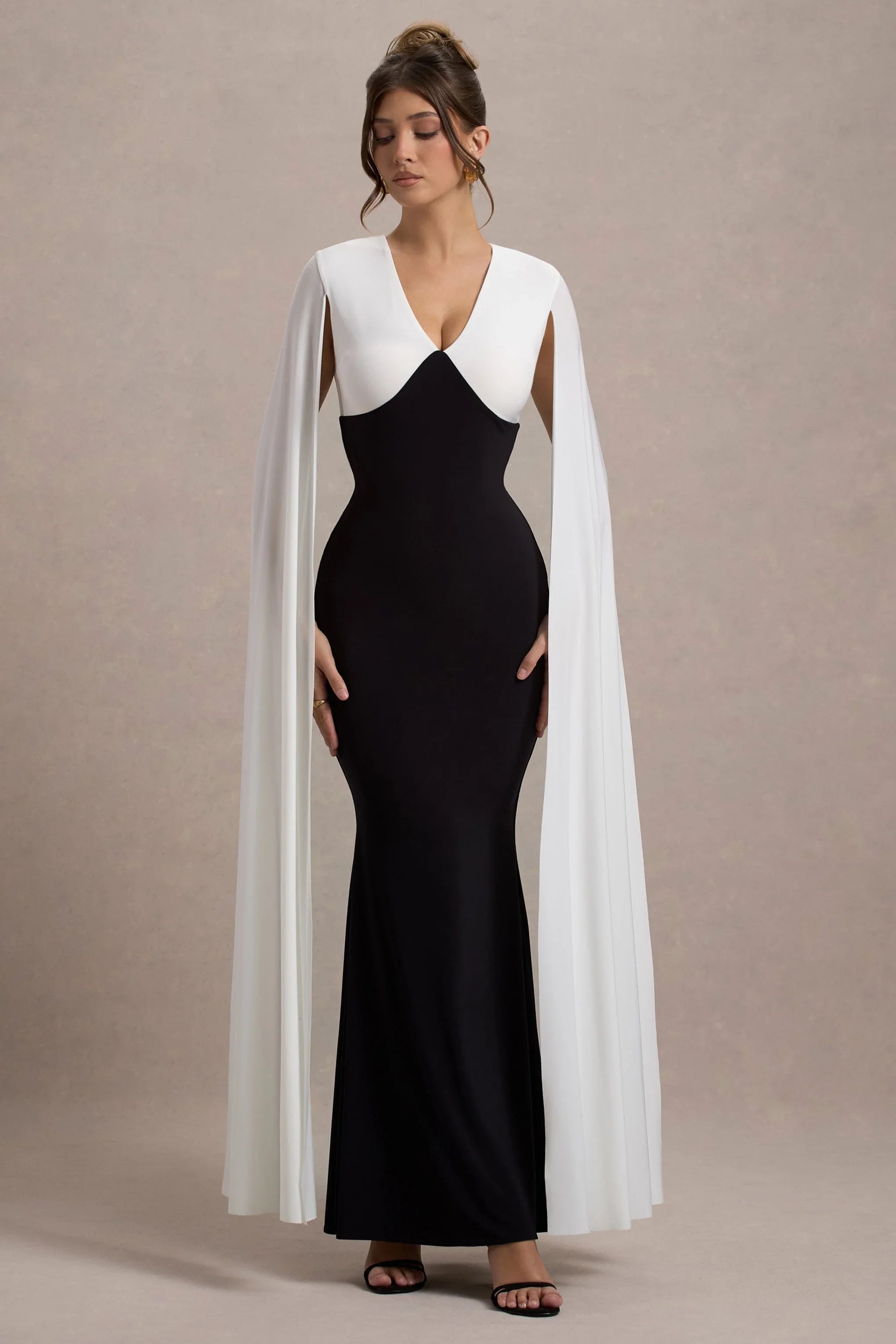 Defined by its timeless elegance and sophisticated details, Grace Kelly is a showstopping choice for your next special event. Crafted from our premium jersey, this black and white maxi dress features a daring plunge neckline that adds a touch of drama. The flowing cape sleeves evoke a sense of classic glamour, while the sleek silhouette ensures a flattering fit. Perfect for a formal evening or gala, let Grace Kelly shine with understated accessories and a chic updo for a look that embodies effortless grace and style.