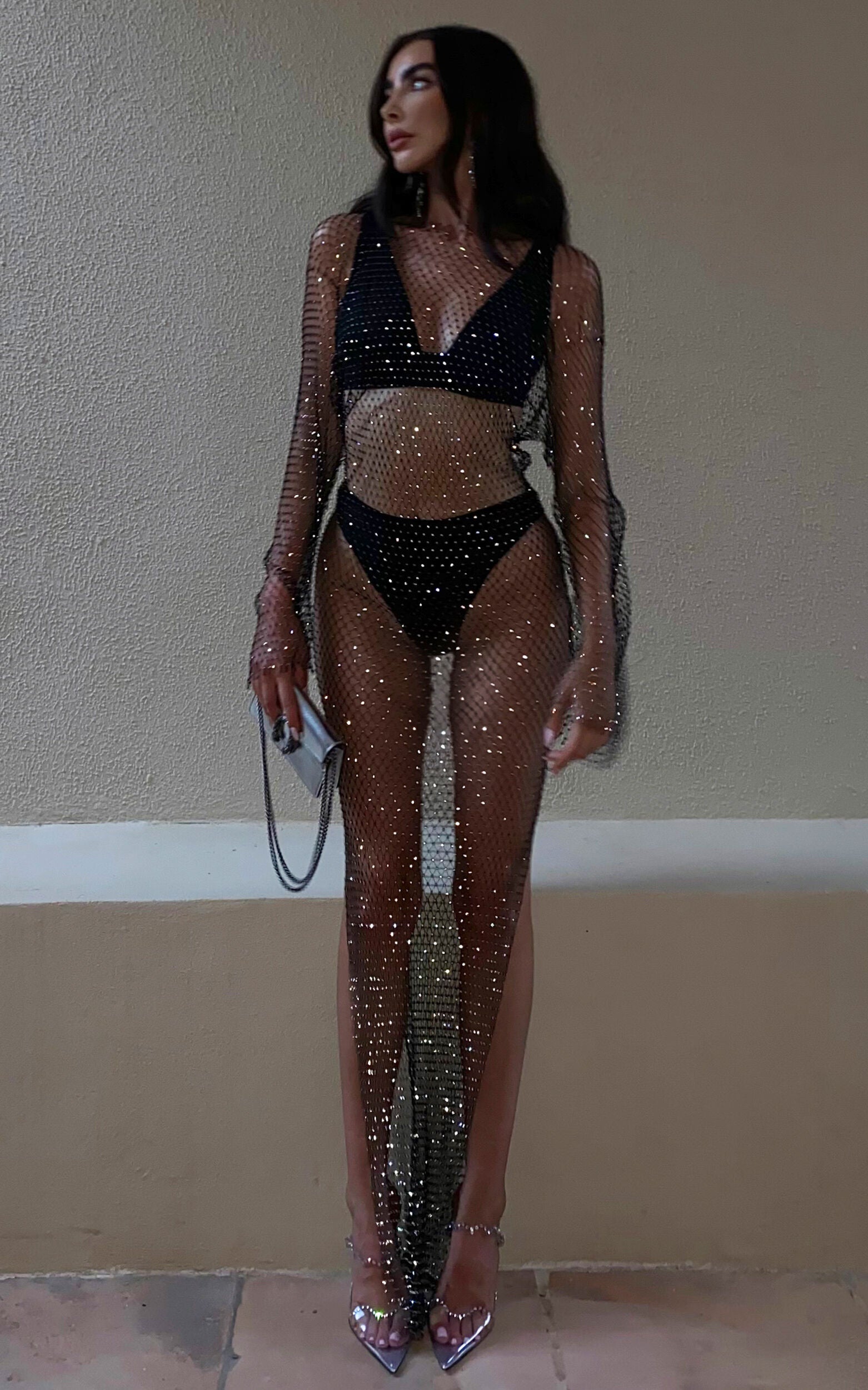 Go bold this party season with the Hanica Dress! This skin-baring maxi features diamante detailing, a high neckline, long flared sleeves and side splits on each side. It's a?risqu�� piece that is perfect for layering and will have you serving body-ody-ody.?Wear it over a bralette like our Browielyn Satin Trim Bralette Top in Black and briefs or a maxi skirt like our Elvie High Split Midi Skirt in Black. Finish the look off?with strappy heels and statement jewellery, and voila! You're ready to party it up like there's no tomorrow!