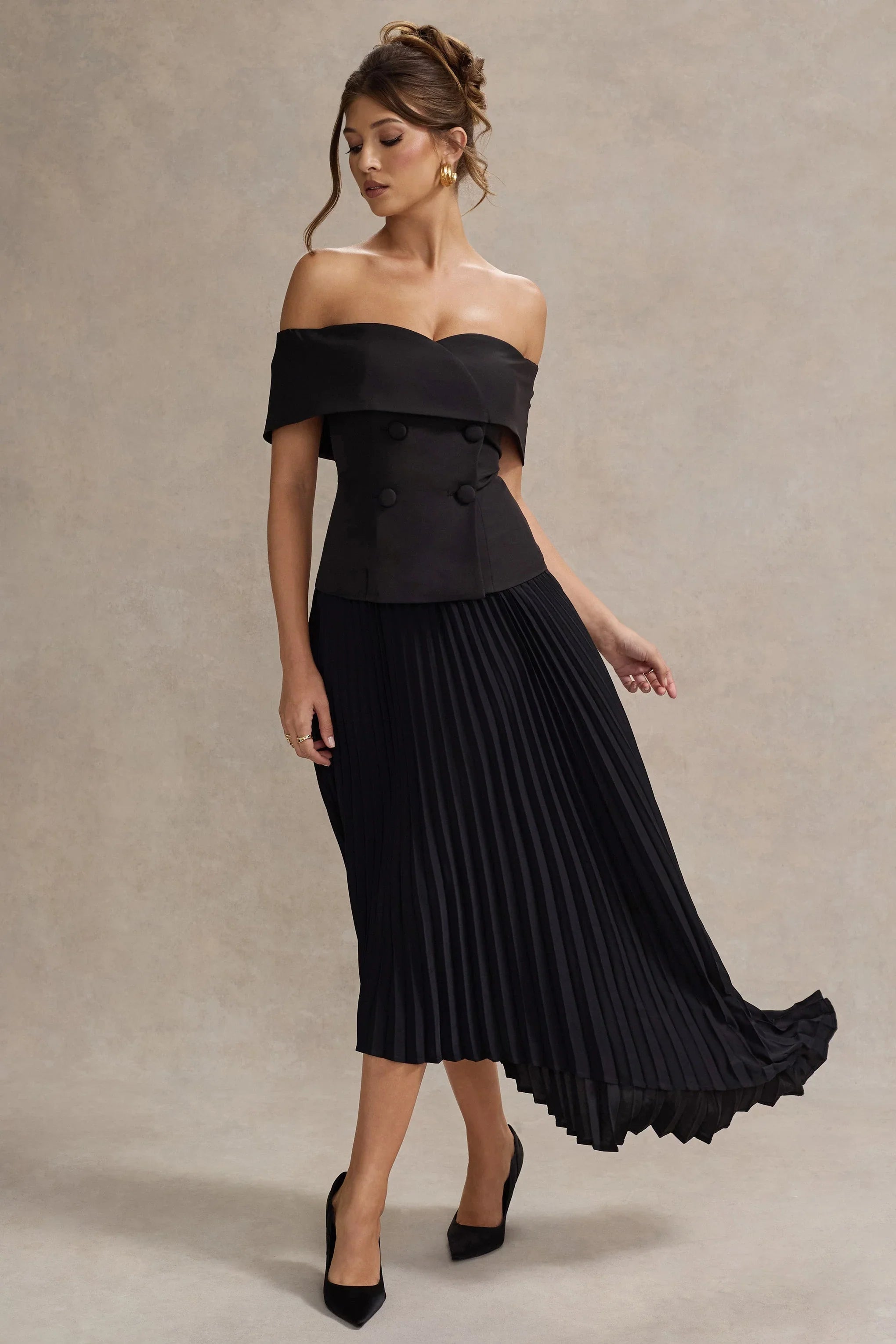 Exude elegance in Hattie, our sophisticated midi dress. Crafted in a classic black shade, this tailored piece boasts a bardot neckline and double breasted bodice topped with mock buttons. Finished with a satin plisse skirt and asymmetric hemline, style yours with our Flashing Lights stilettos for a classic wedding ensemble.
