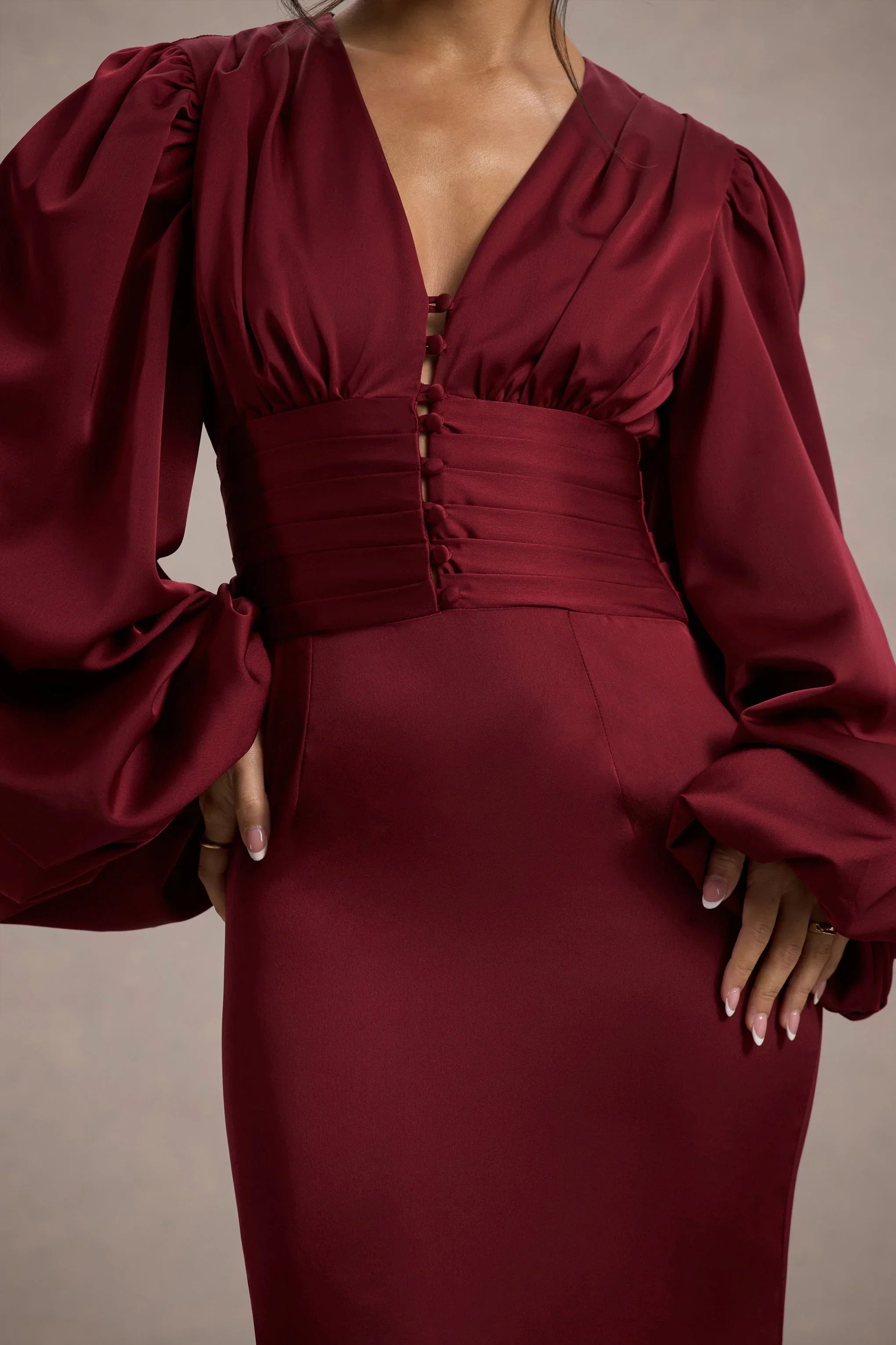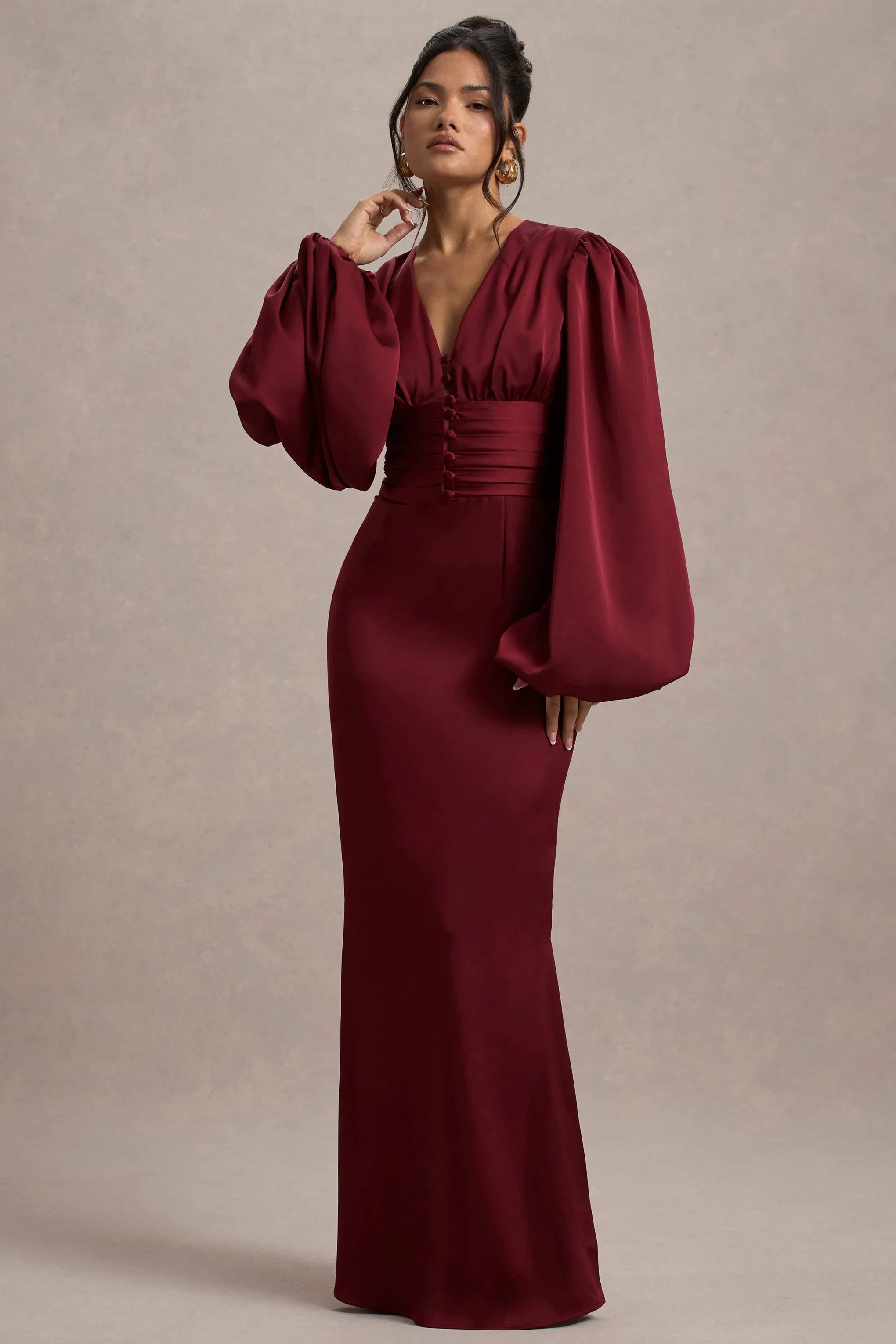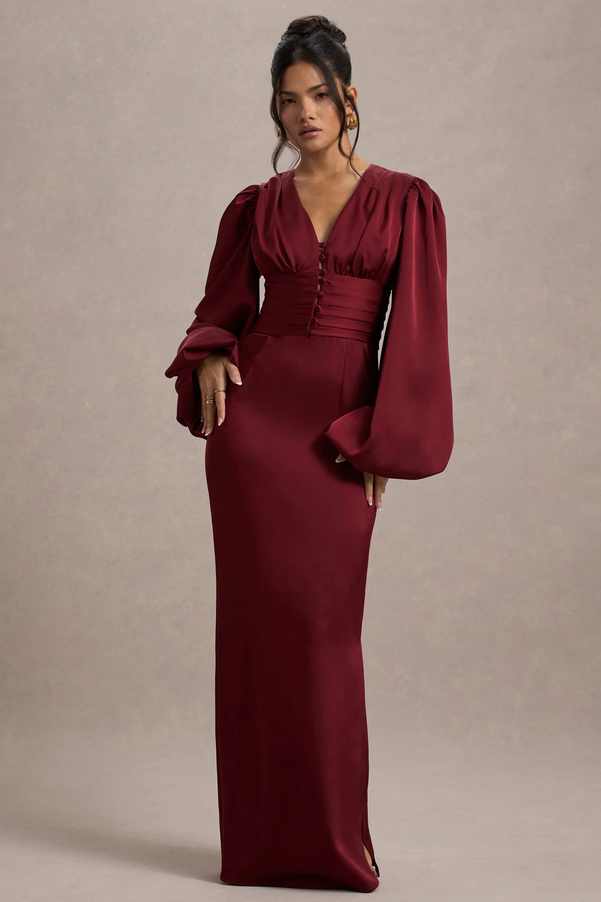 A stand-out staple, Helsinki is on everyones wish list this season. Designed in a sumptuous berry satin, this maxi dress is detailed by a timeless plunge neckline, billowy balloon sleeves and dainty self-covered buttons. Complete with a flattering waist panel, Helsinki is proof that simple silhouettes can have the most impact.