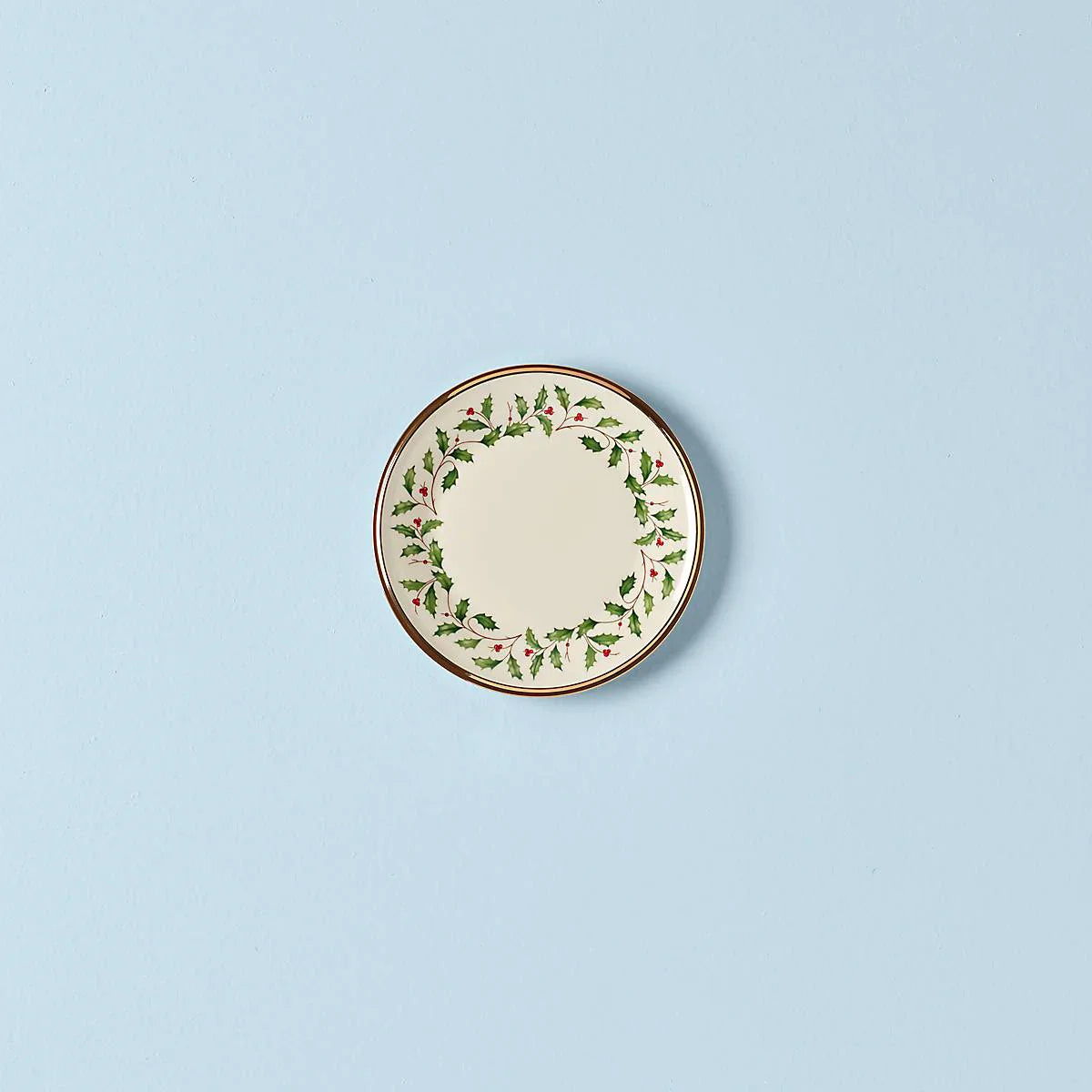 Part of the time-honored Lenox Holiday Dinnerware Collection, our holly and berry motif adorns the surface of this Holiday Bread Plate. Crafted from porcelain with a rich, 24-karat gold trim for an opulent, holiday-themed tableware addition.