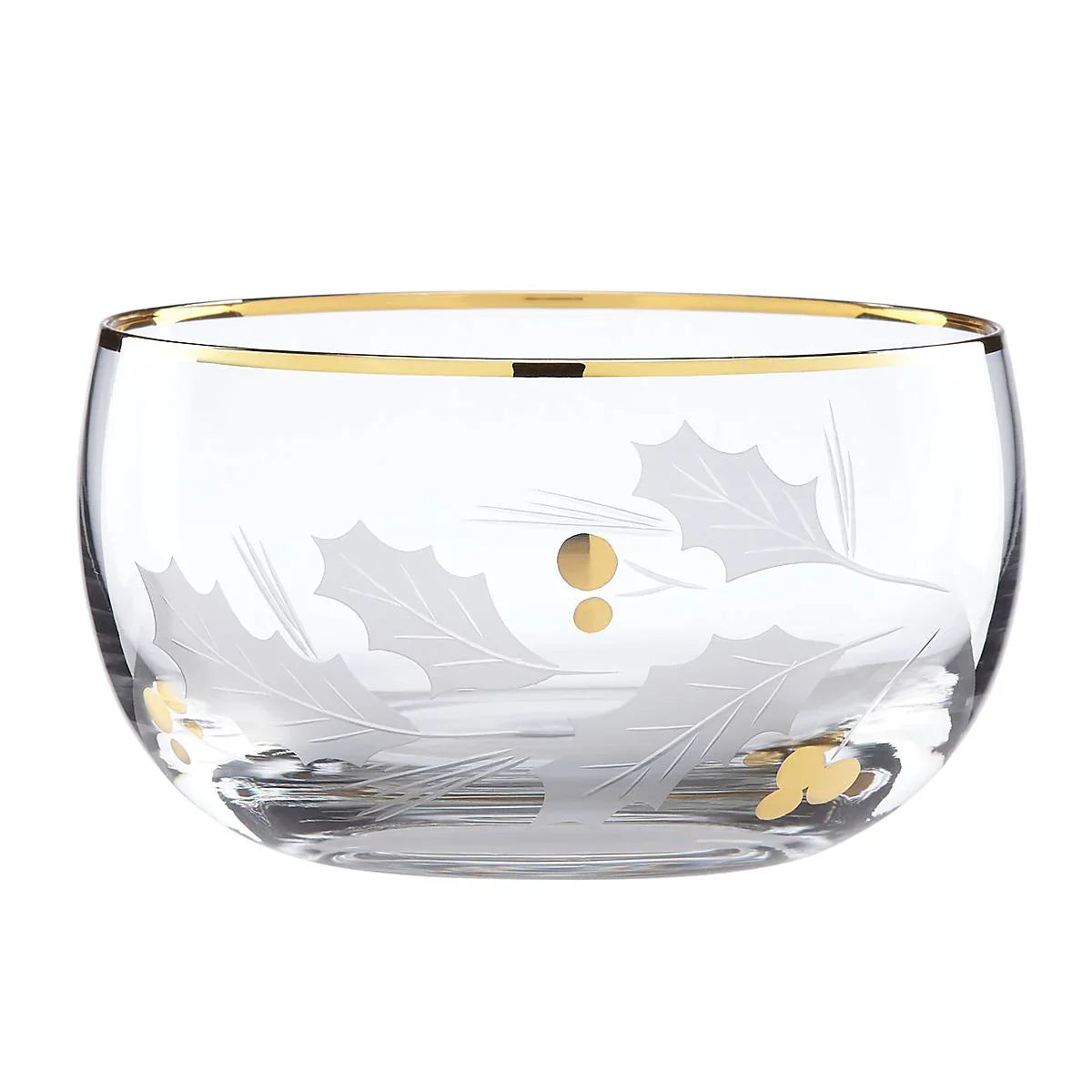 Etched holly leaves with golden berries form an elegant holiday pattern on this glass bowl. A delicate gold finish creates a polished design around the rim.