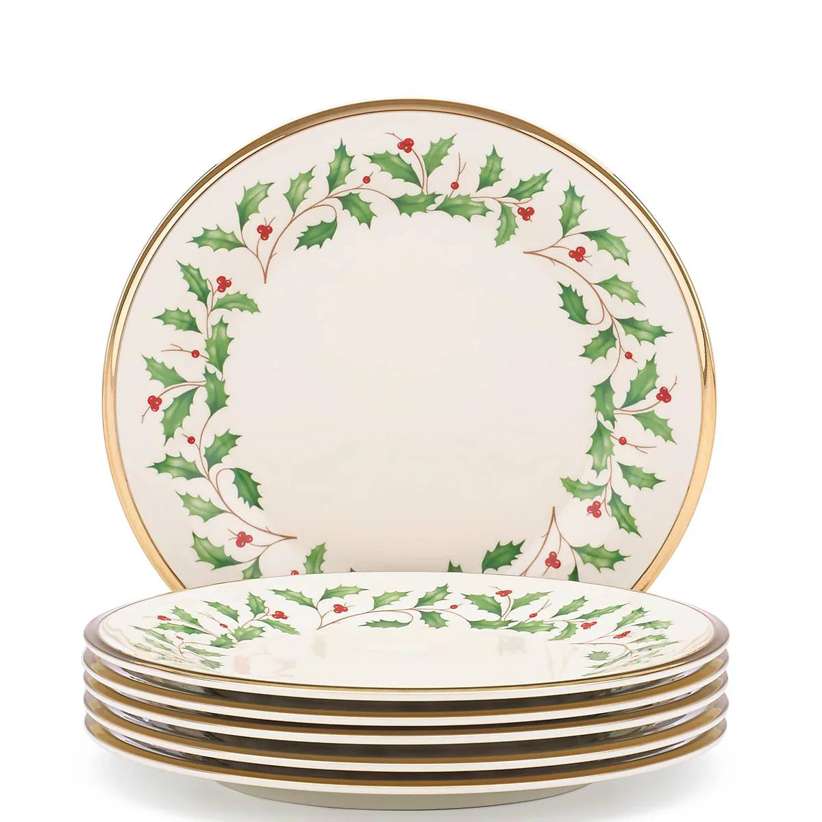 Colorful holly encircled with gold. This Holiday Salad Plate Set will make a wonderful addition to your table every holiday season! It's decorated with the cherished holly and berries Holiday motif and crafted of porcelain with a precious gold rim. The best part? Get six plates for the price of three!