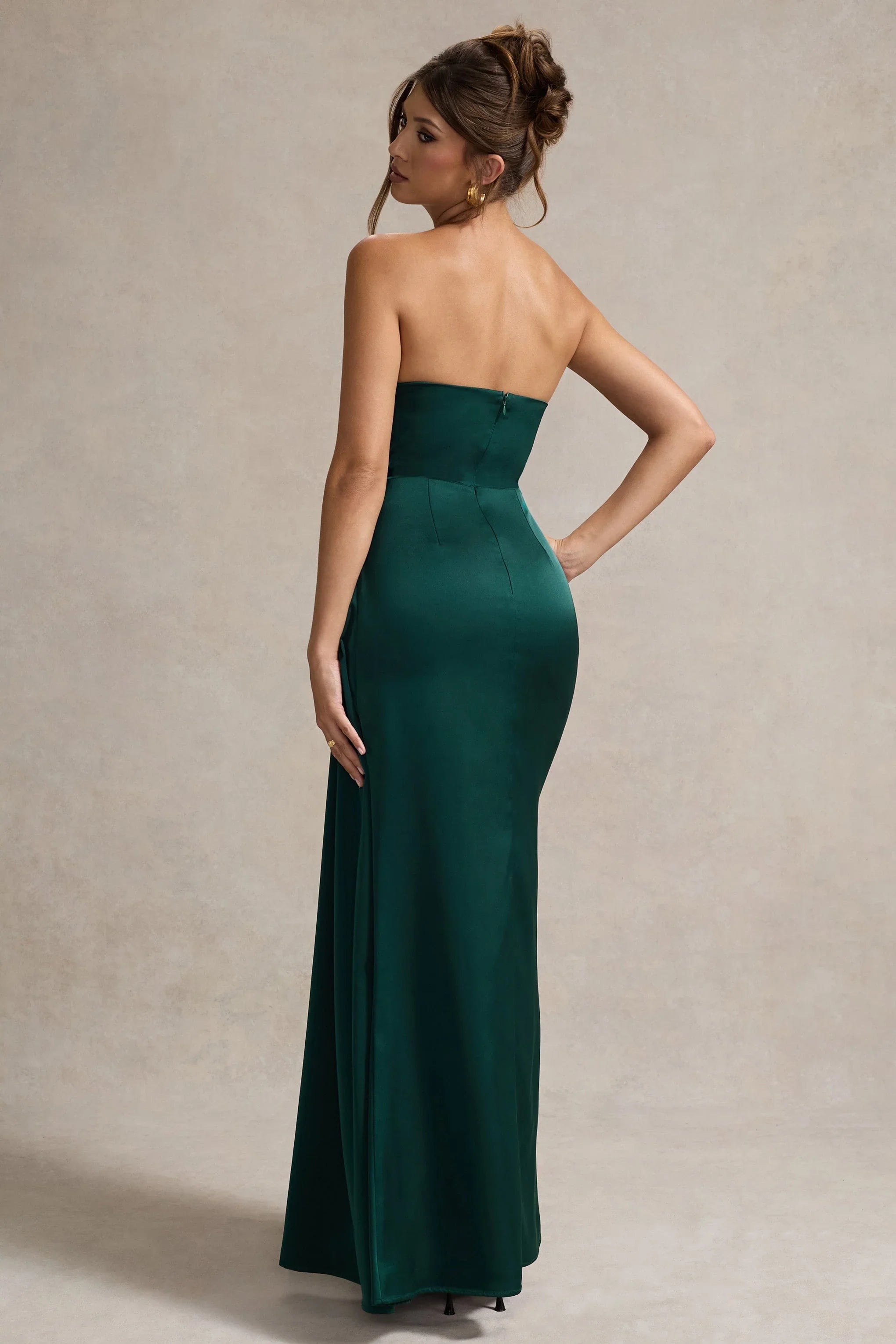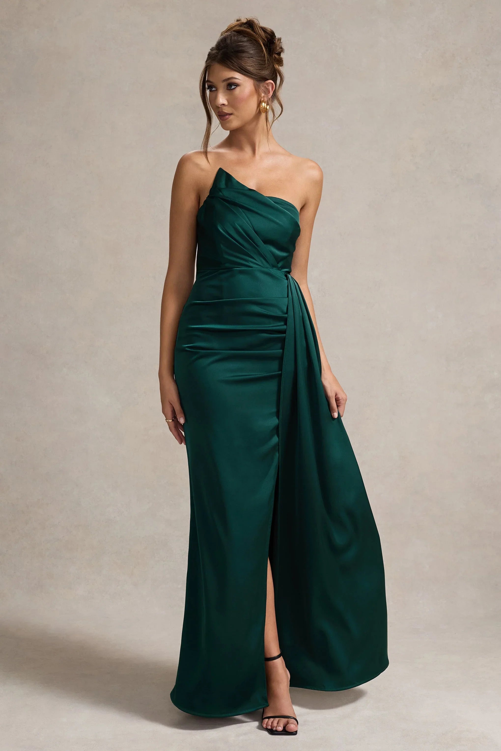 Exude glamour in our aptly-named maxi dress, Hollywood. Arriving in a sophisticated bottle green shade of our premium satin, this strapless maxi features an artful asymmetric neckline and statement draped skirt. Make an entrance in Hollywood by styling yours with a sleek bun to show it off at your next occasion.