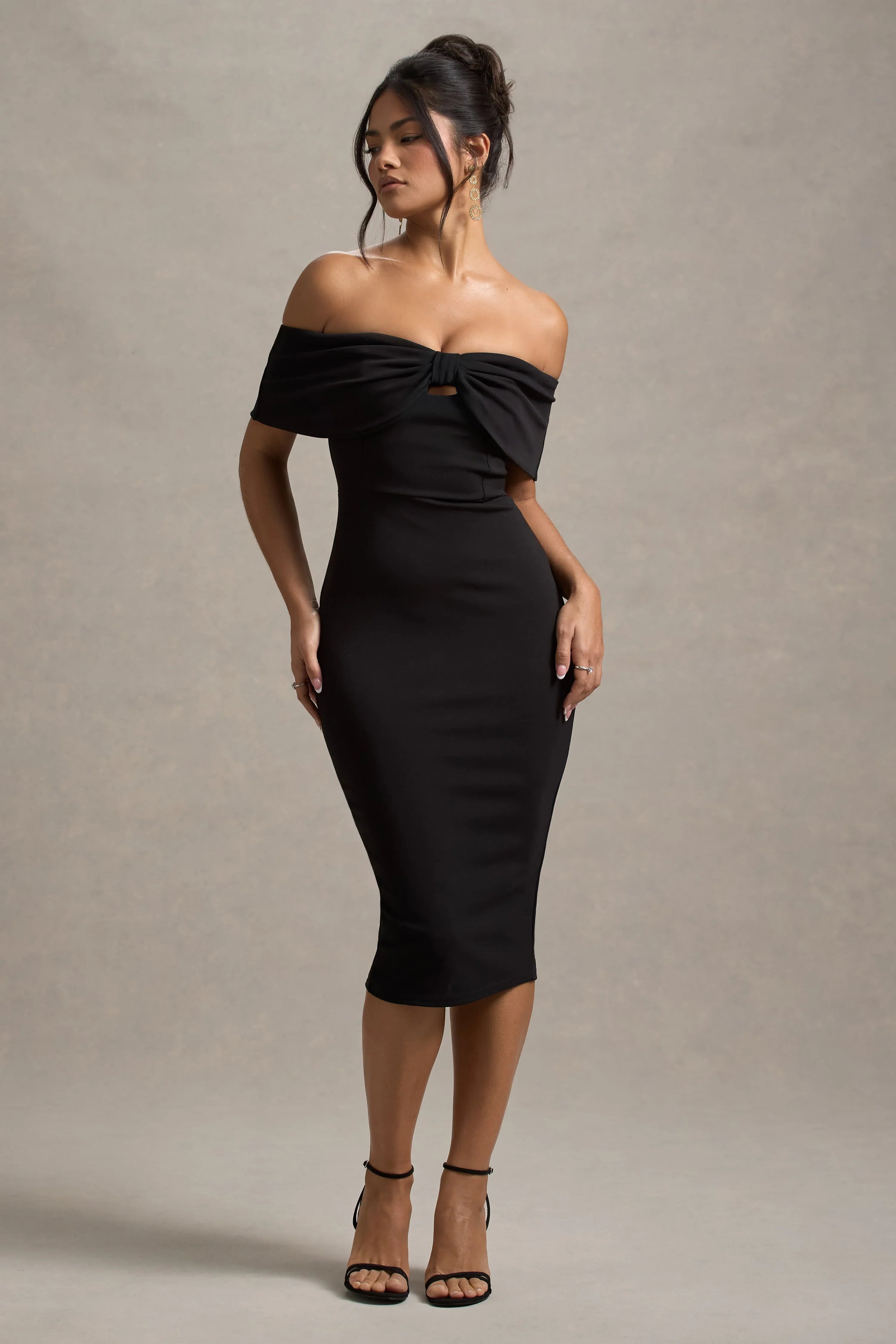 Elevate your date night wardrobe with a midi like Hope. Crafted in our signature scuba crepe to fit you like a glove, this navy dress showcases a feminine bow bardot thats highlighted by a chest cut out. A stand out staple, style yours with some gold stilettos like Crossed Wires for an elevated evening look.